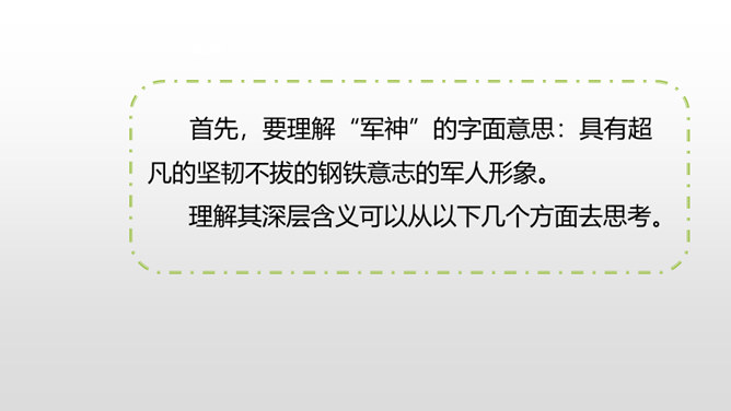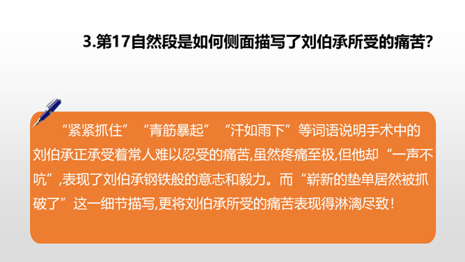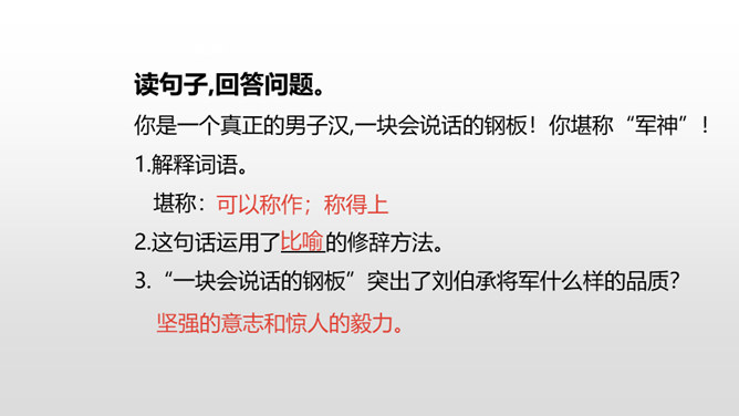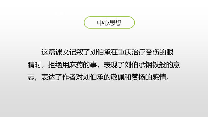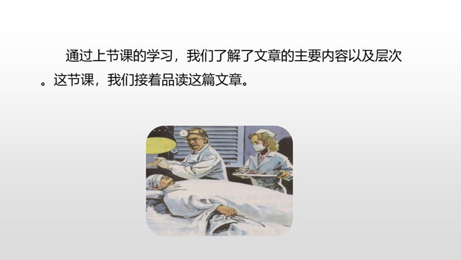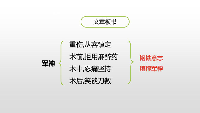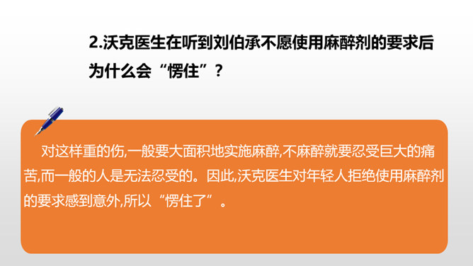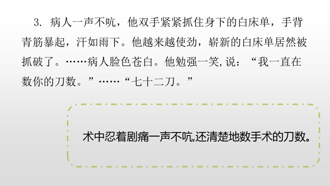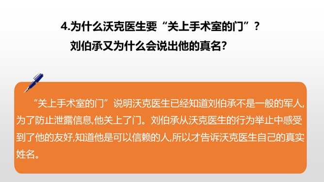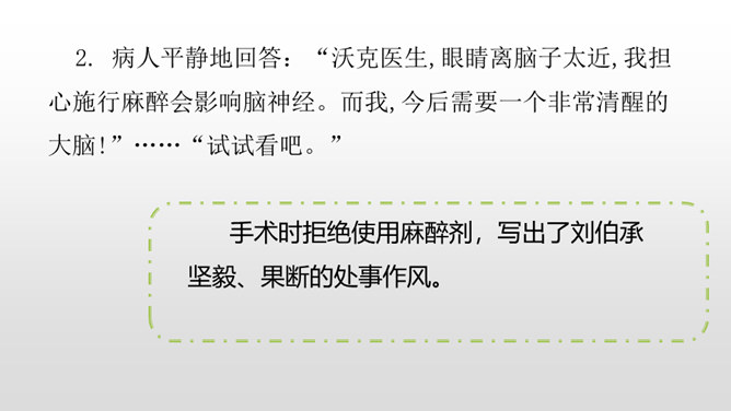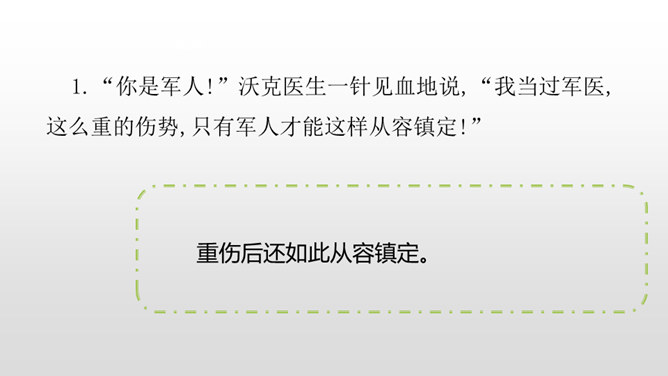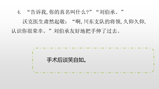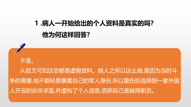 1.感受课文语言的趣味,进一步掌握通过人物语言、动作、神态来体会人物的情感态度的方法。(重点)2.了解课文内容,明确文章中心,感受刘伯承的顽强毅力,培养学生正确的价值观。(难点)病人一开始给出的个人资料是真实的吗?他为何这样回答?不是。从后文可知这些都是虚假资料。病人之所以这么做,是因为当时斗争的需要,他不能轻易暴露自己的军人身份,所以重伤后选择到一家外国人开设的诊所求医,并虚构了个人信息,谎称自己是邮局职员。所属专题:军神ppt。