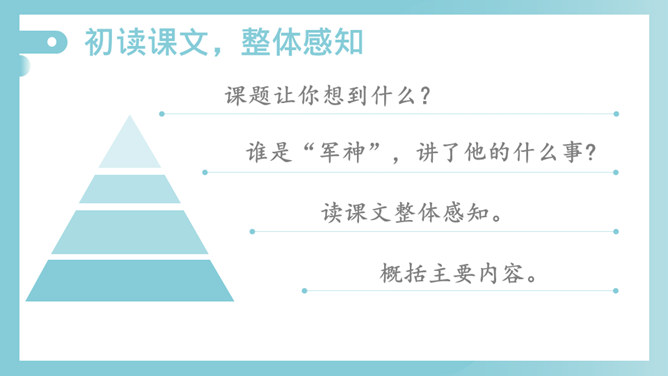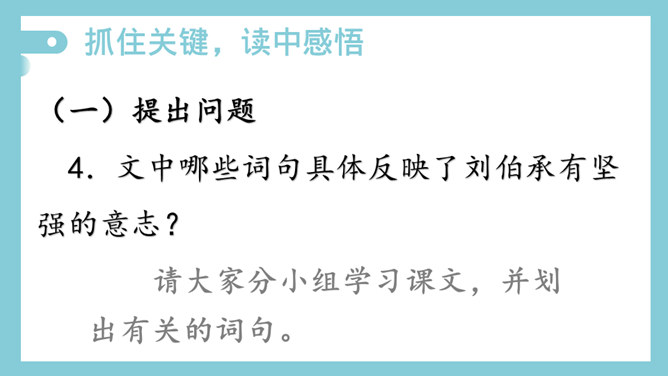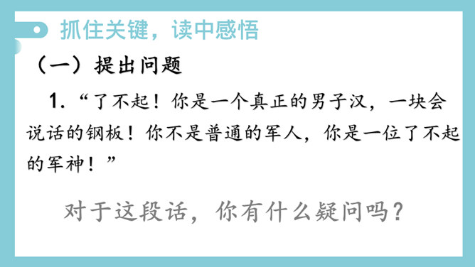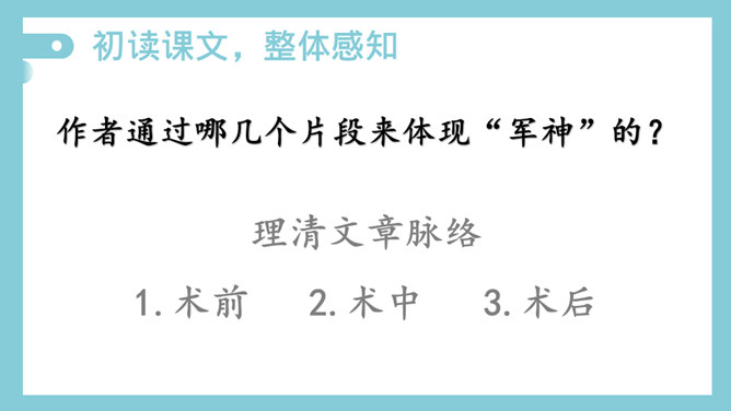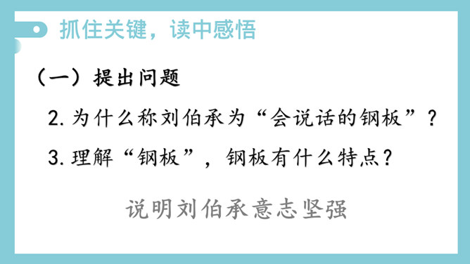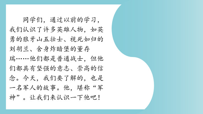 同学们,通过以前的学习,我们认识了许多英雄人物,如英勇的狼牙山五壮士、视死如归的刘胡兰、舍身炸暗堡的董存瑞……他们都是普通战士,但他们都具有坚强的意志、崇高的信念。今天,我们要了解的,也是一名军人的故事。他,堪称“军神”。让我们来认识一下他吧!作者通过哪几个片段来体现“军神”的?为什么称刘伯承为“会说话的钢板”?理解“钢板”,钢板有什么特点?文中哪些词句具体反映了刘伯承有坚强的意志?所属专题:军神ppt。
