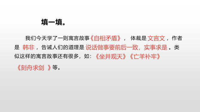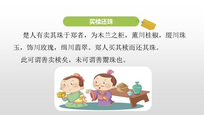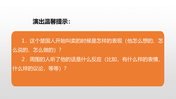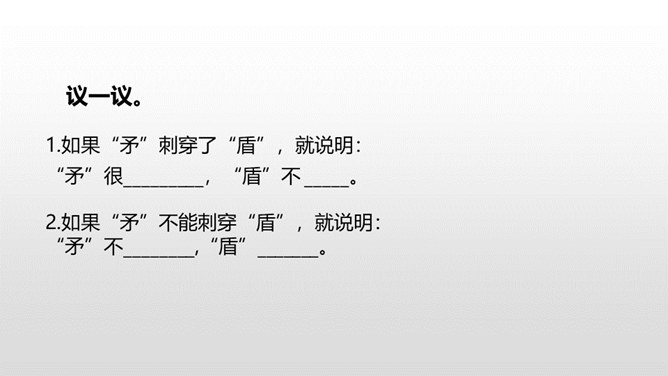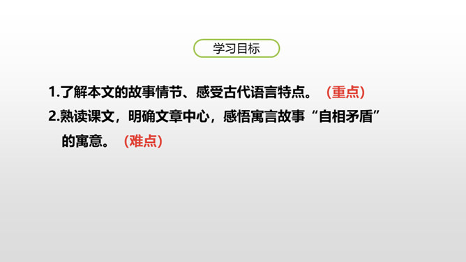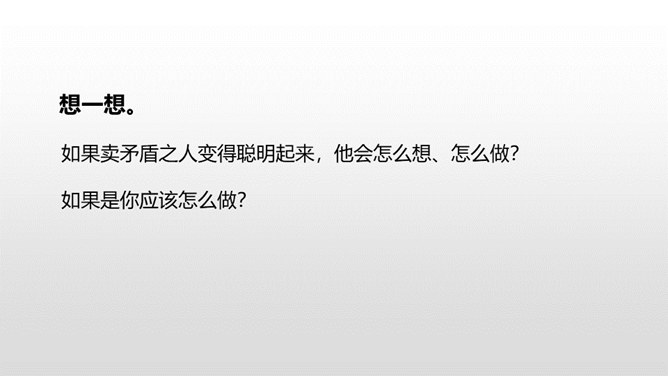 1.了解本文的故事情节、感受古代语言特点。(重点)2.熟读课文,明确文章中心,感悟寓言故事“自相矛盾”的寓意。(难点)通过上节课的学习,我们了解了文章的主要内容。这节课,我们接着来品读这篇文章。1. 这个楚国人开始叫卖的时候是怎样的表现(他怎么想的、怎么说的、怎么做的)?2. 周围的人听了他的话是什么反应(比如,有什么样的表情,什么样的议论,等等)? 3. 听了问话,那个楚国人又是什么表现?所属专题:自相矛盾ppt。