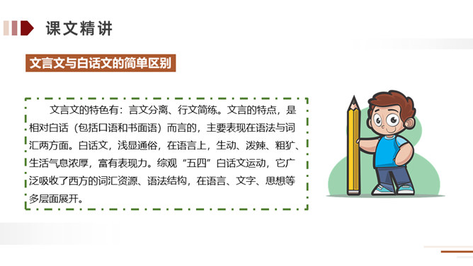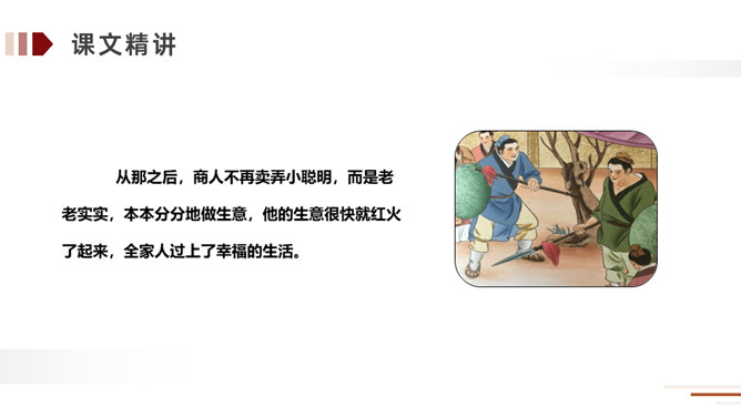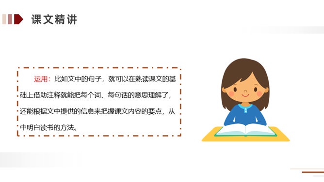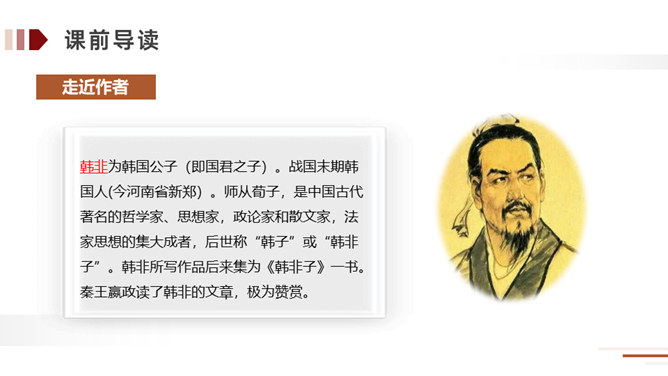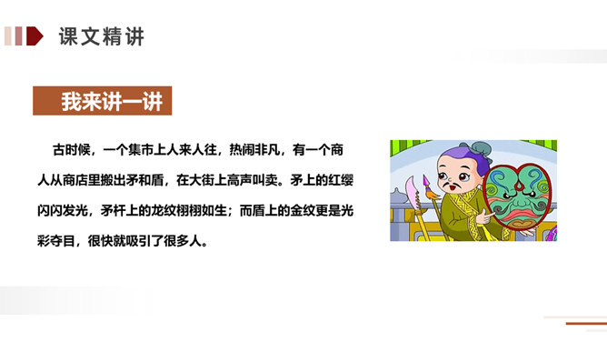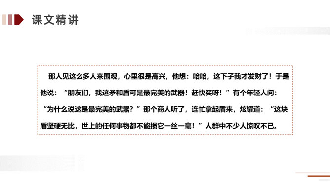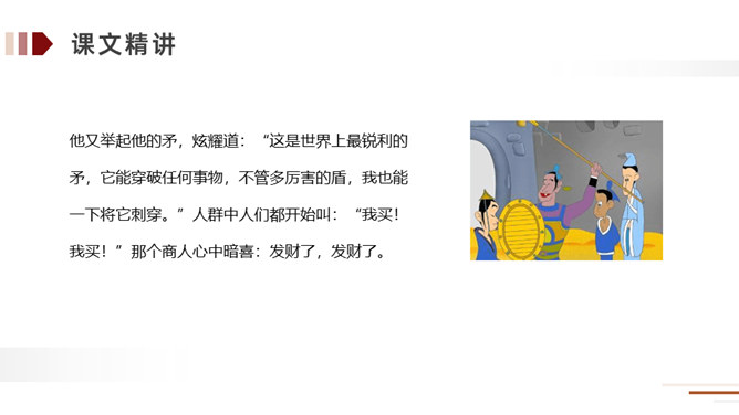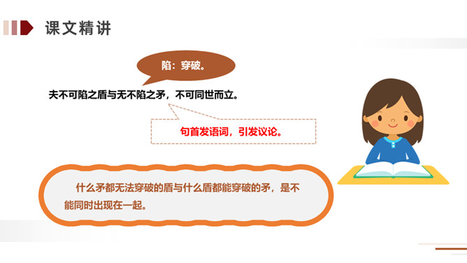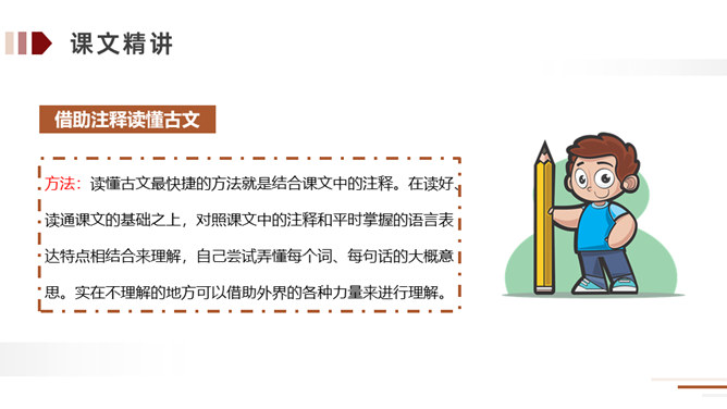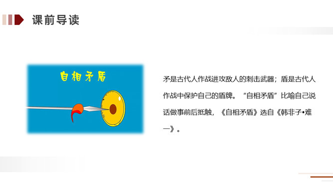 方法:读懂古文最快捷的方法就是结合课文中的注释。在读好、读通课文的基础之上,对照课文中的注释和平时掌握的语言表达特点相结合来理解,自己尝试弄懂每个词、每句话的大概意思。实在不理解的地方可以借助外界的各种力量来进行理解。运用:比如文中的句子,就可以在熟读课文的基础上借助注释就能把每个词、每句话的意思理解了,还能根据文中提供的信息来把握课文内容的要点,从中明白读书的方法。所属专题:自相矛盾ppt。
