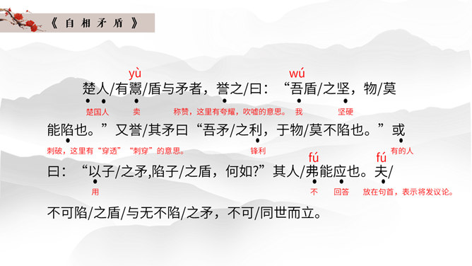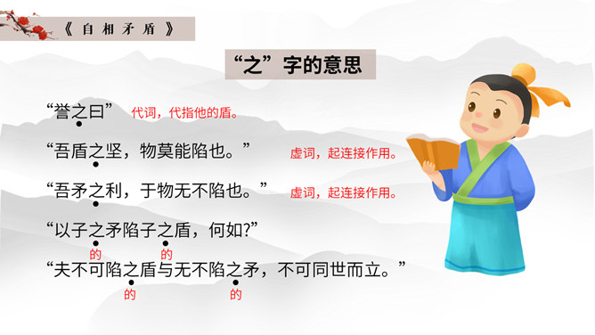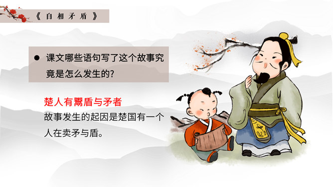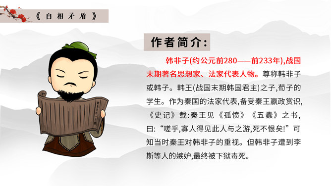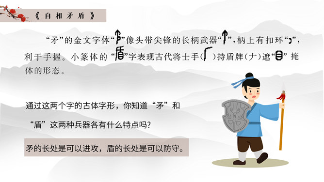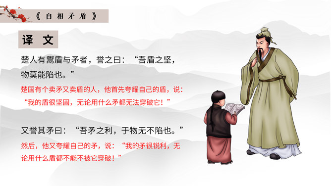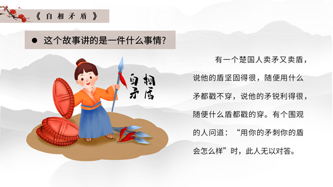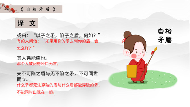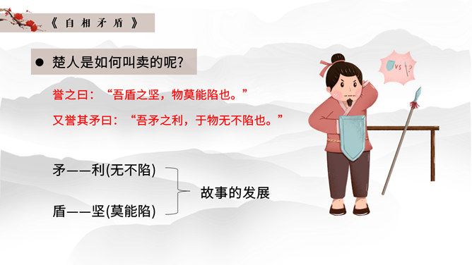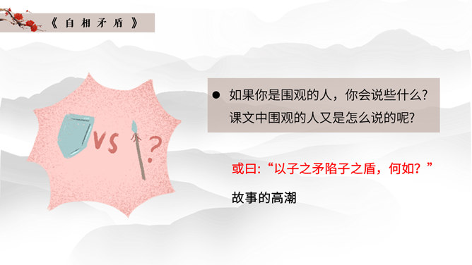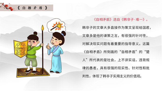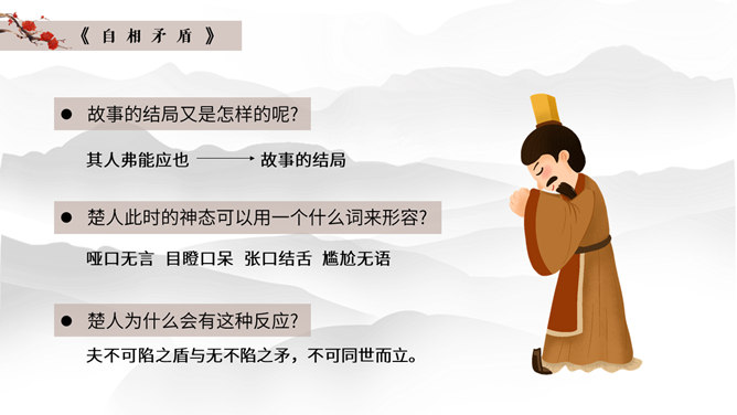 韩非子的文章大多直接作为策文呈现给国君,文章多是他的谏策之言,有很强的针对性,对解决现实问题有着重要的指导意义。这篇《自相矛盾》所刻画的“自相矛盾”的“楚人”所代表的是社会,上不讲实话,违背规律的愚者,具有很强的现实性、针对性和批判性,体现了韩非子实用主义的价值观。故事的结局又是怎样的呢? 其人弗能应也。楚人此时的神态可以用一个什么词来形容? 哑口无言 目瞪口呆 张口结舌 尴尬无语。所属专题:自相矛盾ppt。