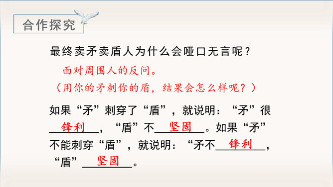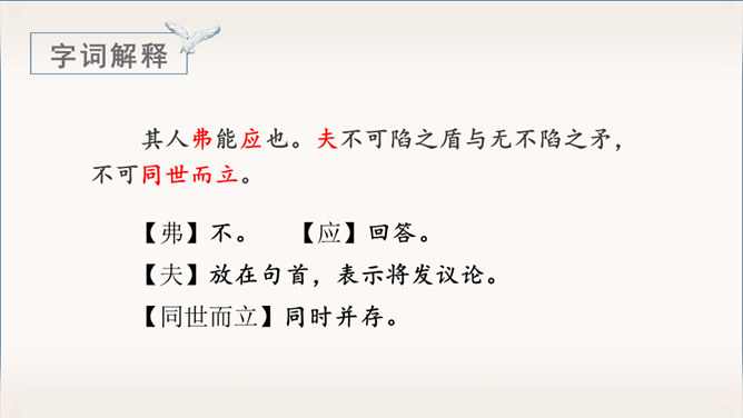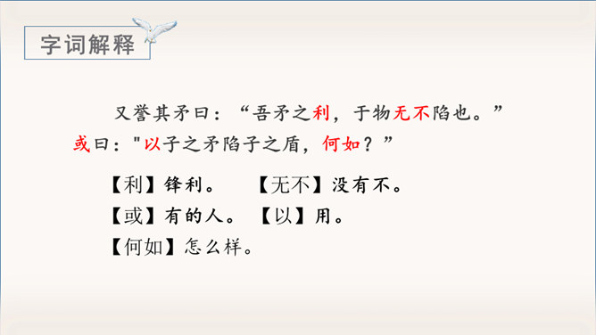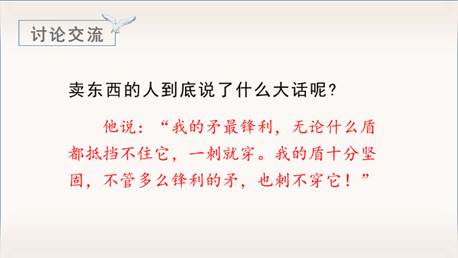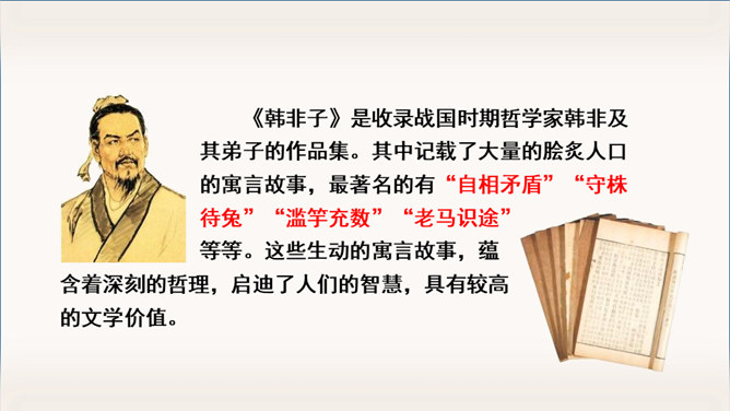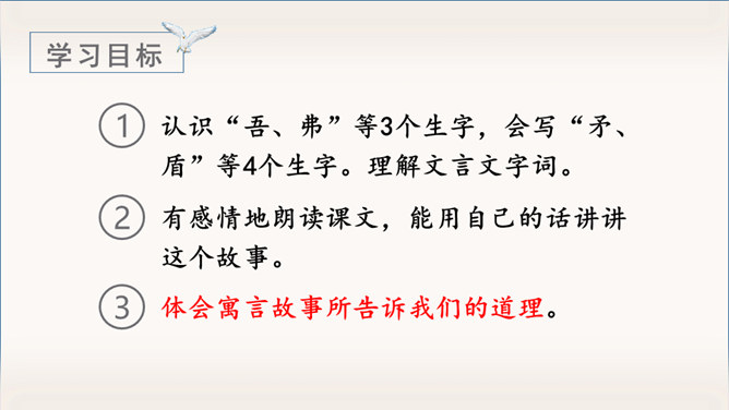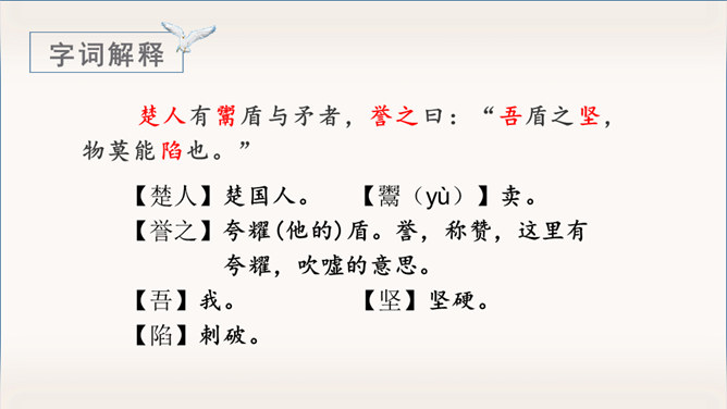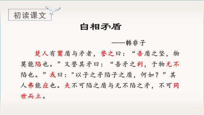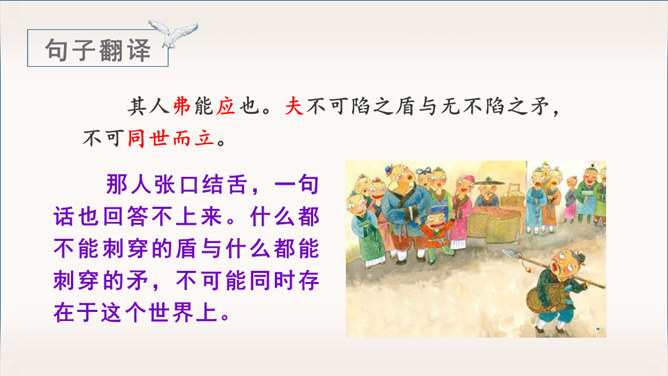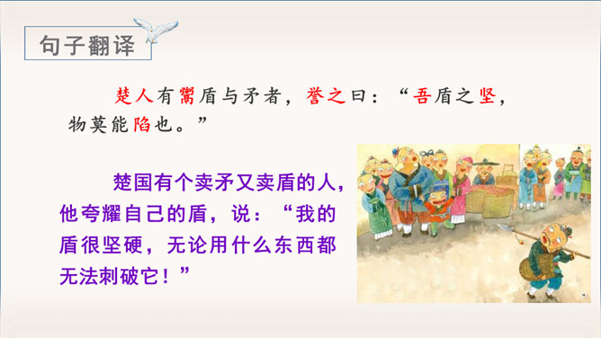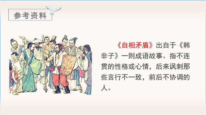 《自相矛盾》出自于《韩非子》一则成语故事。指不连贯的性格或心情,后来讽刺那些言行不一致,前后不协调的人。有感情地朗读课文,能用自己的话讲讲这个故事。认识“吾、弗”等3个生字,会写“矛、盾”等4个生字。理解文言文字词。体会寓言故事所告诉我们的道理。这个小故事告诉我们什么道理?这个故事告诉我们行事和言语一定要前后统一,讲究实事求是。(或者告诫人们说话、办事要实事求是,不要言过其实。)所属专题:自相矛盾ppt。