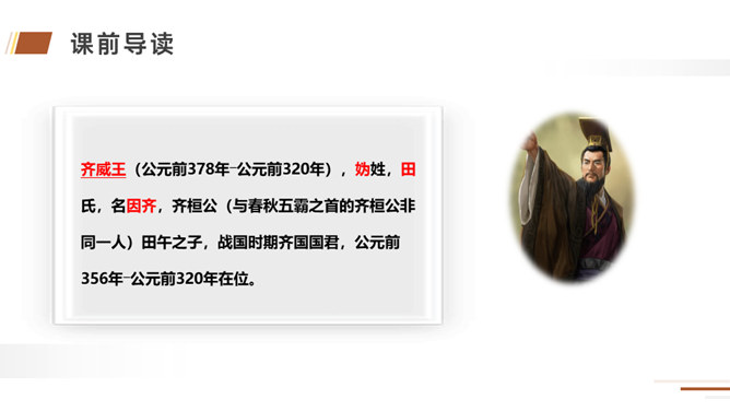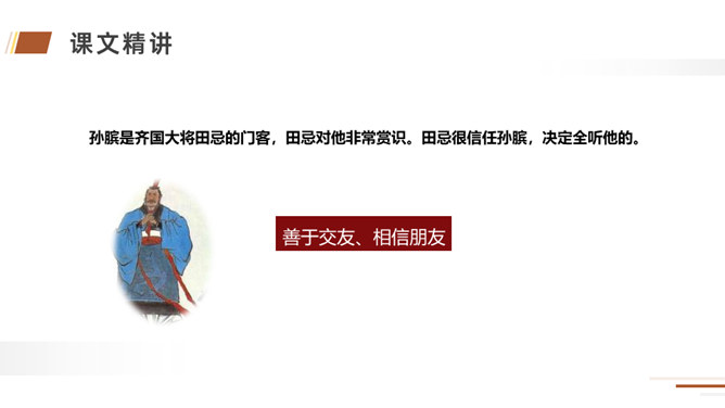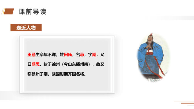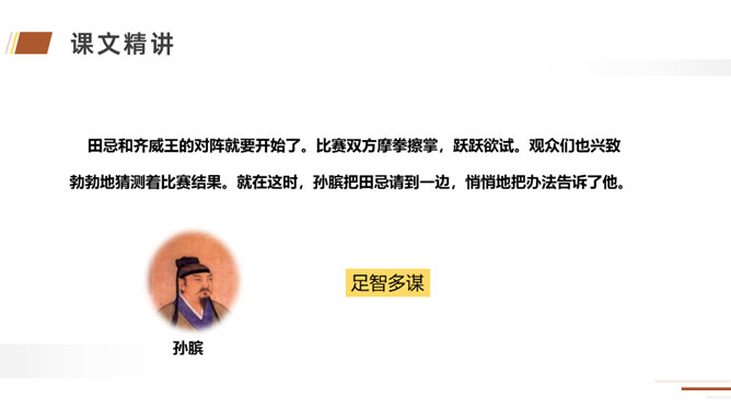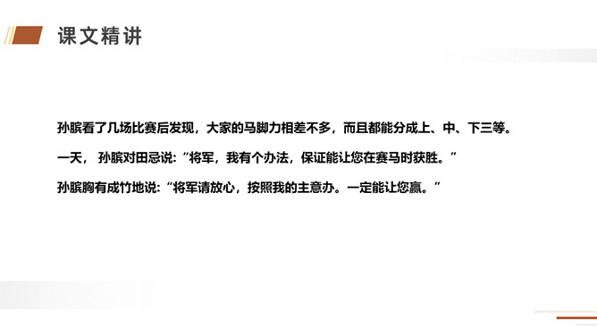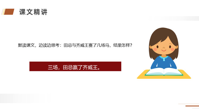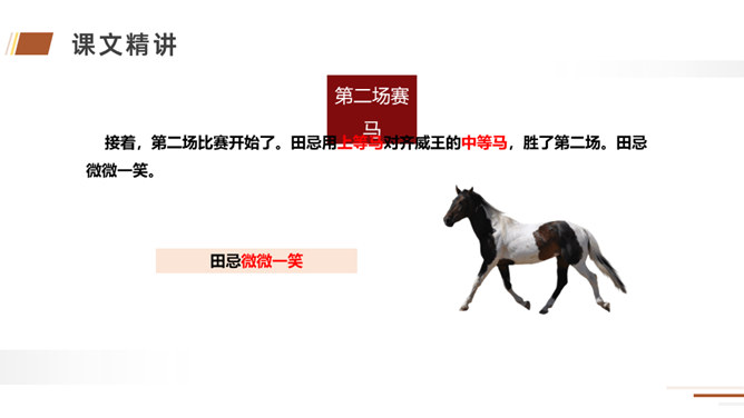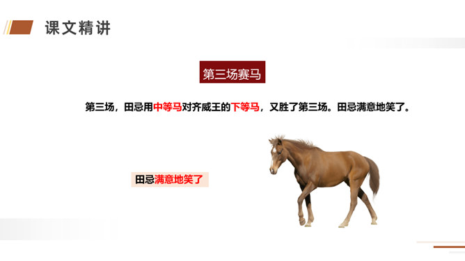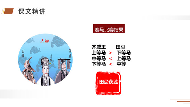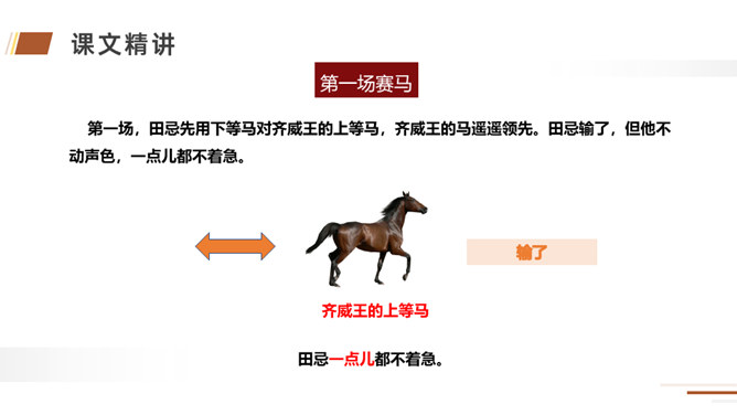默读课文,边读边思考:田忌与齐威王赛了几场马,结果怎样?三场,田忌赢了齐威王。阅读田忌和齐威王赛马的相关段落,想一想田忌取得胜的原因是什么?孙膑为什么能想出这样的好办法?马的脚力相差不多,而且都能分成上、中、下三等,只需要调换一下马的出场顺序,就可以转败为胜,这就叫做想办法灵活应变。 通过这个故事使我们明白一个道理:调查研究、分析事物,积极开动脑筋,运用智谋是事情成功的关键。所属专题:田忌赛马ppt。