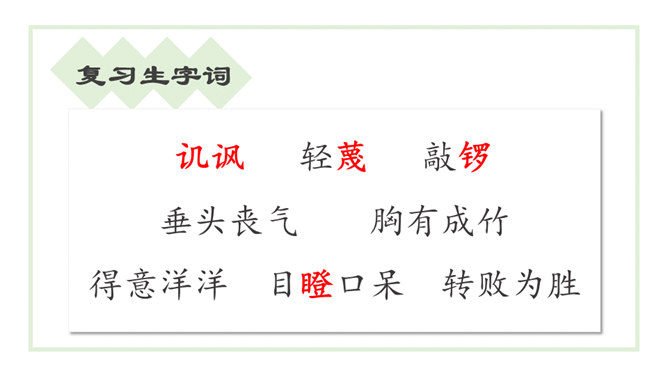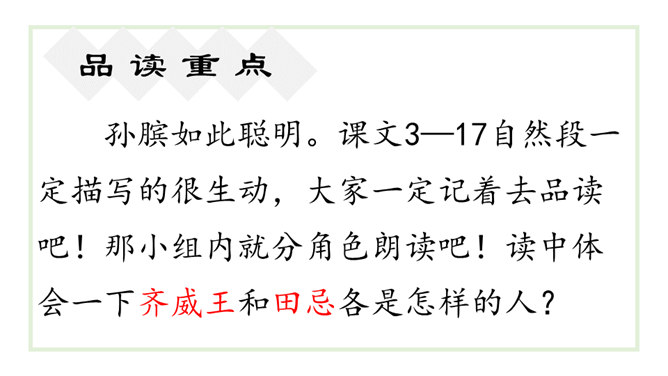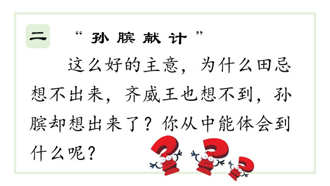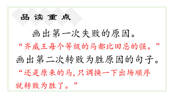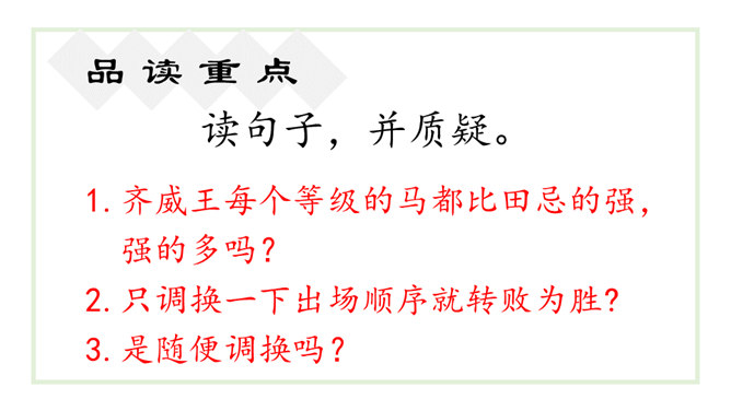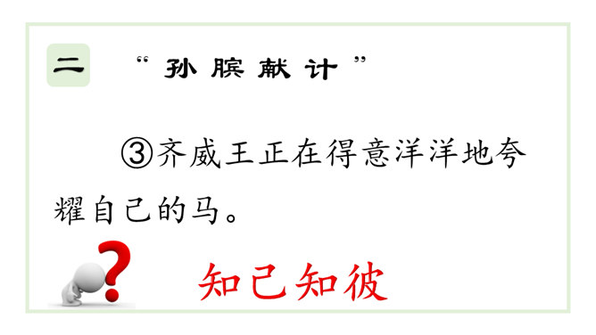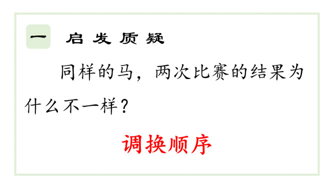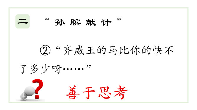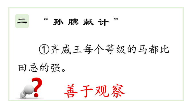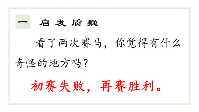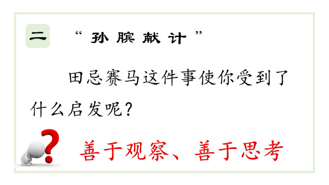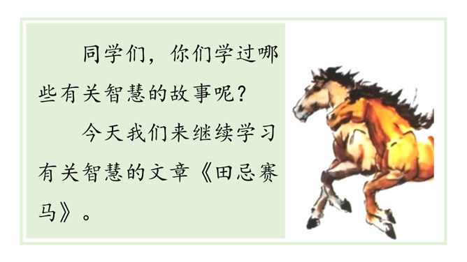 同学们,你们学过哪些有关智慧的故事呢?今天我们来继续学习有关智慧的文章。看了两次赛马,你觉得有什么奇怪的地方吗?同样的马,两次比赛的结果为什么不一样?这个计策谁想出来的?这么好的主意,为什么田忌想不出来,齐威王也想不到,孙膑却想出来了?你从中能体会到什么呢?为什么孙膑能想出这个好主意呢?在文中找一找有关句子,用笔划出来,想一想。 画出第一次失败的原因。齐威王每个等级的马都比田忌的强,强的多吗?所属专题:田忌赛马ppt。