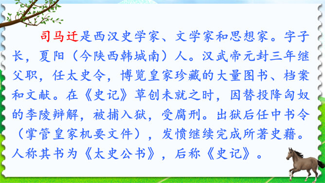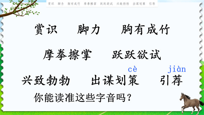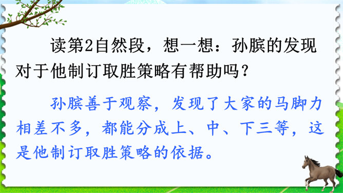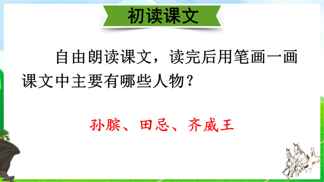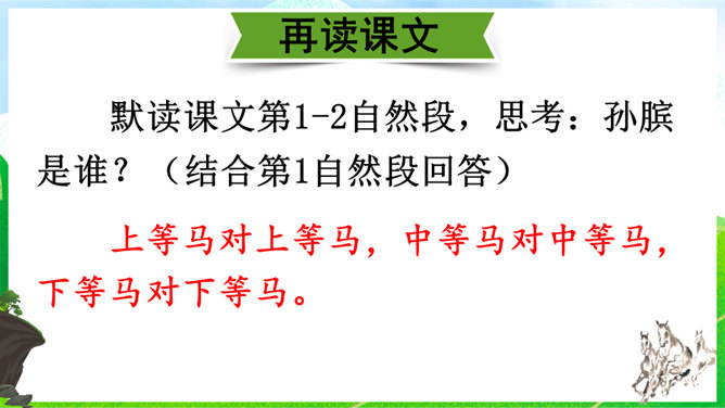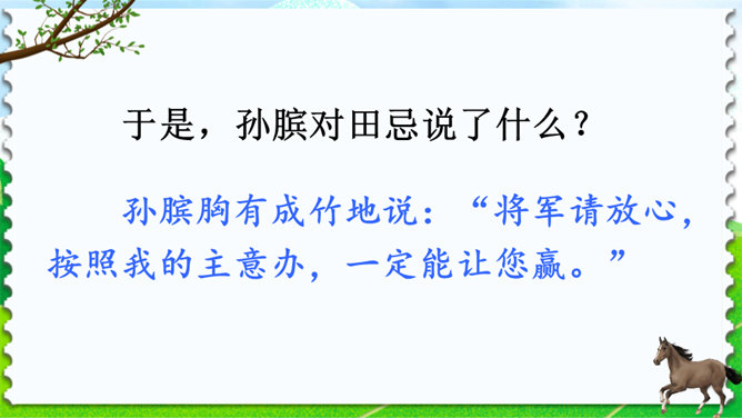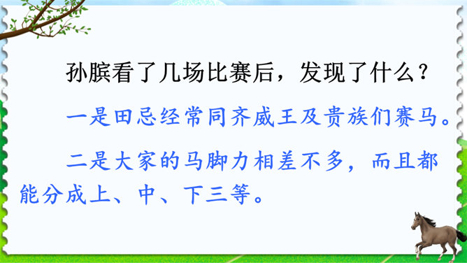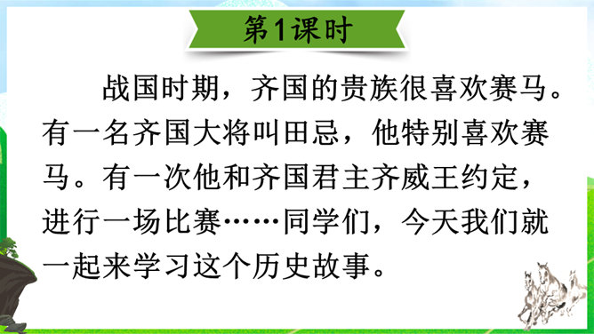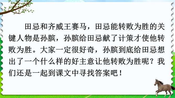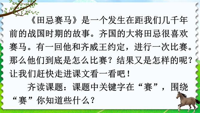 战国时期,齐国的贵族很喜欢赛马。有一名齐国大将叫田忌,他特别喜欢赛马。有一次他和齐国君主齐威王约定,进行一场比赛……同学们,今天我们就一起来学习这个历史故事。读了课题,你想知道什么?谁与谁赛马?怎么赛?结果如何?带着这些问题,我们一起到课文中寻找答案。一个发生在距我们几千年前的战国时期的故事。齐国的大将田忌很喜欢赛马。有一回他和齐威王约定,进行一次比赛。那么他们到底是怎么比赛?结果又是怎样的呢?让我们赶快走进课文看一看吧!齐读课题:课题中关键字在“赛”,围绕“赛”你知道些什么?所属专题:田忌赛马ppt。