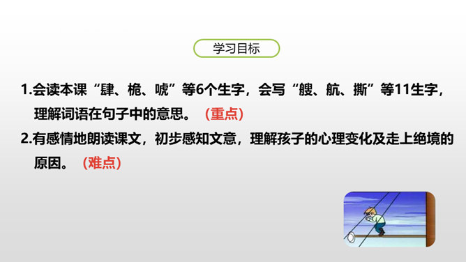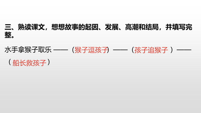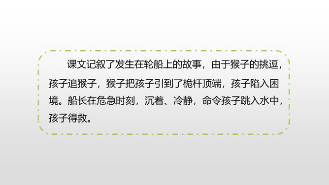 会读本课“肆、桅、唬”等6个生字,会写“艘、航、撕”等11生字,理解词语在句子中的意思。有感情地朗读课文,初步感知文意,理解孩子的心理变化及走上绝境的原因。同学们,你们知道咱们国家有哪些跳水明星不?认真读,圈出本课新词语,再思考:课文主要向我们介绍了什么?课文记叙了发生在轮船上的故事,由于猴子的挑逗,孩子追猴子,猴子把孩子引到了桅杆顶端,孩子陷入困境。船长在危急时刻,沉着、冷静,命令孩子跳入水中,孩子得救。所属专题:跳水ppt。