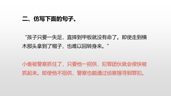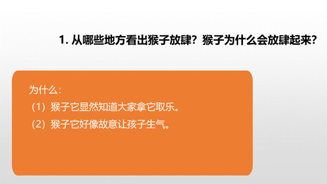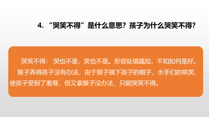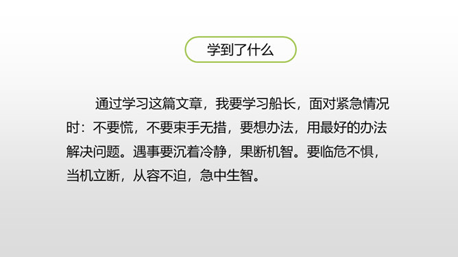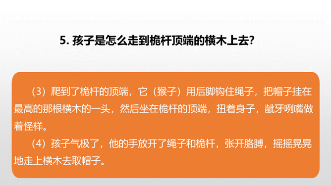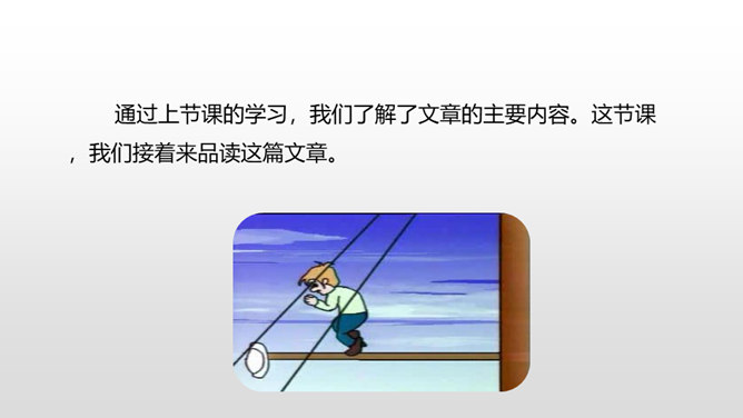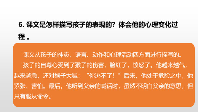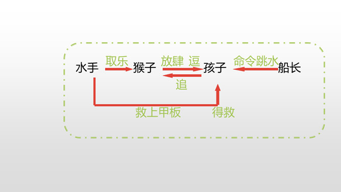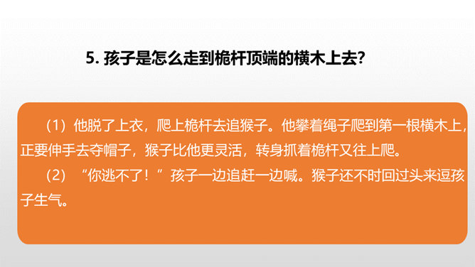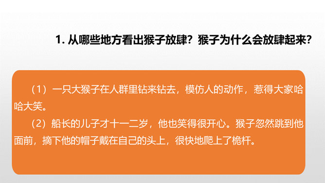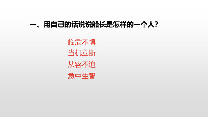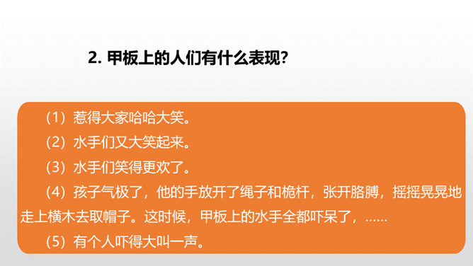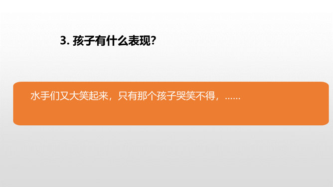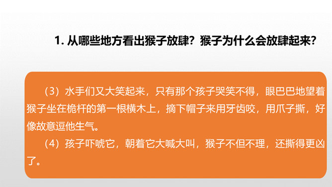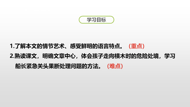 1.了解本文的情节艺术、感受鲜明的语言特点。(重点)2.熟读课文,明确文章中心,体会孩子走向横木时的危险处境,学习船长紧急关头果断处理问题的方法。(难点)通过上节课的学习,我们了解了文章的主要内容。这节课,我们接着来品读这篇文章。从哪些地方看出猴子放肆?猴子为什么会放肆起来?甲板上的人们有什么表现?“哭笑不得”是什么意思?孩子为什么哭笑不得?孩子是怎么走到桅杆顶端的横木上去?所属专题:跳水ppt。
