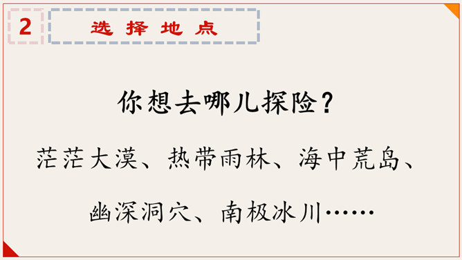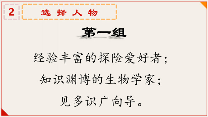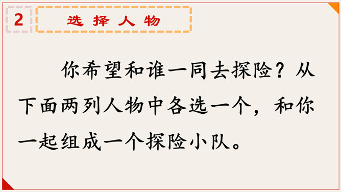 你希望和谁一同去探险?从下面两列人物中各选一个,和你一起组成一个探险小队。第一组:经验丰富的探险爱好者;知识渊博的生物学家;见多识广向导。第二组:好奇心强,性格活泼的同学;胆子大但行事鲁莽的表哥;心细而胆小的表姐。分析每组中人物的优缺点,结合自身特点及喜好,从每组中各选择一个人物组成探险小队。你想去哪儿探险?茫茫大漠、热带雨林、海中荒岛、幽深洞穴、南极冰川……
