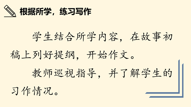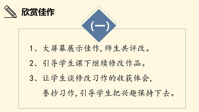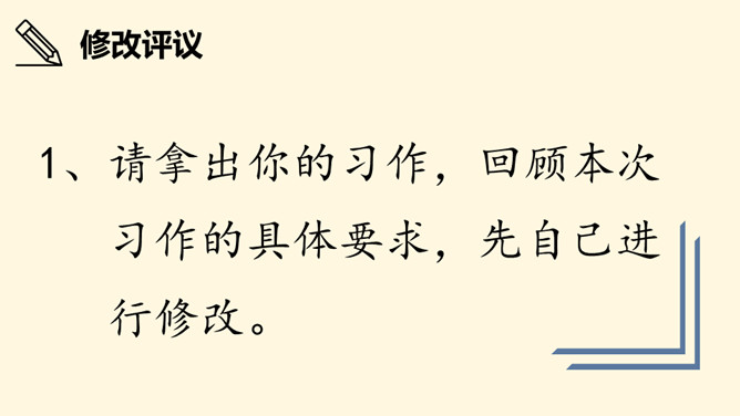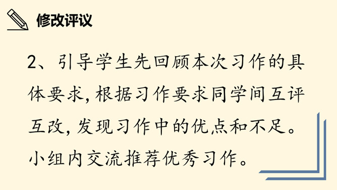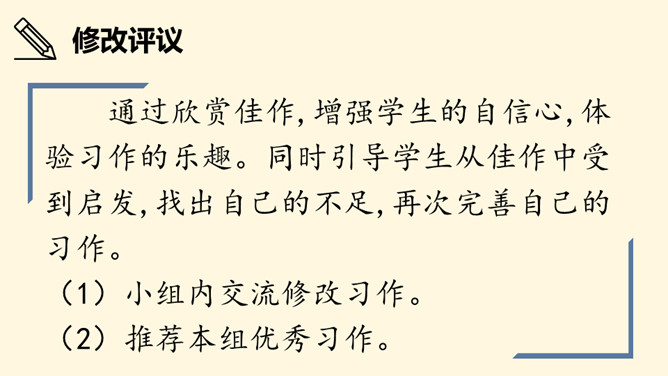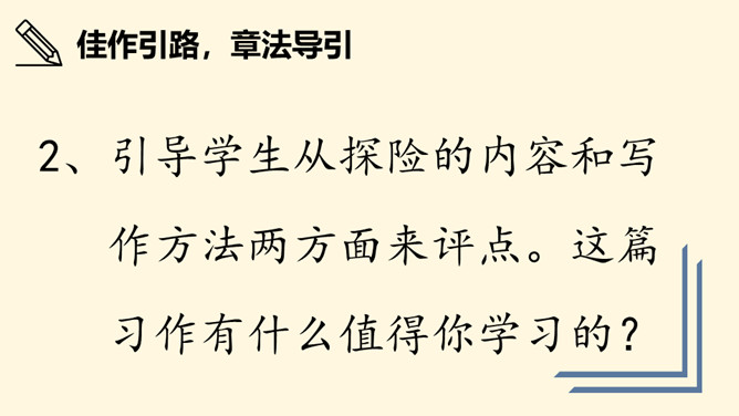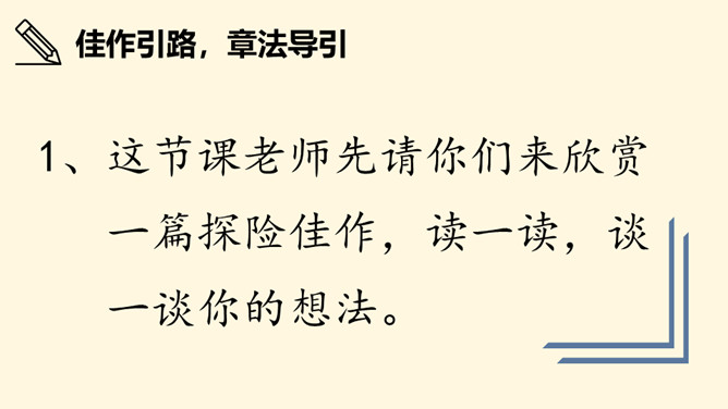 1、这节课老师先请你们来欣赏一篇探险佳作,读一读,谈一谈你的想法。2、引导学生从探险的内容和写作方法两方面来评点。这篇习作有什么值得你学习的?学生结合所学内容,在故事初稿上列好提纲,开始作文。教师巡视指导,并了解学生的习作情况。请拿出你的习作,回顾本次习作的具体要求,先自己进行修改。修改步骤(1)修改错别字。(2)修改不通顺的句子。(3)修改啰嗦的段落。