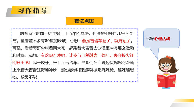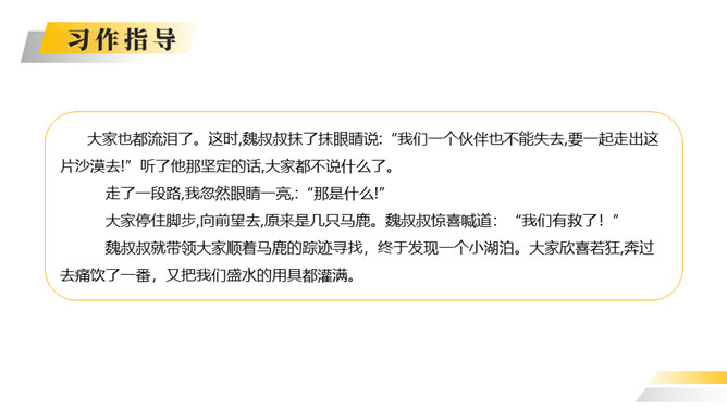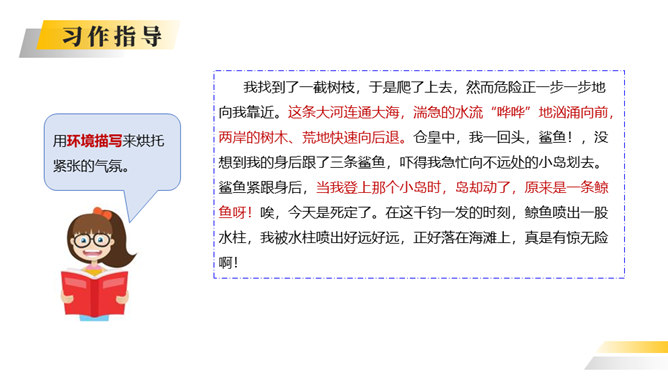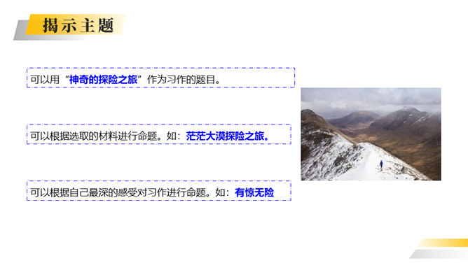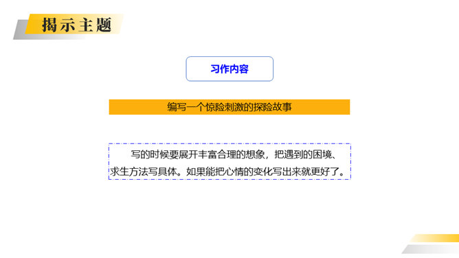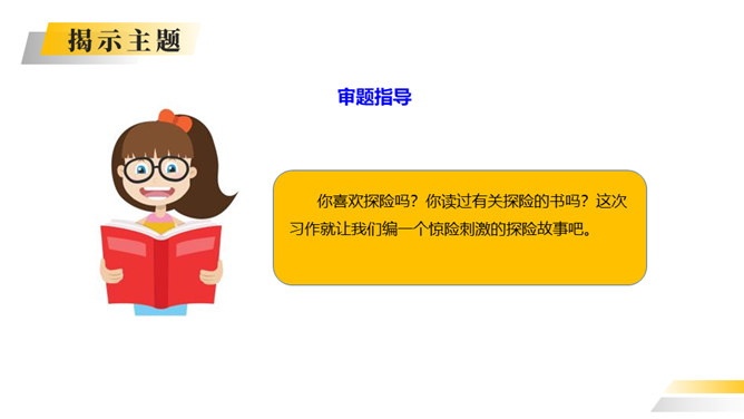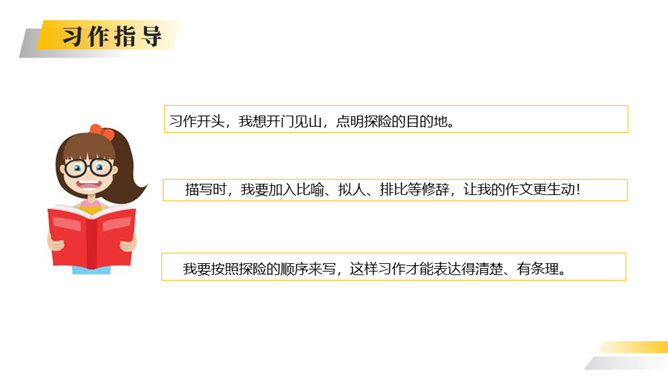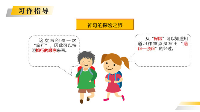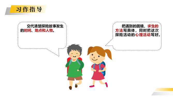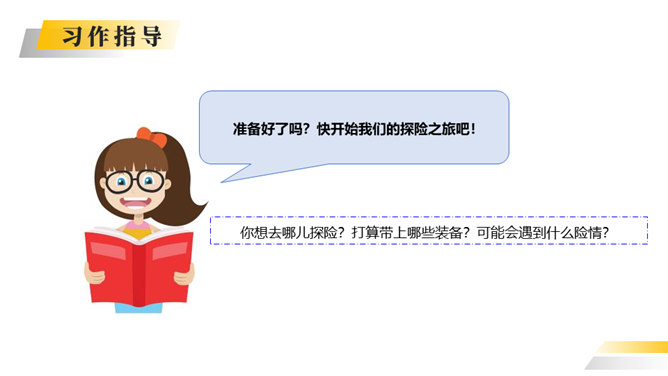 你喜欢探险吗?你读过有关探险的书吗?这次习作就让我们编一个惊险刺激的探险故事吧。这次写的是一次“旅行”,因此可以按照旅行的顺序来写。从“探险”可以知道知道习作重点是写出“遇险—脱险”的经过。可以用“神奇的探险之旅”作为习作的题目。可以根据选取的材料进行命题。如:茫茫大漠探险之旅。可以根据自己最深的感受对习作进行命题。如:有惊无险。写的时候要展开丰富合理的想象,把遇到的困境、求生方法写具体。如果能把心情的变化写出来就更好了。
