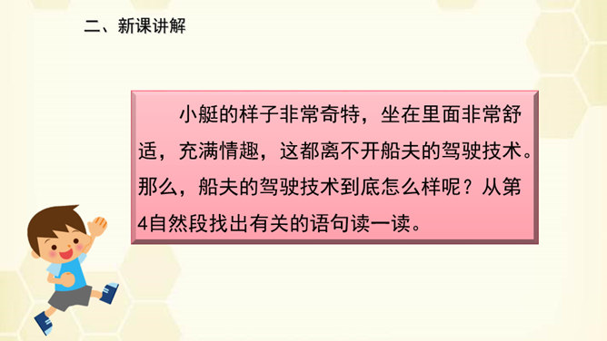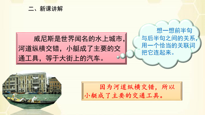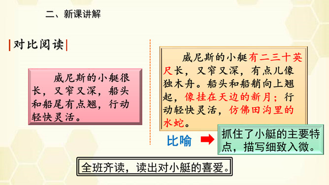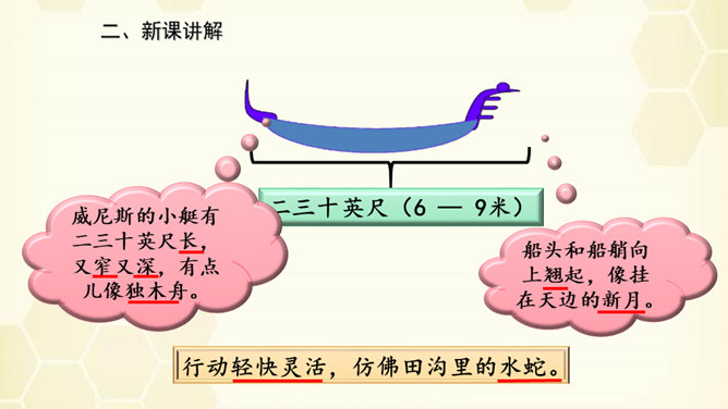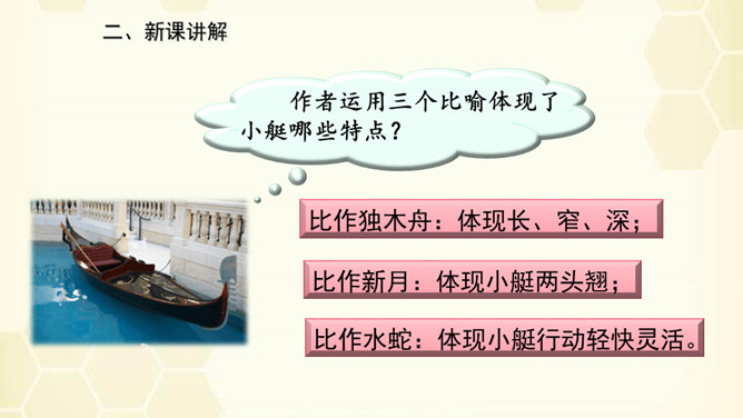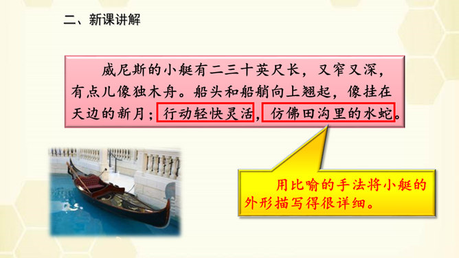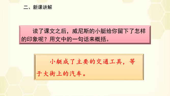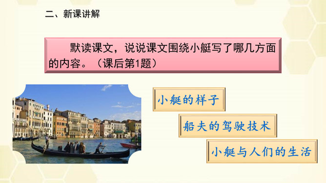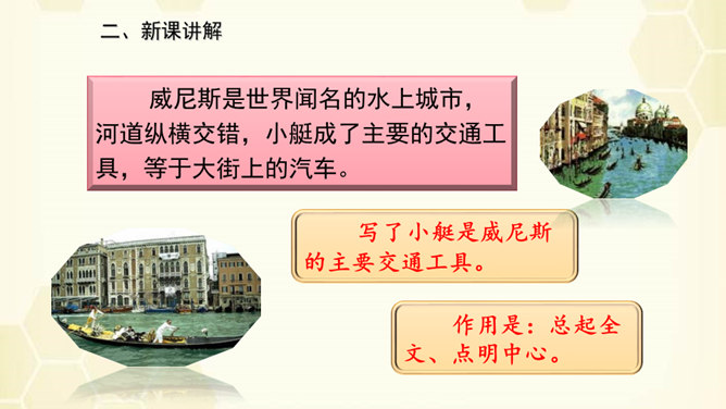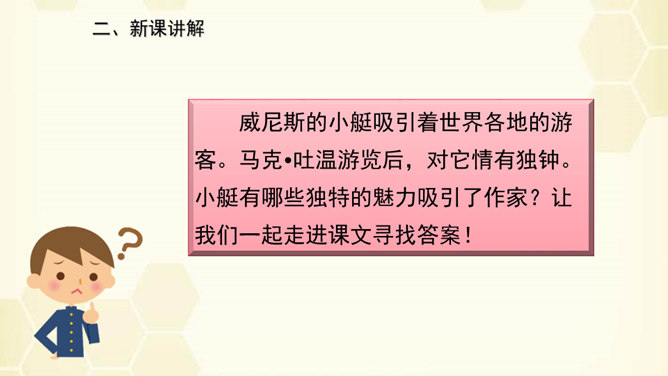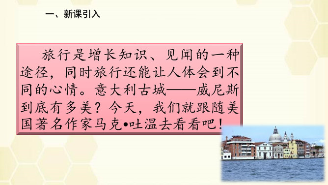 旅行是增长知识、见闻的一种途径,同时旅行还能让人体会到不同的心情。意大利古城——威尼斯到底有多美?今天,我们就跟随美国著名作家马克•吐温去看看吧!默读课文,说说课文围绕小艇写了哪几方面的内容。读了课文之后,威尼斯的小艇给你留下了怎样的印象呢?用文中的一句话来概括。威尼斯的小艇吸引着世界各地的游客。马克•吐温游览后,对它情有独钟。小艇有哪些独特的魅力吸引了作家?让我们一起走进课文寻找答案!所属专题:威尼斯的小艇ppt。