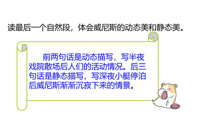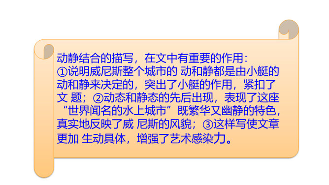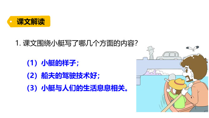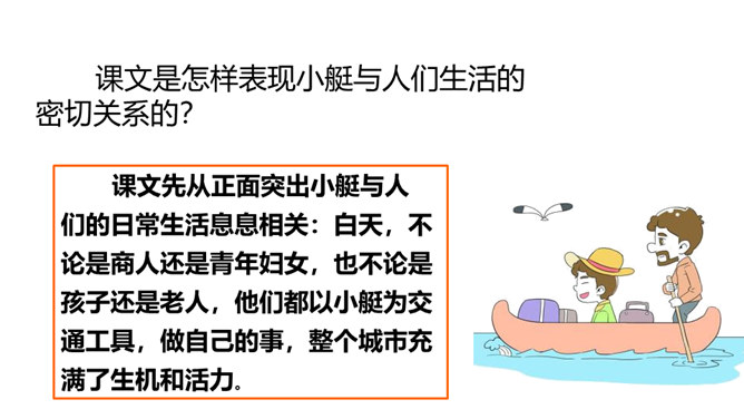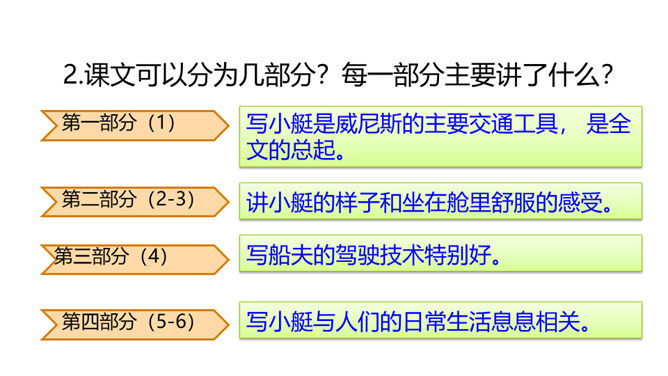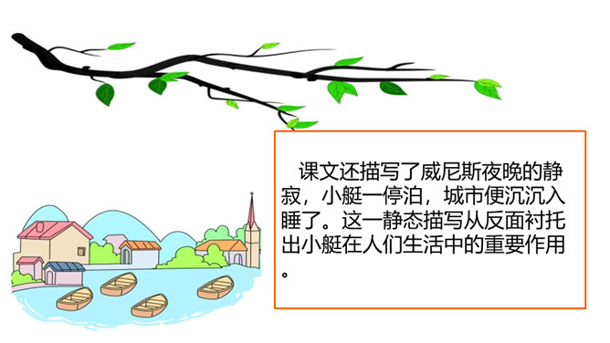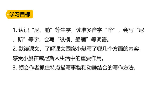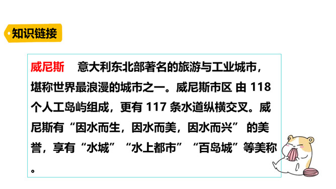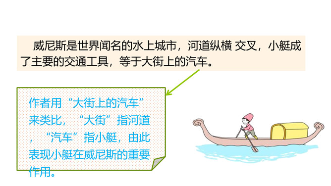 威尼斯是意大利的一座古城,周围被海洋环绕,由 118 个岛屿组成,有“水城”“百岛城”之称。威尼斯城热闹非凡,但城内没有汽车和自行车,小艇就是“公共汽车”。快走进课文,去感受一下吧。1. 认识“尼、艄”等生字,读准多音字“哗”,会写“尼、斯”等字,会写“纵横、船艄”等词语。2. 默读课文,了解课文围绕小艇写了哪几个方面的内容,感受小艇在威尼斯人生活中的重要作用。3. 领会作者抓住特点描写事物和动静结合的写作方法。所属专题:威尼斯的小艇ppt。