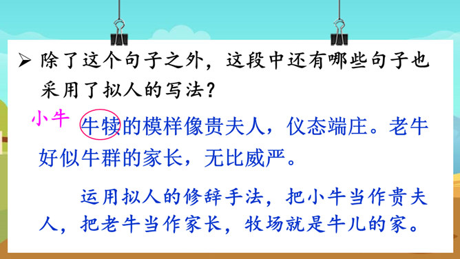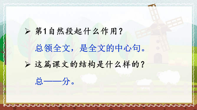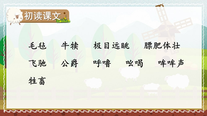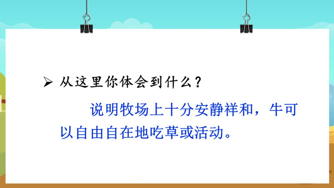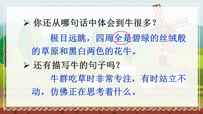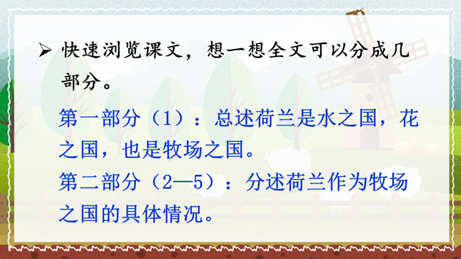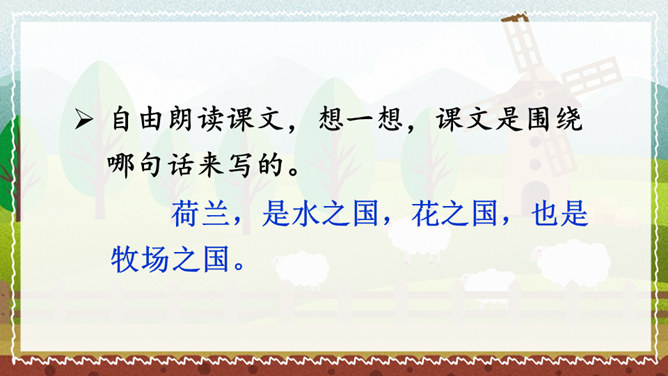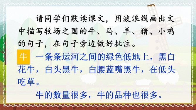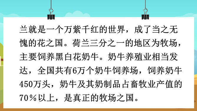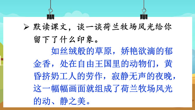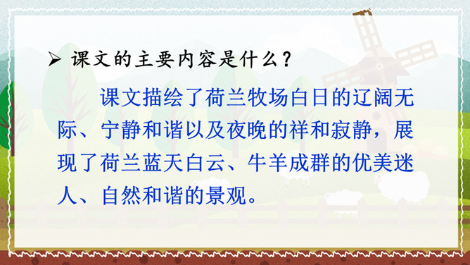 课文的主要内容是什么?课文描绘了荷兰牧场白日的辽阔无际、宁静和谐以及夜晚的祥和寂静,展现了荷兰蓝天白云、牛羊成群的优美迷人、自然和谐的景观。默读课文,谈一谈荷兰牧场风光给你留下了什么印象。如丝绒般的草原,娇艳欲滴的郁金香,处在自由王国里的动物们,黄昏挤奶工人的劳作,寂静无声的夜晚,这一幅幅画面就组成了荷兰牧场风光的动、静之美。谁能说说牧场是什么意思?放牧牲畜的大片草地。所属专题:牧场之国ppt。