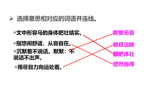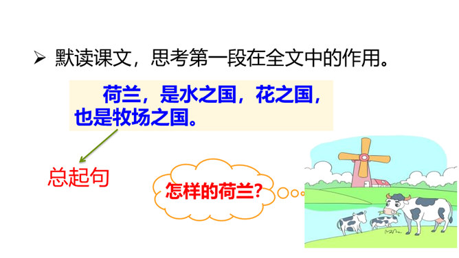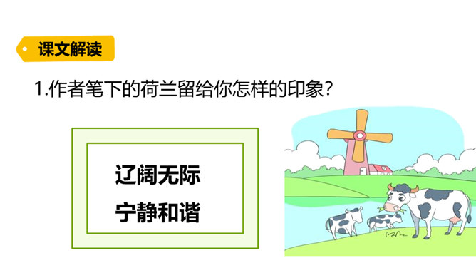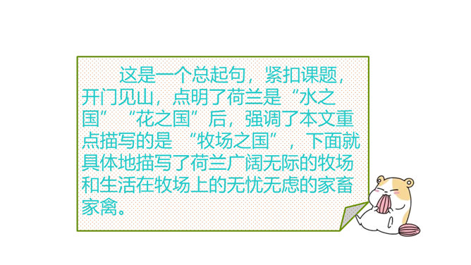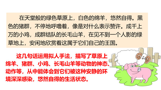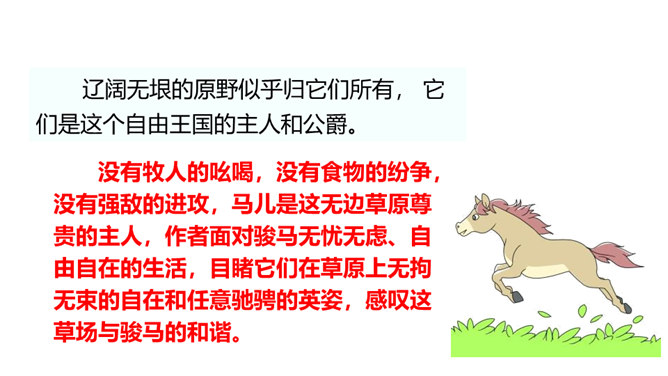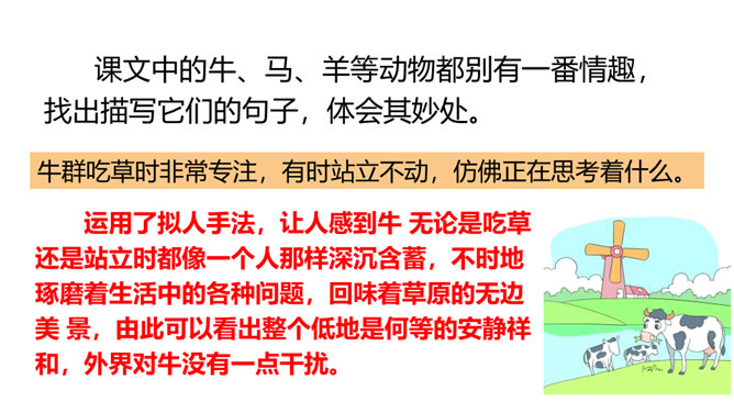 课文中的牛、马、羊等动物都别有一番情趣,找出描写它们的句子,体会其妙处。运用了拟人手法,让人感到牛 无论是吃草还是站立时都像一个人那样深沉含蓄,不时地琢磨着生活中的各种问题,回味着草原的无边美 景,由此可以看出整个低地是何等的安静祥和,外界对牛没有一点干扰。没有牧人的吆喝,没有食物的纷争,没有强敌的进攻,马儿是这无边草原尊贵的主人,作者面对骏马无忧无虑、自由自在的生活,目睹它们在草原上无拘无束的自在和任意驰骋的英姿,感叹这草场与骏马的和谐。所属专题:牧场之国ppt。