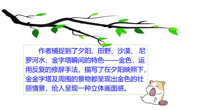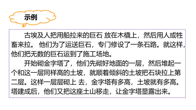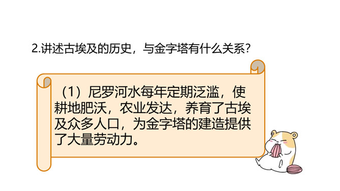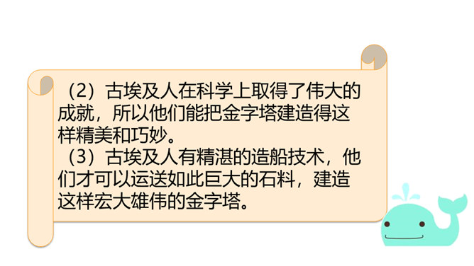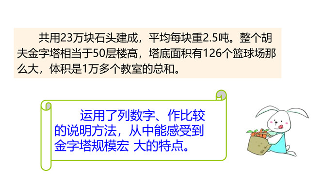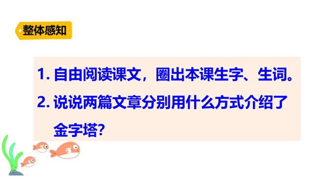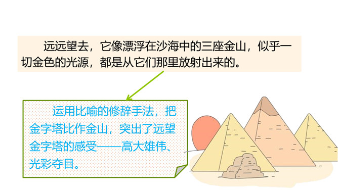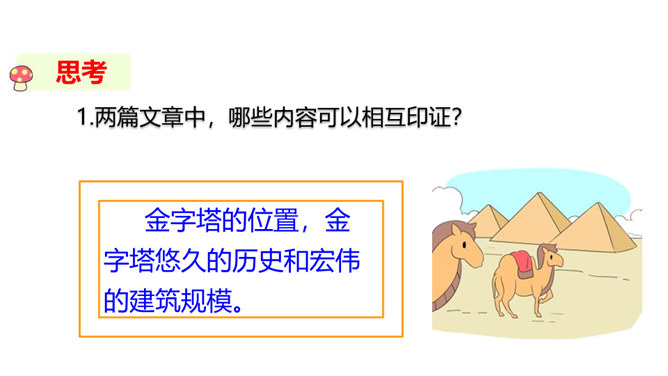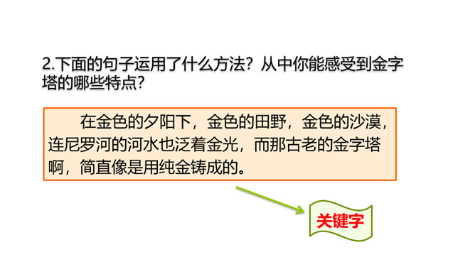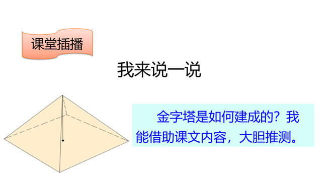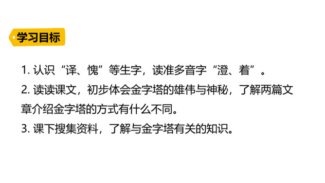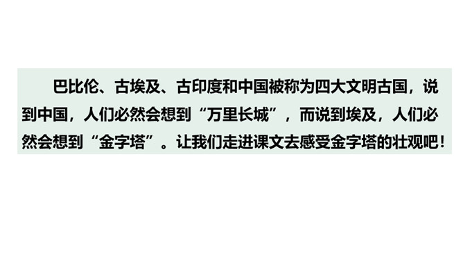 巴比伦、古埃及、古印度和中国被称为四大文明古国,说到中国,人们必然会想到“万里长城”,而说到埃及,人们必然会想到“金字塔”。让我们走进课文去感受金字塔的壮观吧!自由阅读课文,圈出本课生字、生词。说说两篇文章分别用什么方式介绍了金字塔?第一篇文章是写景抒情的散文, 主要描写了夕阳下金字塔的雄浑之美以及作者由此引发的万千思绪; 第二篇文章则是一个非连续性文本,主要以“胡夫金字塔”为例,介绍了金字塔建筑年代的久远、外观的雄伟以及精湛的工艺、巧妙的设计。所属专题:金字塔ppt。