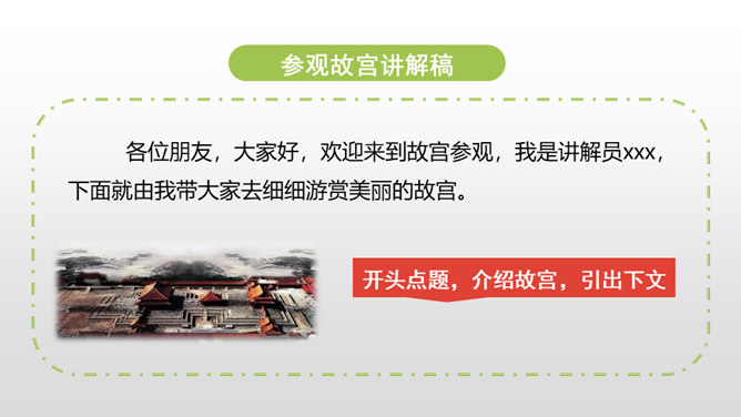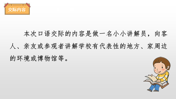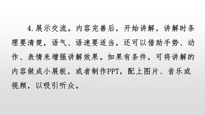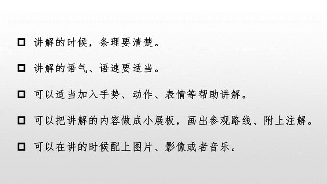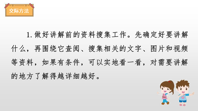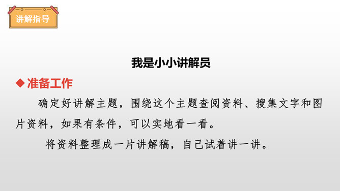 做好讲解前的资料搜集工作。先确定好要讲解什么,再围绕它查阅、搜集相关的文字、图片和视频等资料,如果有条件,可以实地看一看,对需要讲解的地方了解得越详细越好。列出讲解提纲。打算讲解哪些内容,哪些内容需要详细讲解,哪些内容可以简略讲解,做到心中有数。提前预演,完善讲解内容。列好提纲后,先根据提纲梳理所要讲解的内容,提前在小组内预演一遍,小组成员提出疑问和改进意见;然后可以根据意见,总结预演中存在的问题,完善讲解内容,也可以根据听众的反应调整讲解的内容。所属专题:我是小小讲解员ppt。