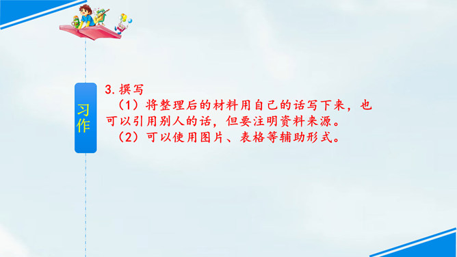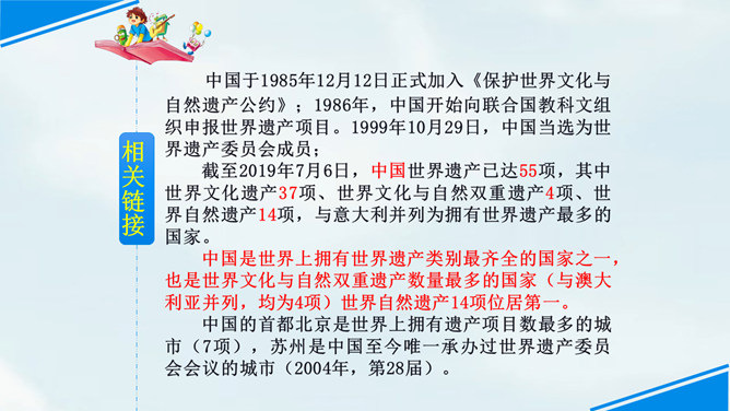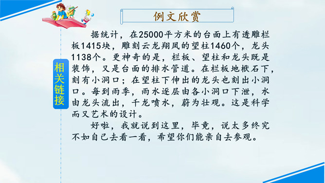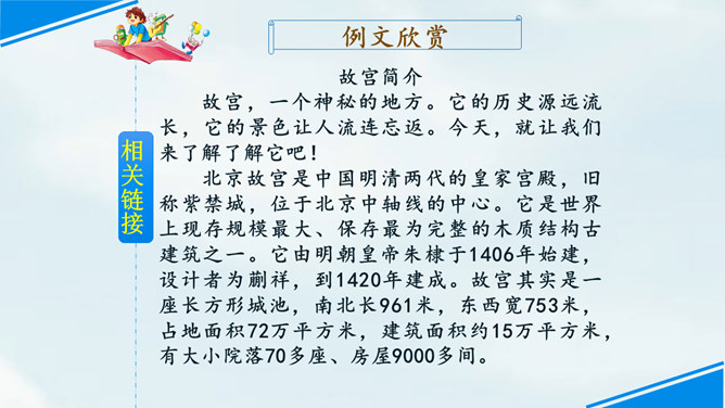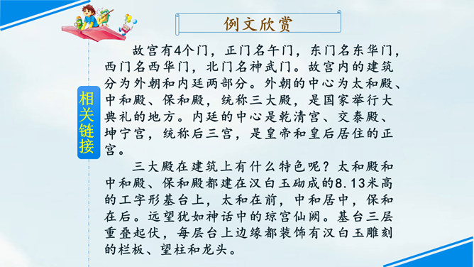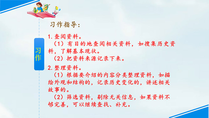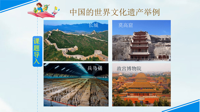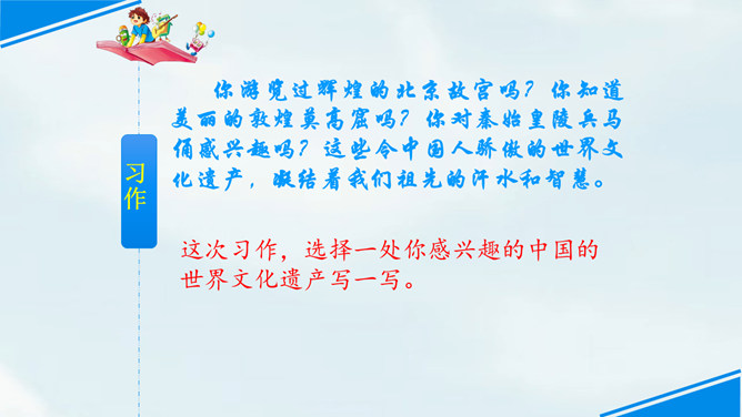 你游览过辉煌的北京故宫吗?你知道美丽的敦煌莫高窟吗?你对秦始皇陵兵马俑感兴趣吗?这些令中国人骄傲的世界文化遗产,凝结着我们祖先的汗水和智慧。这次习作,选择一处你感兴趣的中国的世界文化遗产写一写。习作指导:1.查阅资料。有目的地查阅相关资料,如搜集历史资料,了解基本现状。把资料来源记录下来。2.整理资料。根据要介绍的内容分类整理资料,如描绘外观和结构的,记录历史变化的,讲述相关故事的。