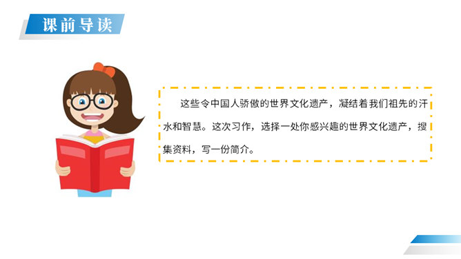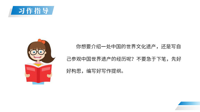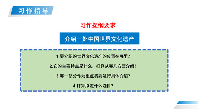 这些令中国人骄傲的世界文化遗产,凝结着我们祖先的汗水和智慧。这次习作,选择一处你感兴趣的世界文化遗产,搜集资料,写一份简介。你想要介绍一处中国的世界文化遗产,还是写自己参观中国世界遗产的经历呢?不要急于下笔,先好好构思,编写好写作提纲。1.要介绍的世界文化遗产的位置在哪里?2.它的主要特点是什么,打算从哪几方面介绍?3.哪一部分作为重点将要进行具体介绍?4.打算拟定什么题目?