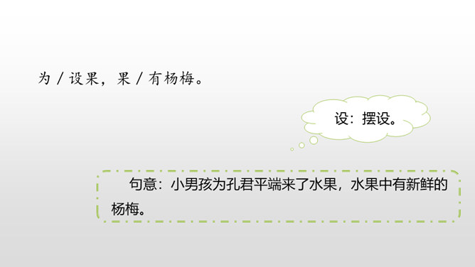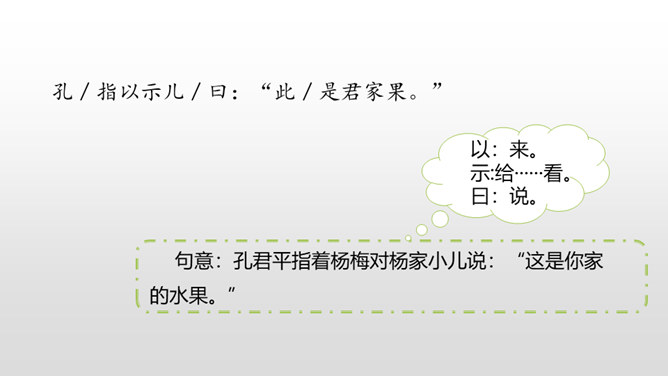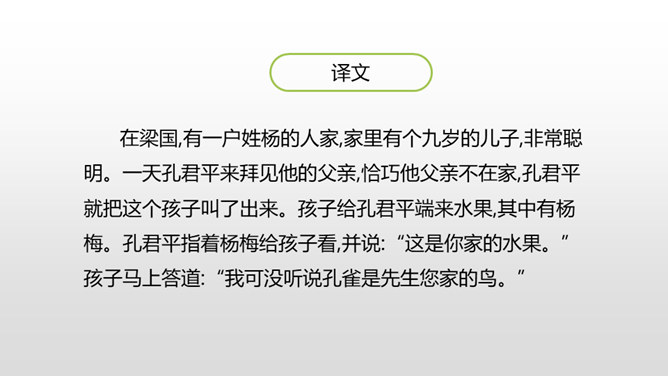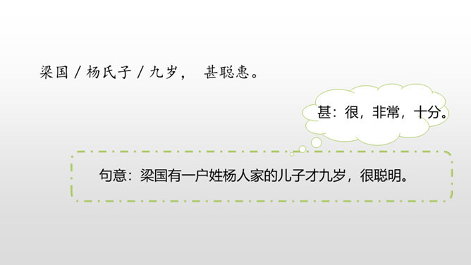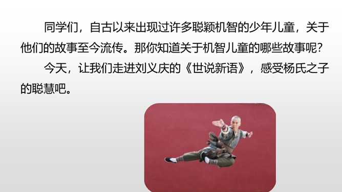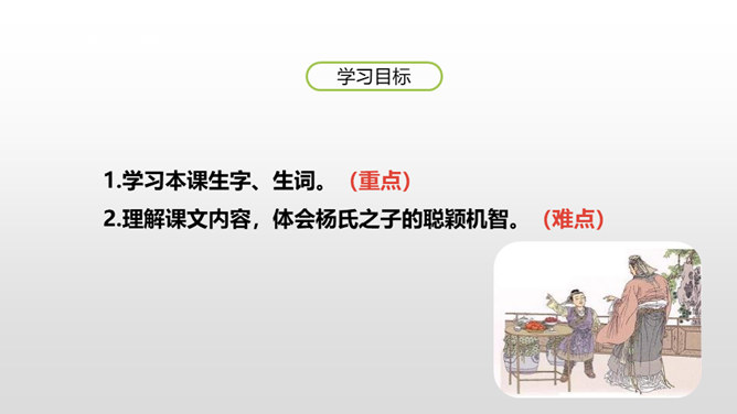 同学们,自古以来出现过许多聪颖机智的少年儿童,关于他们的故事至今流传。那你知道关于机智儿童的哪些故事呢?今天,让我们走进刘义庆的《世说新语》,感受杨氏之子的聪慧吧。认真读,圈出本课新词语,再思考:课文主要向我们介绍了什么?通读全文,说说文章讲了一件什么事?1.学习本课生字、生词。(重点)2.理解课文内容,体会杨氏之子的聪颖机智。(难点)所属专题:杨氏之子ppt。