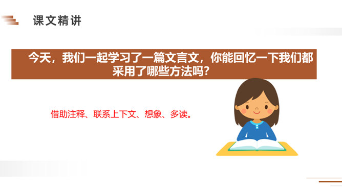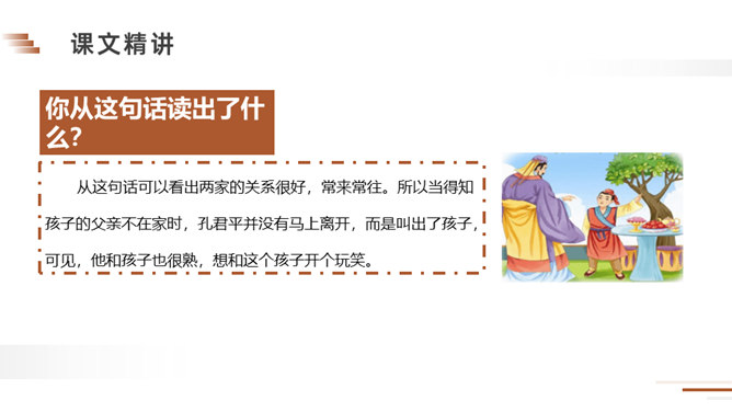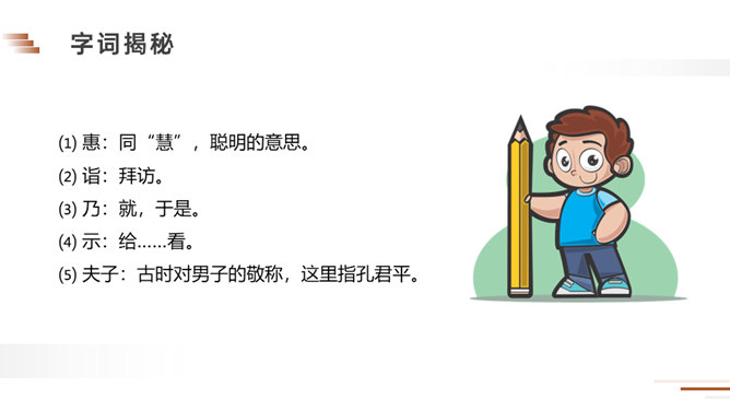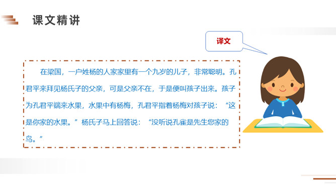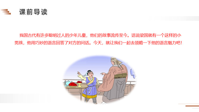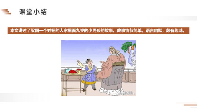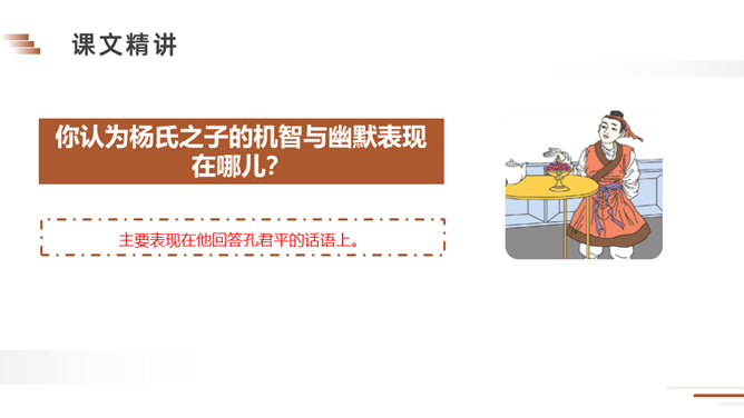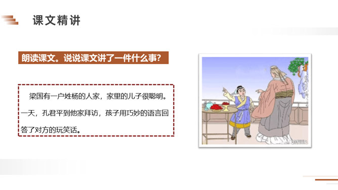 朗读课文。说说课文讲了一件什么事?梁国有一户姓杨的人家,家里的儿子很聪明。一天,孔君平到他家拜访,孩子用巧妙的语言回答了对方的玩笑话。读课文,看看跟我们现在的文章有什么不同?这句话可以看出两家的关系很好,常来常往。所以当得知孩子的父亲不在家时,孔君平并没有马上离开,而是叫出了孩子,可见,他和孩子也很熟,想和这个孩子开个玩笑。今天,我们一起学习了一篇文言文,你能回忆一下我们都采用了哪些方法吗?所属专题:杨氏之子ppt。