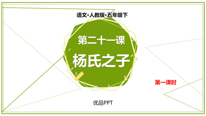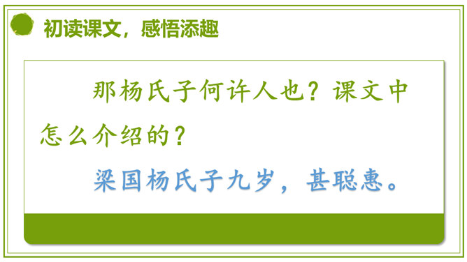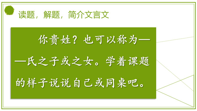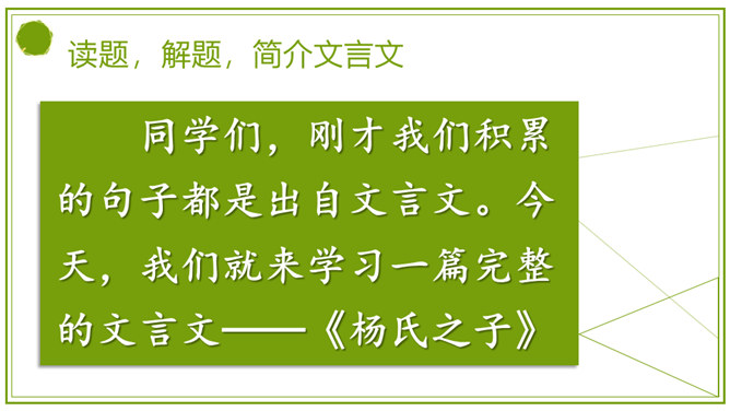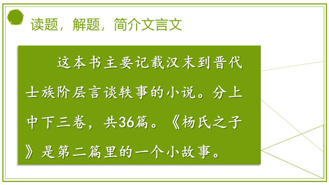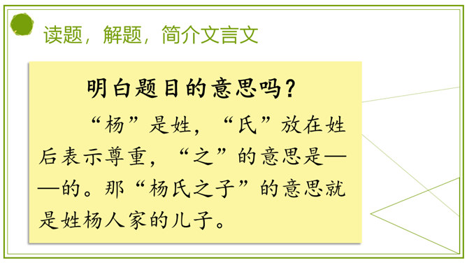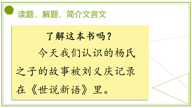 同学们,刚才我们积累的句子都是出自文言文。今天,我们就来学习一篇完整的文言文。明白题目的意思吗?“杨”是姓,“氏”放在姓后表示尊重,“之”的意思是——的。那“杨氏之子”的意思就是姓杨人家的儿子。你贵姓?也可以称为——氏之子或之女。学着课题的样子说说自己或同桌吧。今天我们认识的杨氏之子的故事被刘义庆记录在《世说新语》里。这本书主要记载汉末到晋代士族阶层言谈轶事的小说。所属专题:杨氏之子ppt。