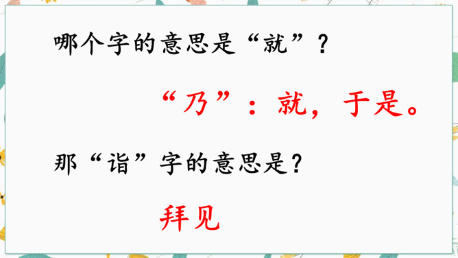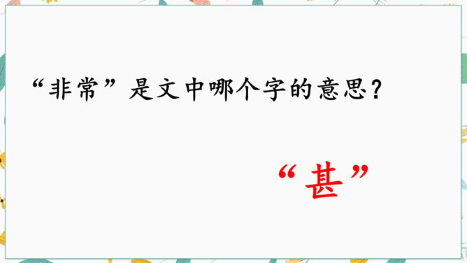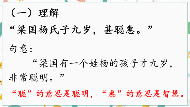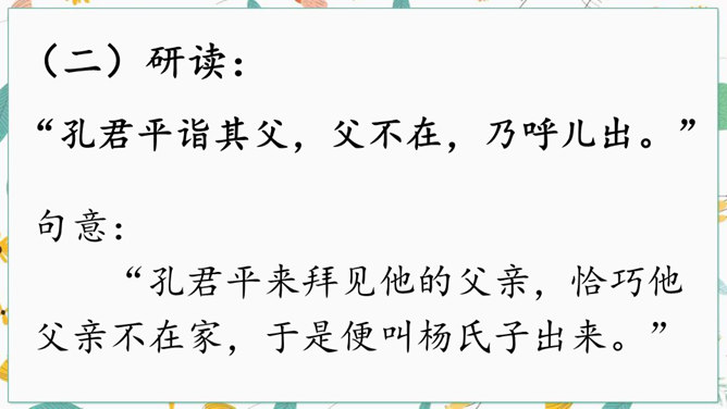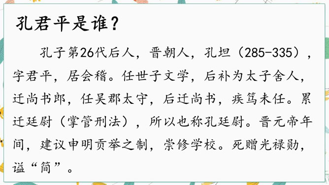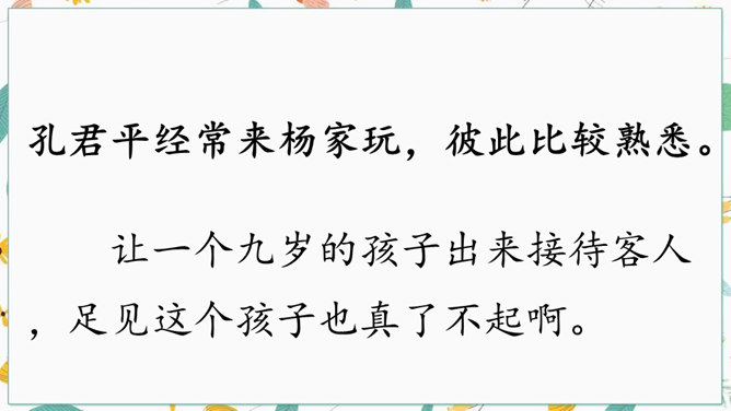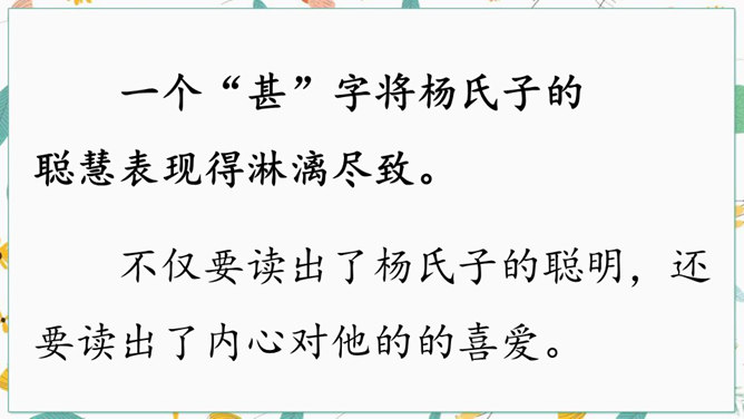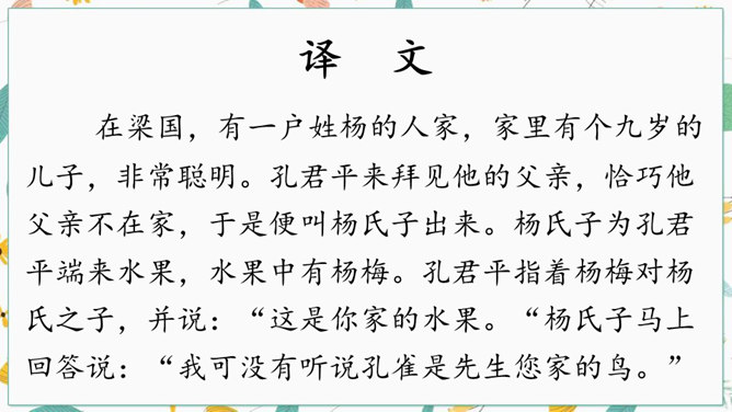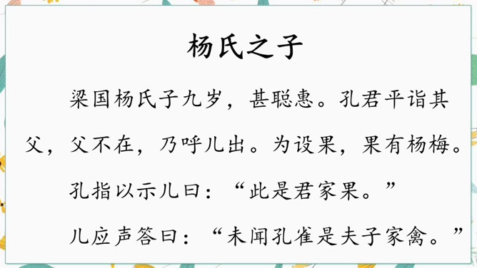 学习文言文光会读,还不行,还要弄懂字里行间的意思才行。你们觉得可用哪些好方法来读懂文言文呢?“聪”的意思是聪明,“惠”的意思是智慧。“非常”是文中哪个字的意思?一个“甚”字将杨氏子的聪慧表现得淋漓尽致。不仅要读出了杨氏子的聪明,还要读出了内心对他的的喜爱。这句中你读明白了什么?两家关系怎么样?从哪儿看出来?为什么?让一个九岁的孩子出来接待客人,足见这个孩子也真了不起啊。所属专题:杨氏之子ppt。