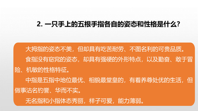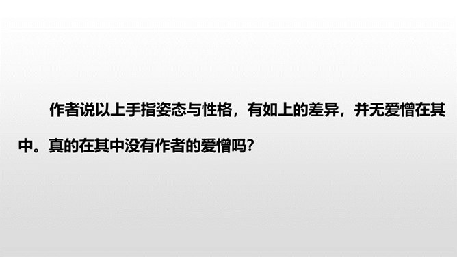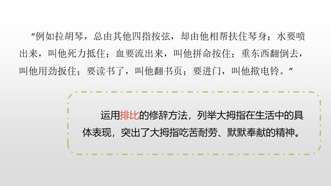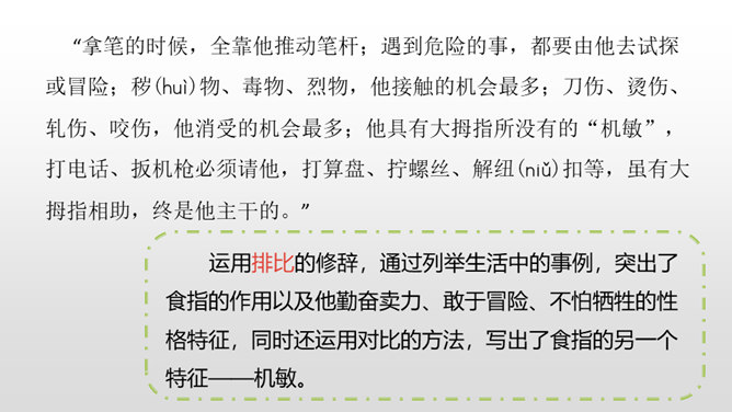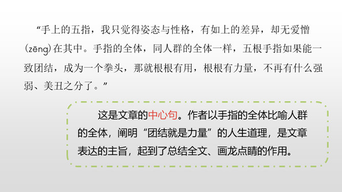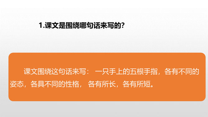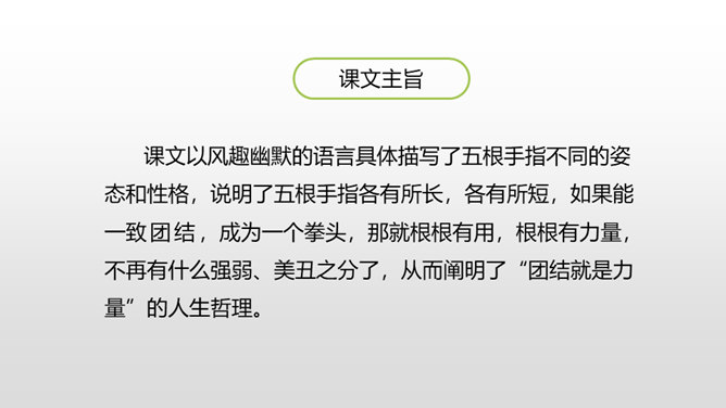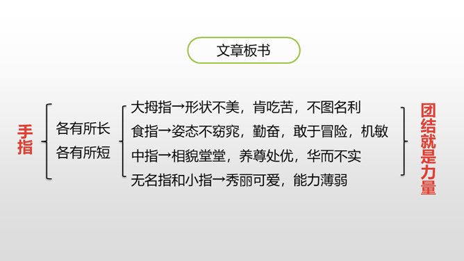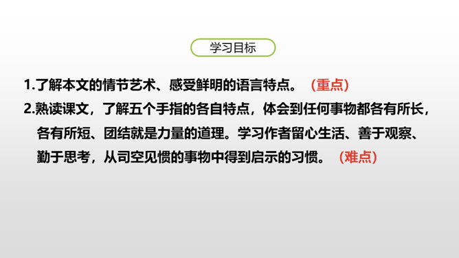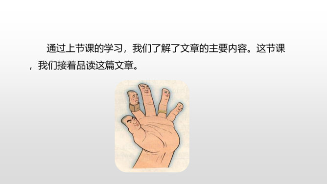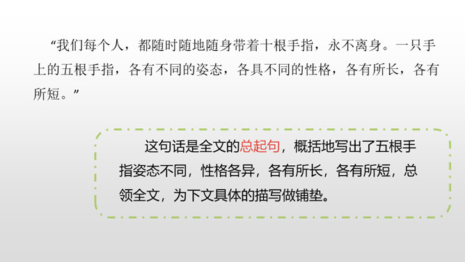 1.了解本文的情节艺术、感受鲜明的语言特点。(重点)2.熟读课文,了解五个手指的各自特点,体会到任何事物都各有所长,各有所短、团结就是力量的道理。学习作者留心生活、善于观察、勤于思考,从司空见惯的事物中得到启示的习惯。通过上节课的学习,我们了解了文章的主要内容。这节课,我们接着品读这篇文章。这句话是全文的总起句,概括地写出了五根手指姿态不同,性格各异,各有所长,各有所短,总领全文,为下文具体的描写做铺垫。