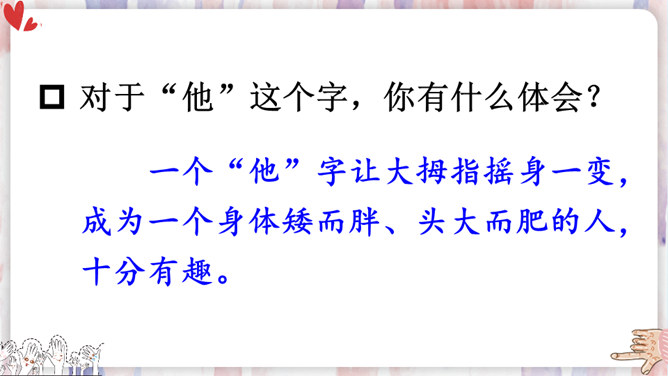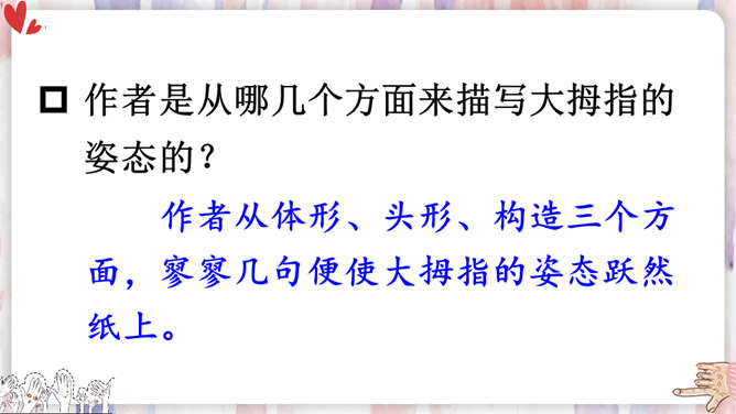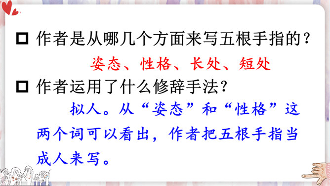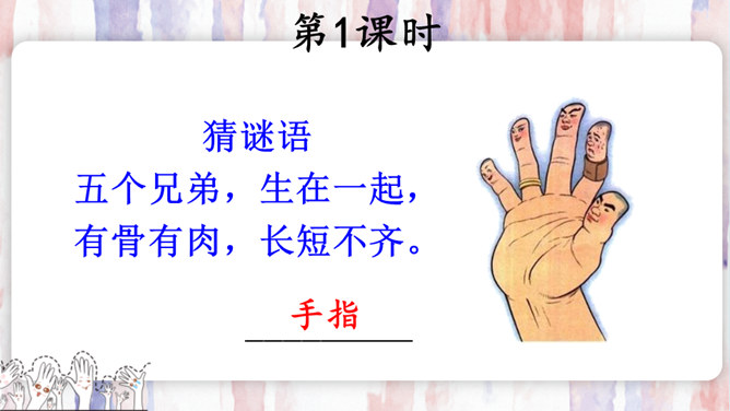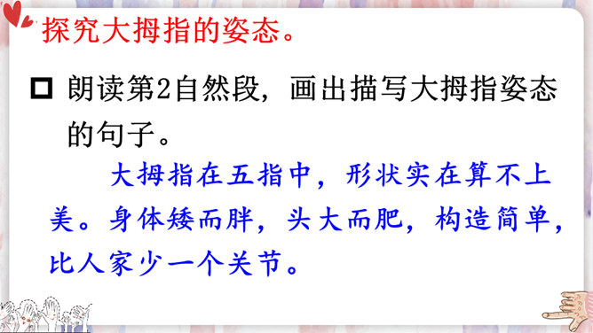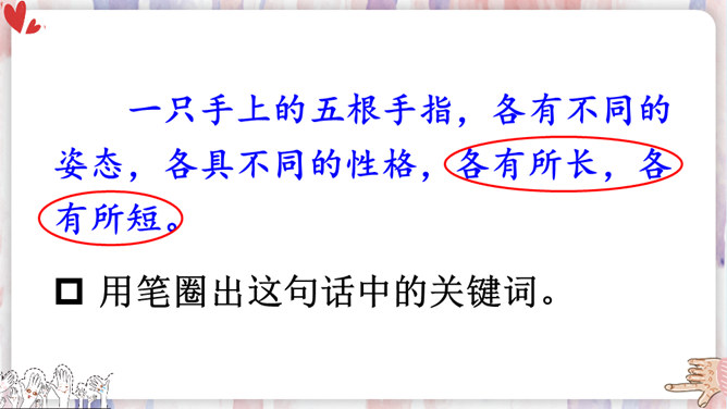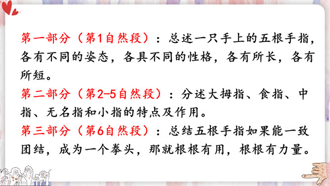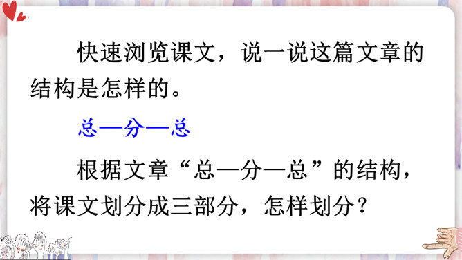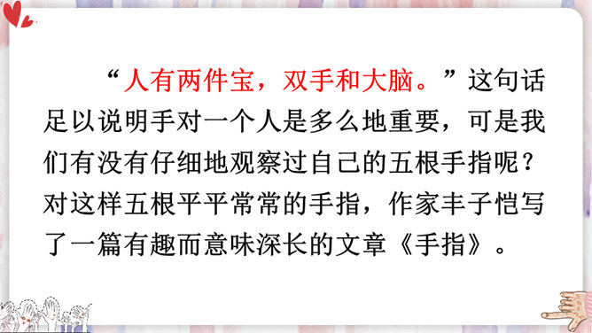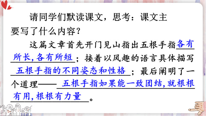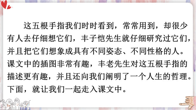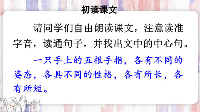 这五根手指我们时时看到,常常用到,却很少有人去仔细想它们,丰子恺先生就仔细研究过它们,并且把它们想象成具有不同姿态、不同性格的人。课文中的插图非常有趣,丰老先生对这五根手指的描述更有趣,并且还向我们阐明了一个人生的哲理。下面,就让我们一起走入课文中。请同学们自由朗读课文,注意读准字音,读通句子,并找出文中的中心句。快速浏览课文,说一说这篇文章的结构是怎样的。