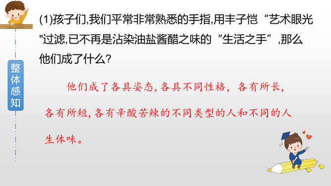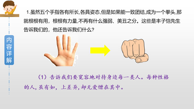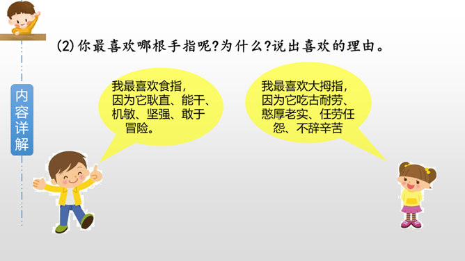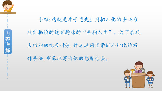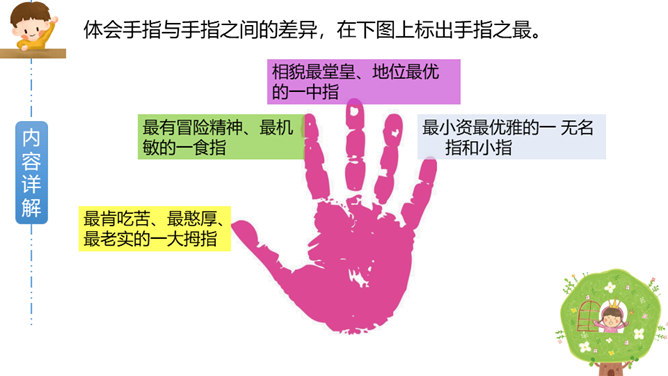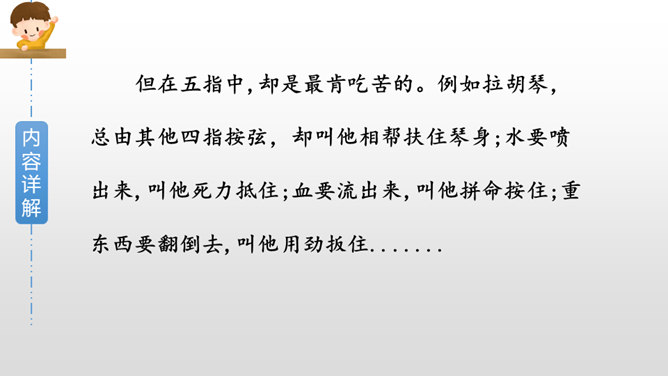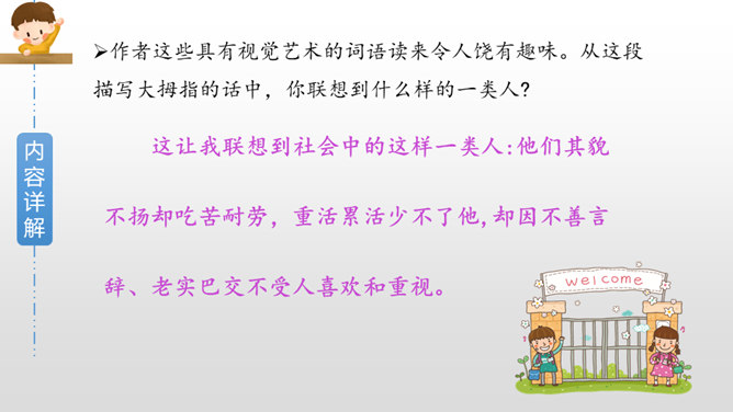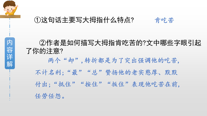 作者是如何描写大拇指肯吃苦的?文中哪些字眼引起了你的注意?两个“却”,转折都是为了突出强调他的吃苦,不计名利;“最”“总”赞扬他的老实憨厚、默默付出;“抵住”“按住”“扳住”表现他吃苦在前,任劳任怨。作者这些具有视觉艺术的词语读来令人饶有趣味。从这段描写大拇指的话中,你联想到什么样的一类人?这让我联想到社会中的这样一类人:他们其貌不扬却吃苦耐劳,重活累活少不了他,却因不善言辞、老实巴交不受人喜欢和重视。