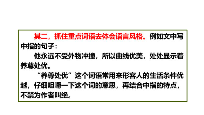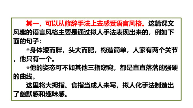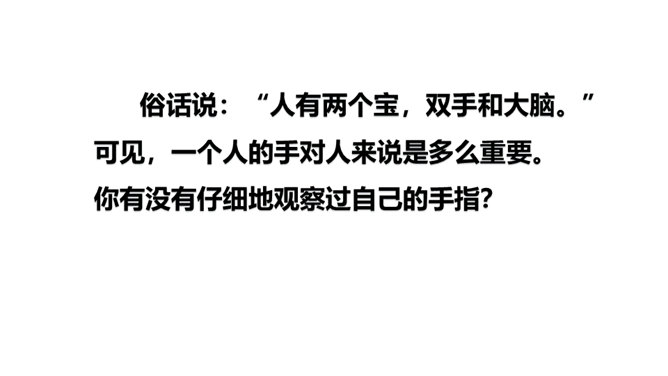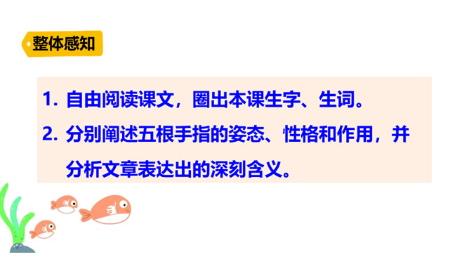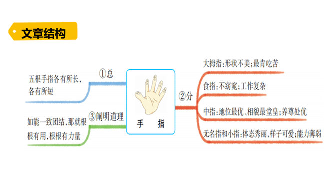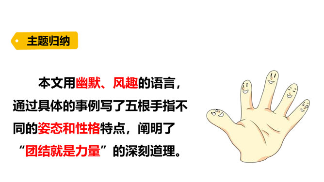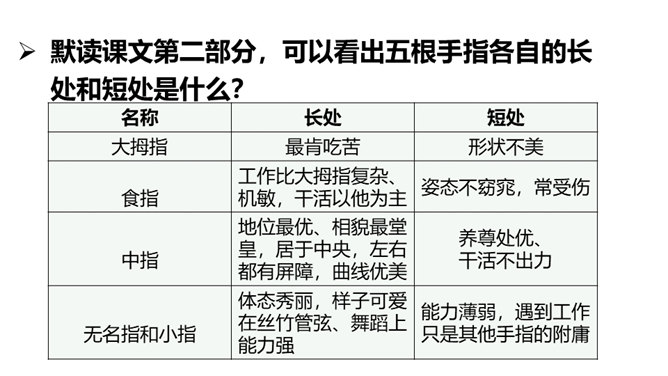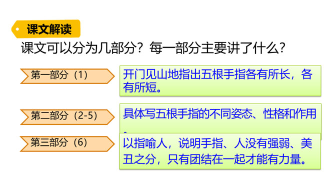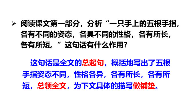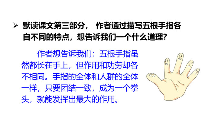 阅读课文第一部分,分析“一只手上的五根手指,各有不同的姿态,各具不同的性格,各有所长,各有所短。”这句话有什么作用?这句话是全文的总起句,概括地写出了五根手指姿态不同,性格各异,各有所长,各有所短,总领全文,为下文具体的描写做铺垫。默读课文第三部分, 作者通过描写五根手指各自不同的特点,想告诉我们一个什么道理?作者想告诉我们:五根手指虽然都长在手上,但作用和功劳却各不相同。手指的全体和人群的全体一样,只要团结一致,成为一个拳头,就能发挥出最大的作用。