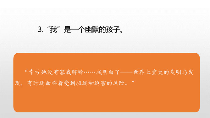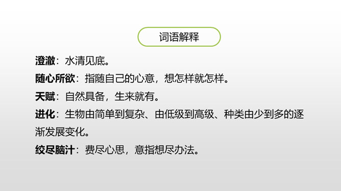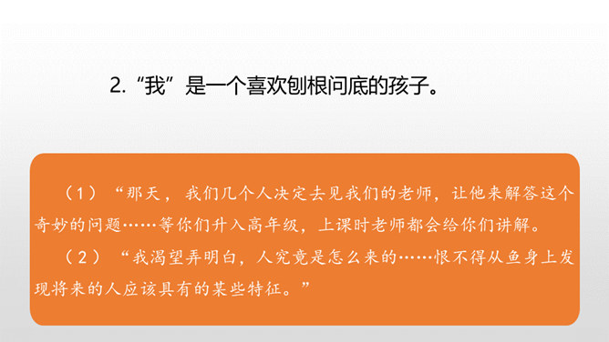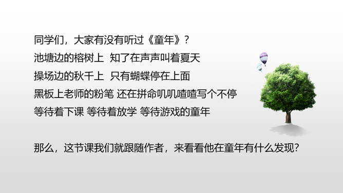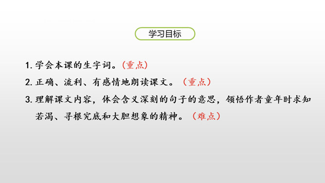 1.学会本课的生字词。(重点)2.正确、流利、有感情地朗读课文。(重点)3.理解课文内容,体会含义深刻的句子的意思,领悟作者童年时求知若渴、寻根究底和大胆想象的精神。(难点)同学们,大家有没有听过《童年》?池塘边的榕树上 知了在声声叫着夏天操场边的秋千上 只有蝴蝶停在上面黑板上老师的粉笔 还在拼命叽叽喳喳写个不停等待着下课 等待着放学 等待游戏的童年那么,这节课我们就跟随作者,来看看他在童年有什么发现?所属专题:童年的发现ppt。