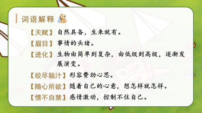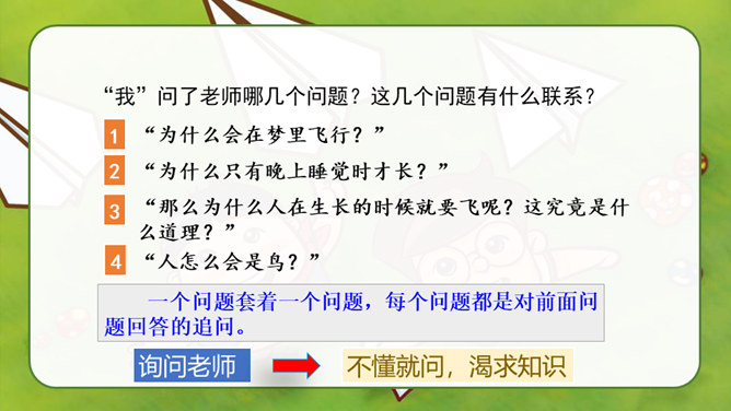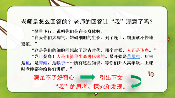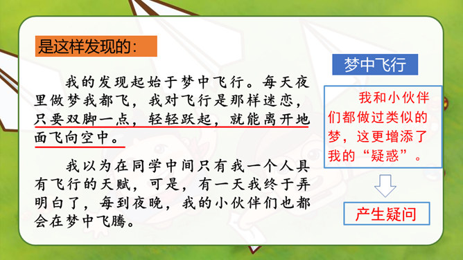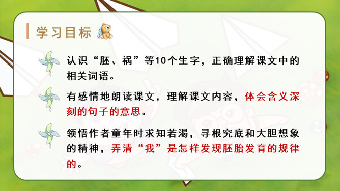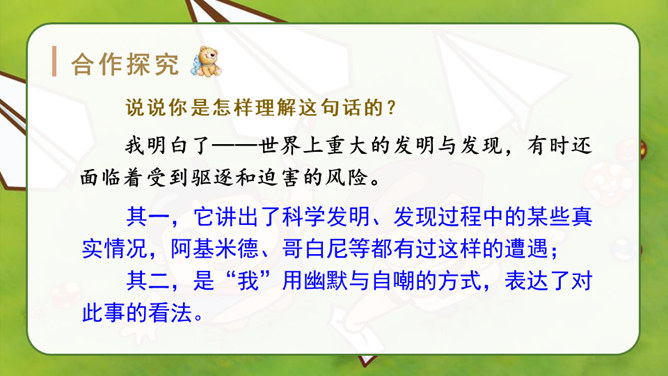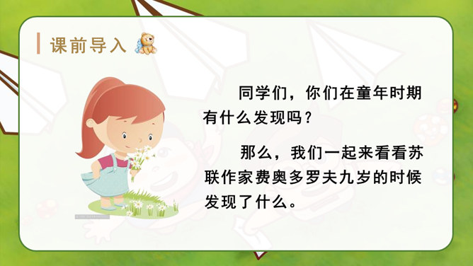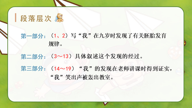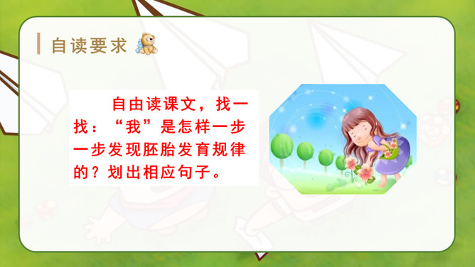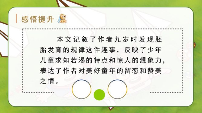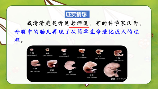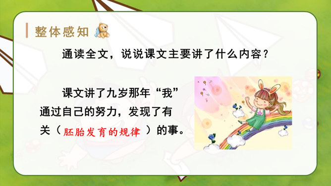 自由读课文,找一找:“我”是怎样一步一步发现胚胎发育规律的?划出相应句子。说说你是怎样理解这句话的?其一,它讲出了科学发明、发现过程中的某些真实情况,阿基米德、哥白尼等都有过这样的遭遇;其二,是“我”用幽默与自嘲的方式,表达了对此事的看法。本文记叙了作者九岁时发现胚胎发育的规律这件趣事,反映了少年儿童求知若渴的特点和惊人的想象力,表达了作者对美好童年的留恋和赞美之情。所属专题:童年的发现ppt。