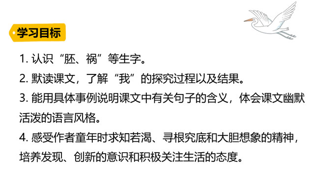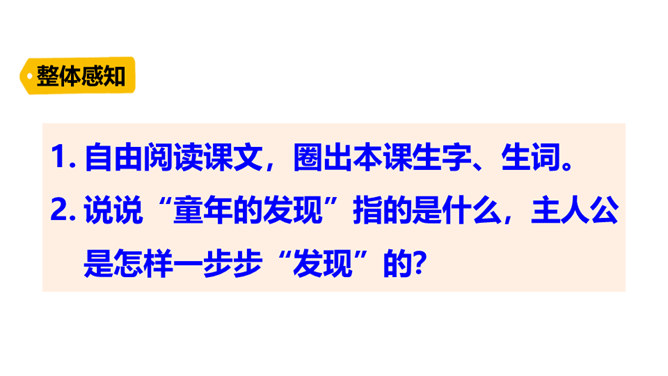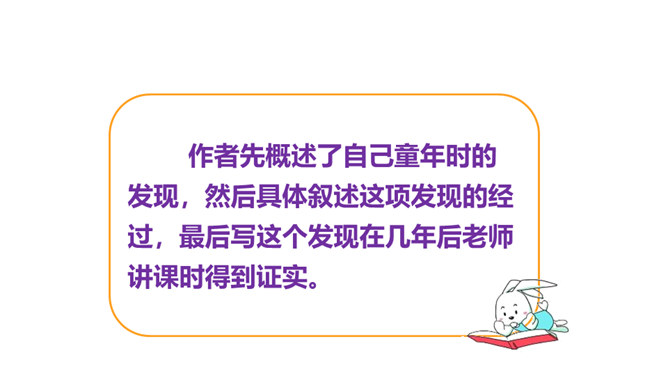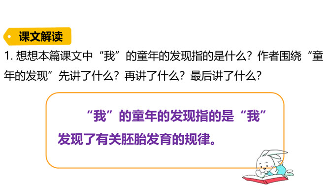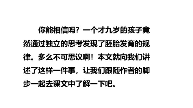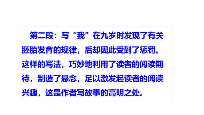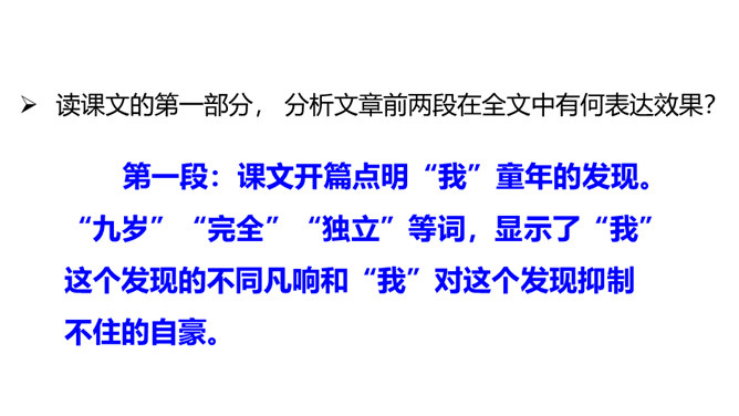 第一部分(1-2)讲“我”在九岁时发现了有关胚胎发育的规律,却后来因此受到惩罚。第二部分(3-13)讲“我”发现有关胚胎发育规律的前后经过。第三部分(14-19)讲“我”在课堂上得知自己的发现居然与科学家的观点完全一致,因此笑出了声,结果被老师误解并受到处罚,但“我”从中也深有感悟。读课文的第一部分, 分析文章前两段在全文中有何表达效果?第一段:课文开篇点明“我”童年的发现。“九岁”“完全”“独立”等词,显示了“我”这个发现的不同凡响和“我”对这个发现抑制不住的自豪。所属专题:童年的发现ppt。