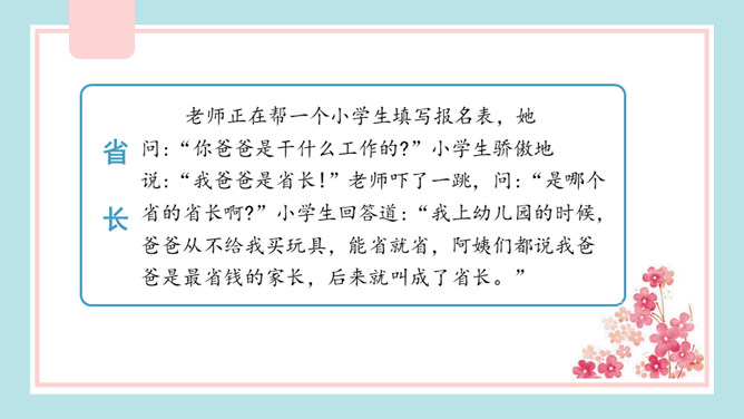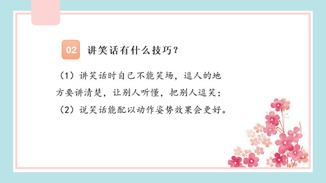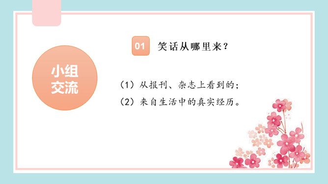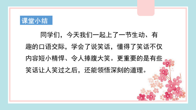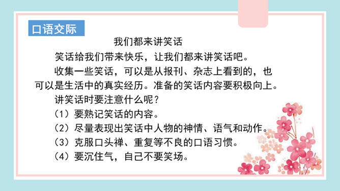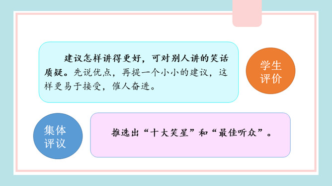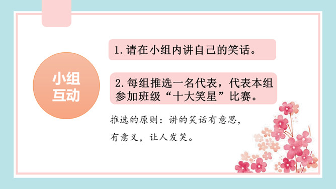 选择两三个你觉得好玩的笑话,在家里先试着讲一讲,看看效果,再根据家人的建议改进。组织一次笑话大会,全班同学一起乐一乐。1.请在小组内讲自己的笑话。2.每组推选一名代表,代表本组参加班级“十大笑星”比赛。推选的原则:讲的笑话有意思,有意义,让人发笑。建议怎样讲得更好,可对别人讲的笑话质疑。先说优点,再提一个小小的建议,这样更易于接受,催人奋进。推选出“十大笑星”和“最佳听众”。所属专题:我们都来讲笑话ppt。