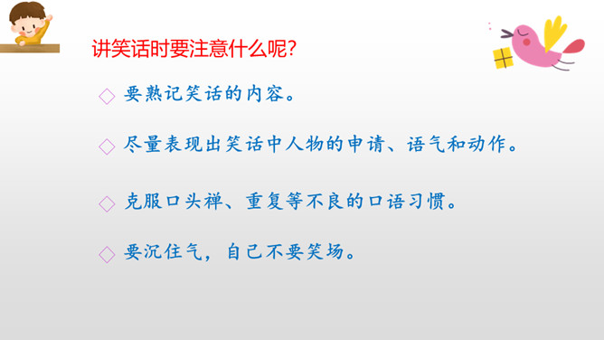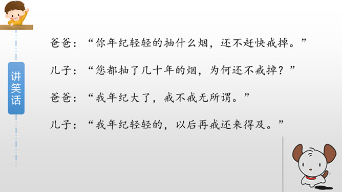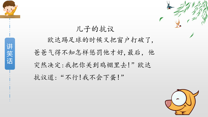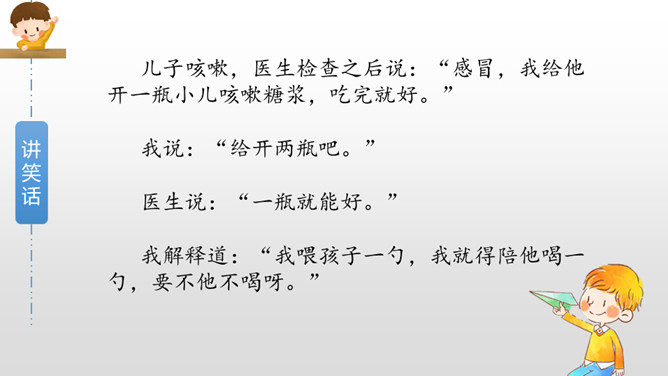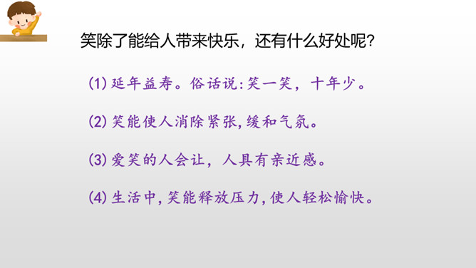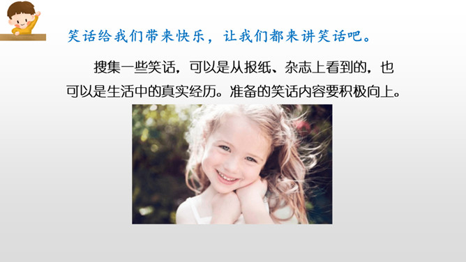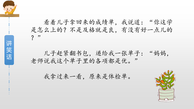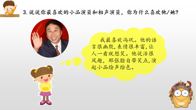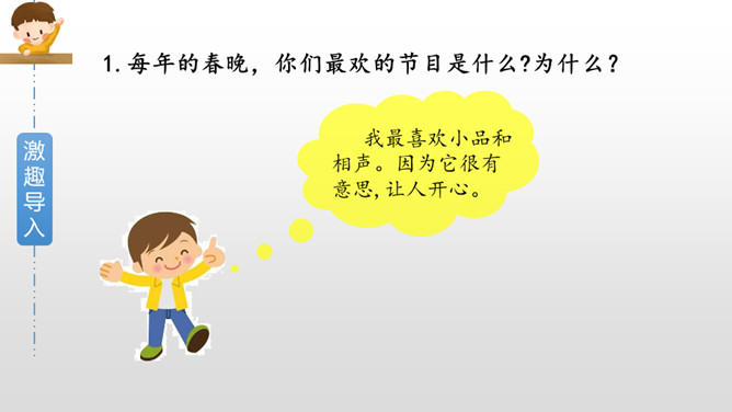 1.每年的春晚,你们最欢的节目是什么?为什么?我最喜欢小品和相声。因为它很有意思,让人开心。3.说说你最喜欢的小品演员和相声演员,你为什么喜欢他/她?我最喜欢冯巩。他的语言很幽默,表情很丰富,让人一看就想笑。他说活很风趣,那张脸自带笑点,演起小品绘声绘色。笑除了能给人带来快乐,还有什么好处呢?(1)延年益寿。俗话说:笑一笑,十年少。(2)笑能使人消除紧张,缓和气氛。(3)爱笑的人会让,人具有亲近感。所属专题:我们都来讲笑话ppt。