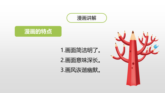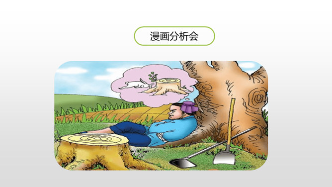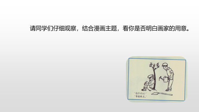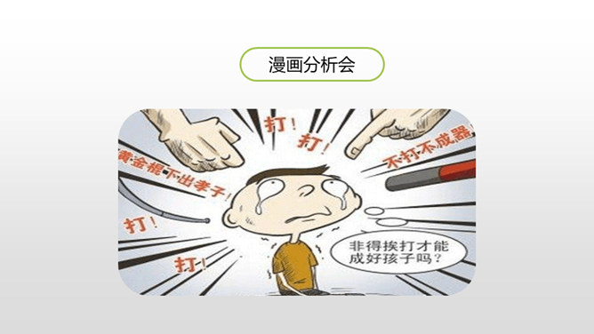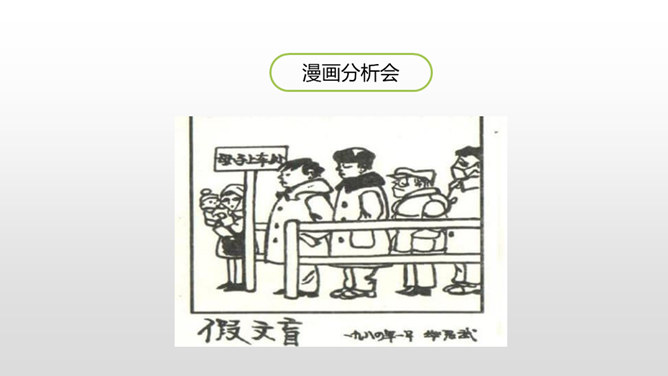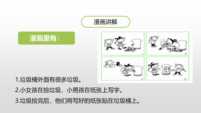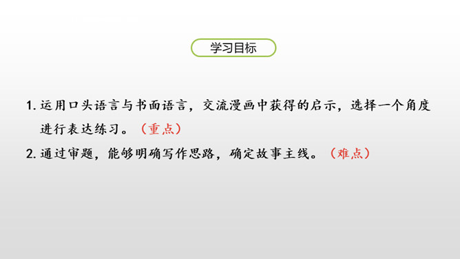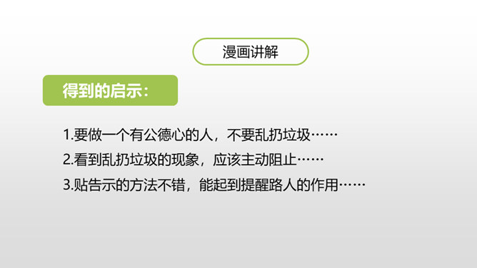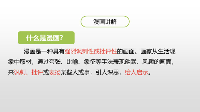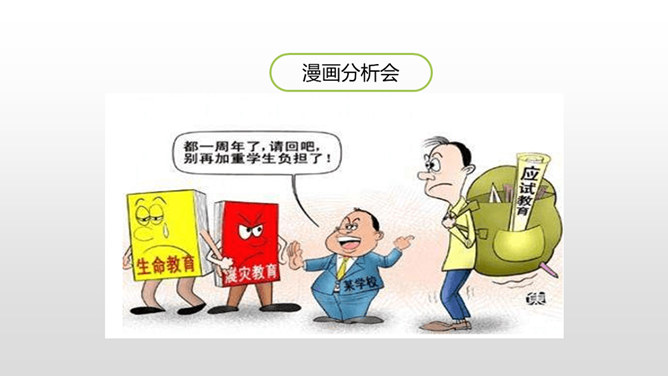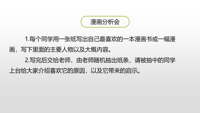 1.运用口头语言与书面语言,交流漫画中获得的启示,选择一个角度进行表达练习。(重点)2.通过审题,能够明确写作思路,确定故事主线。(难点)请同学们仔细观察,结合漫画主题,看你是否明白画家的用意。1.每个同学用一张纸写出自己最喜欢的一本漫画书或一幅漫画,写下里面的主要人物以及大概内容。2.写完后交给老师,由老师随机抽出纸条,请被抽中的同学上台给大家介绍喜欢它的原因,以及它带来的启示。所属专题:漫画的启示ppt。