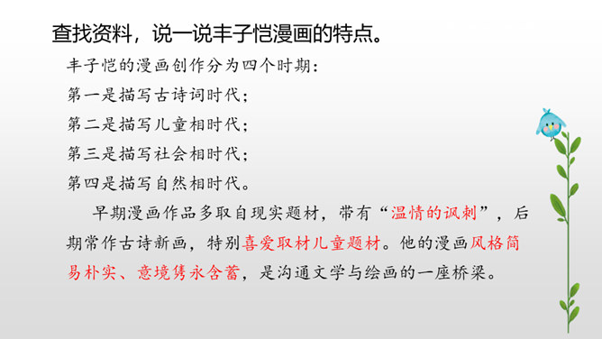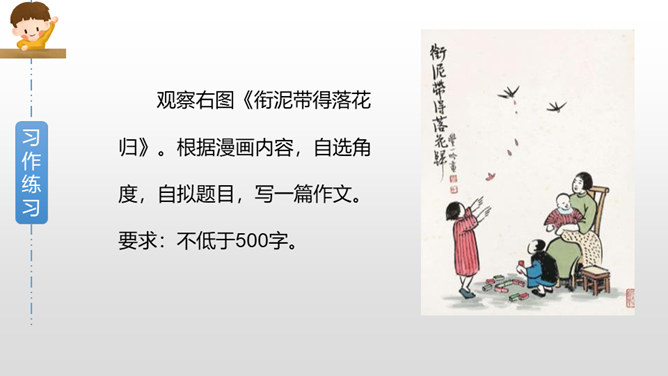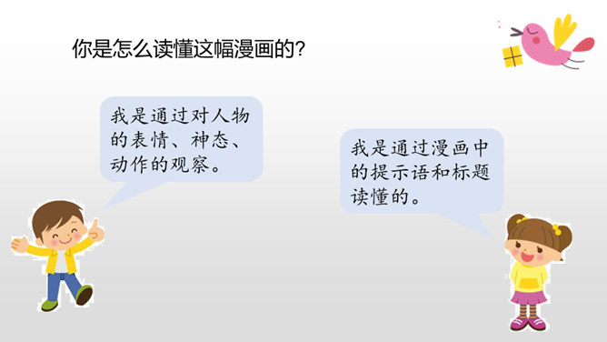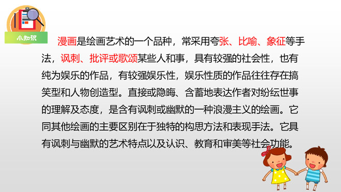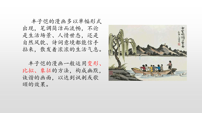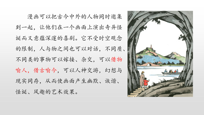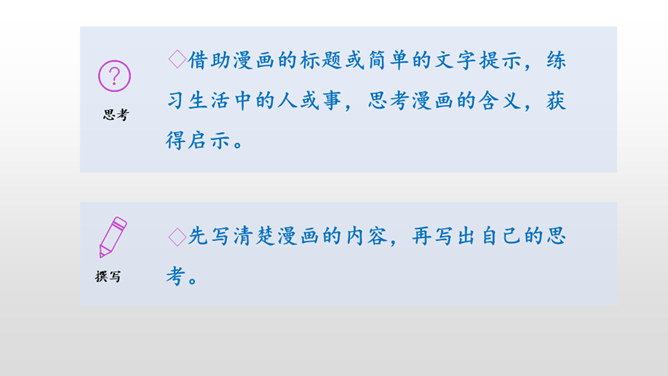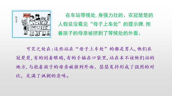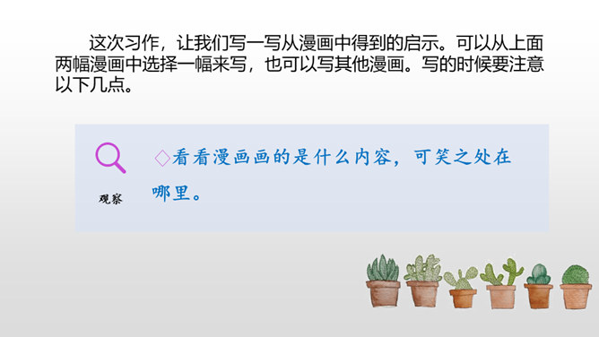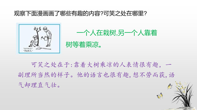 下面三幅漫画出自丰子恺,你最喜欢哪一幅?观察下面漫画画了哪些有趣的内容?可笑之处在哪里?可笑之处在于:靠着大树乘凉的人表情很有趣,一副理所当然的样子。他的语言也很有趣,想不劳而获,语气却理直气壮。这次习作,让我们写一写从漫画中得到的启示。可以从上面两幅漫画中选择一幅来写,也可以写其他漫画。写的时候要注意以下几点。看看漫画画的是什么内容,可笑之处在哪里。先写清楚漫画的内容,再写出自己的思考。所属专题:漫画的启示ppt。