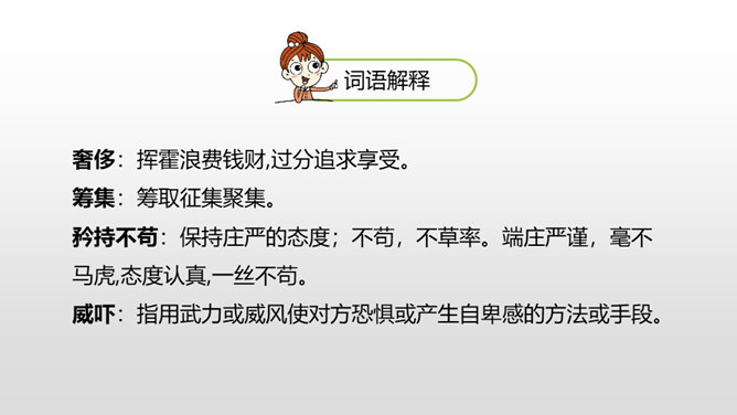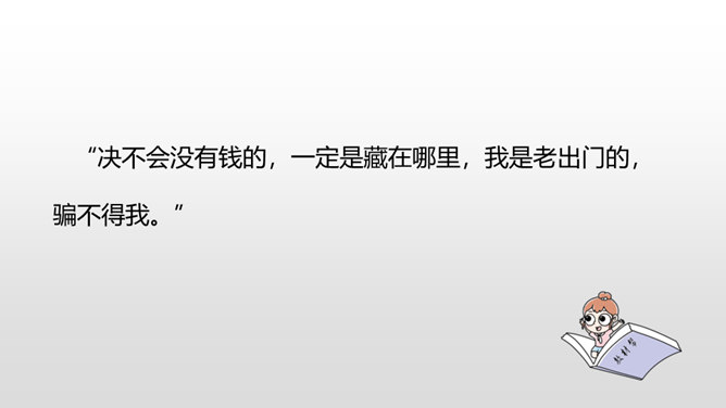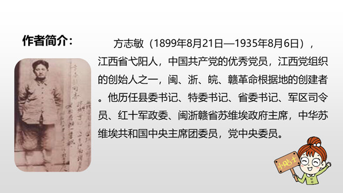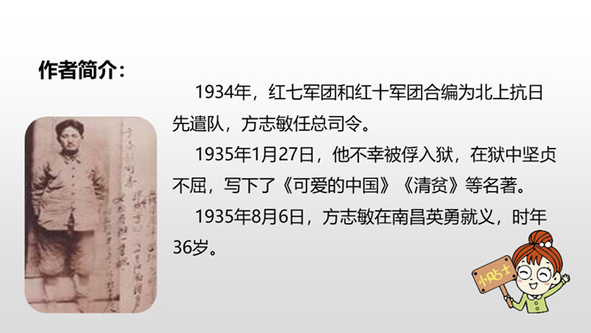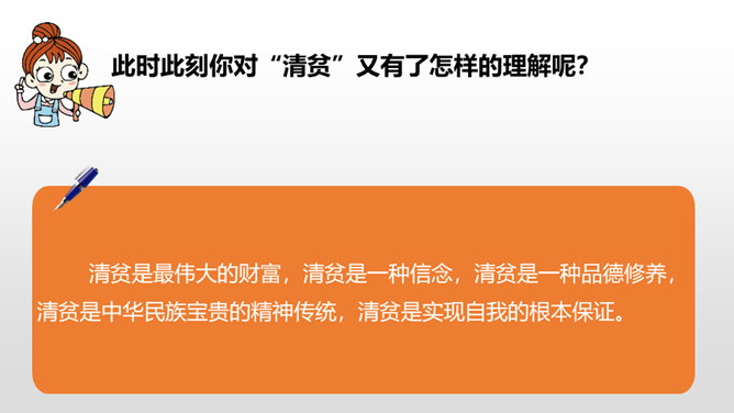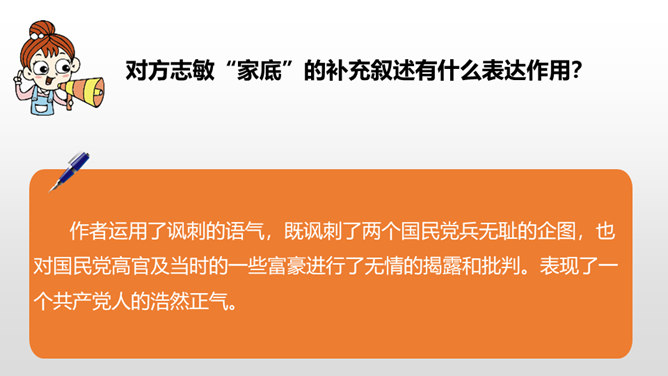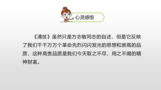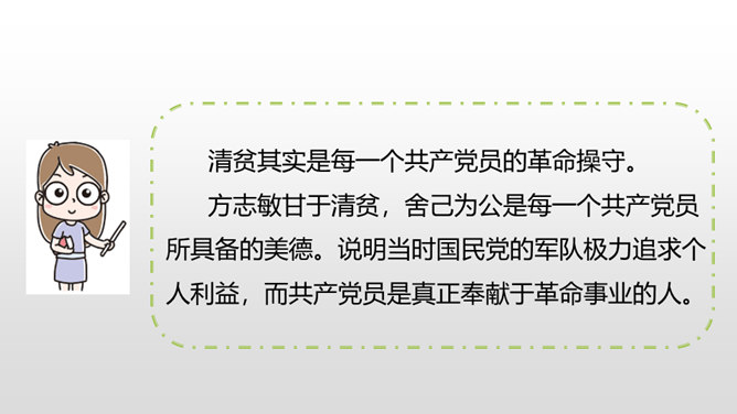 对方志敏“家底”的补充叙述有什么表达作用?作者运用了讽刺的语气,既讽刺了两个国民党兵无耻的企图,也对国民党高官及当时的一些富豪进行了无情的揭露和批判。表现了一个共产党人的浩然正气。此时此刻你对“清贫”又有了怎样的理解呢?清贫是最伟大的财富,清贫是一种信念,清贫是一种品德修养,清贫是中华民族宝贵的精神传统,清贫是实现自我的根本保证。所属专题:清贫ppt。