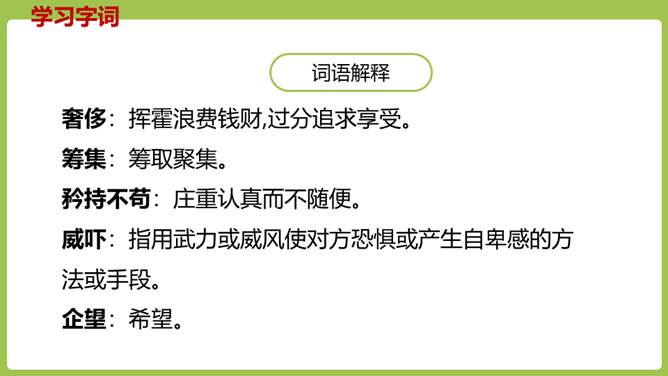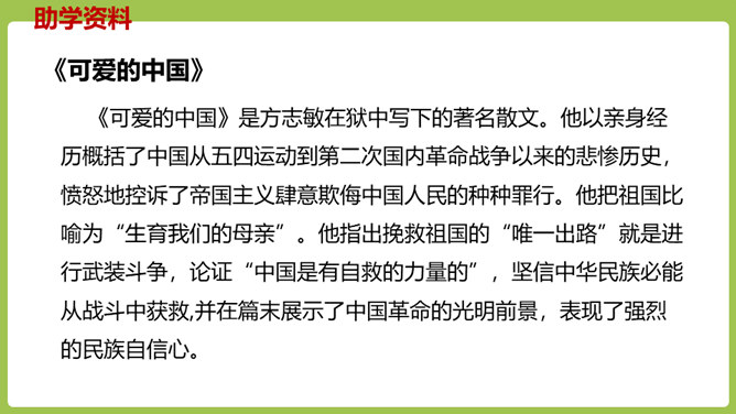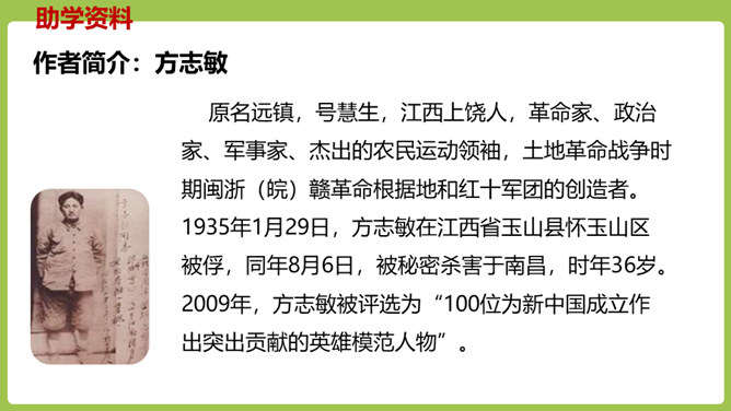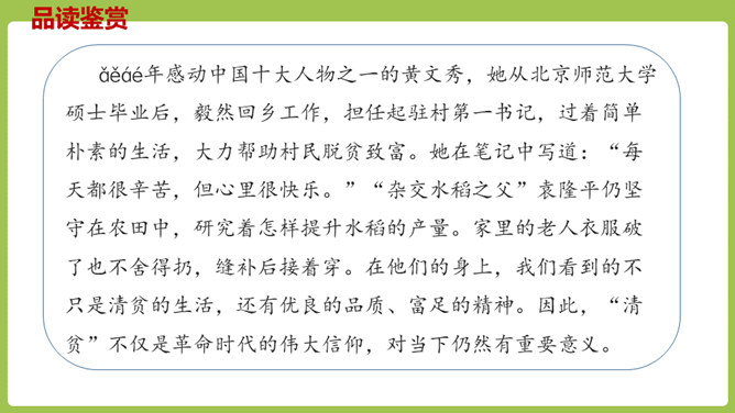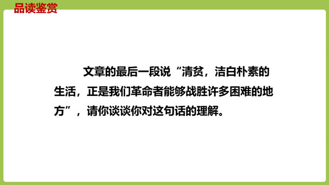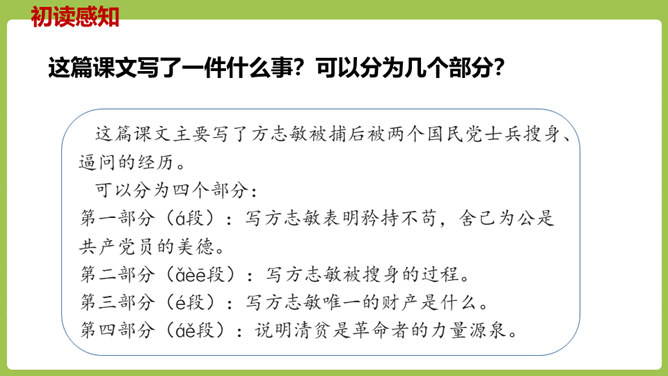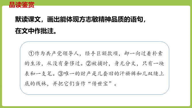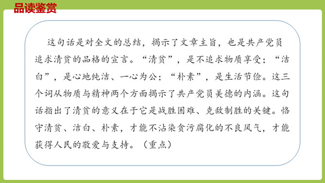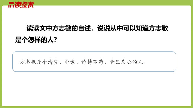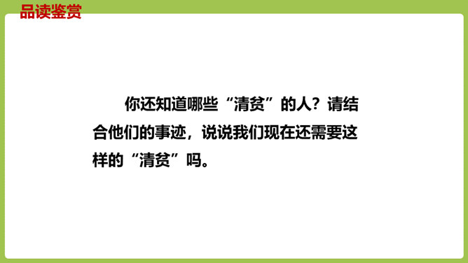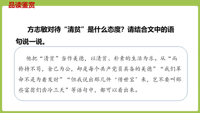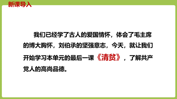 我们已经学了古人的爱国情怀,体会了毛主席的博大胸怀,刘伯承的坚强意志,今天,就让我们开始学习本单元的最后一课《清贫》,了解共产党人的高尚品德。认真朗读课文,圈出本课生字,再默读,并思考交流,这篇课文主要写了一件什么事?默读课文,画出能体现方志敏精神品质的语句,在文中作批注。读读文中方志敏的自述,说说从中可以知道方志敏是个怎样的人?方志敏是个清贫、朴素、矜持不苟、舍己为公的人。所属专题:清贫ppt。