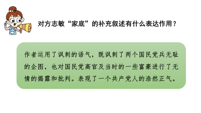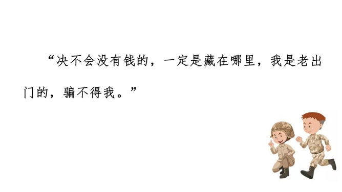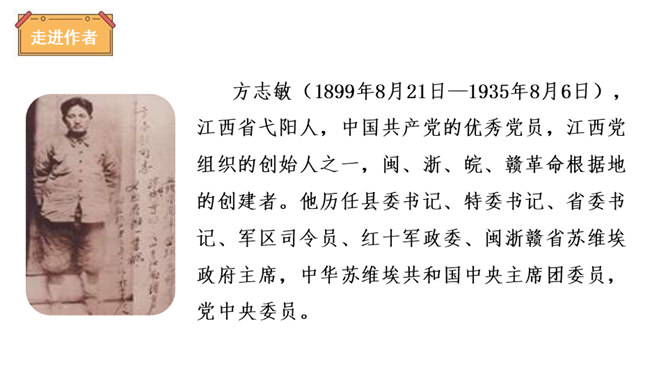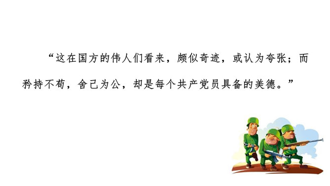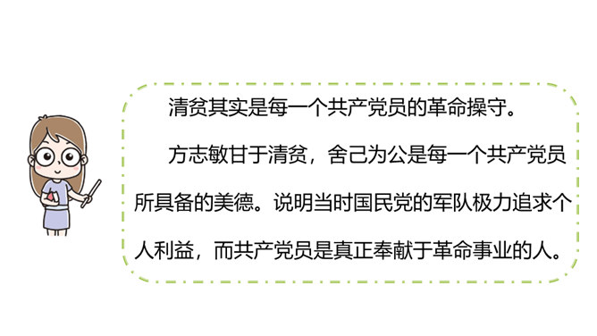 虽然只是方志敏同志的自述,但是它反映了我们千千万万个革命先烈闪闪发光的思想和崇高的品质,这种高贵品质是我们今天取之不尽、用之不竭的精神财富。设问,是一种常见的修辞手法,常表示强调作用。为了强调某部分内容,故意先提出问题,明知故问,自问自答。清贫其实是每一个共产党员的革命操守。方志敏甘于清贫,舍己为公是每一个共产党员所具备的美德。说明当时国民党的军队极力追求个人利益,而共产党员是真正奉献于革命事业的人。所属专题:清贫ppt。