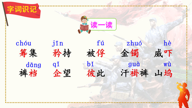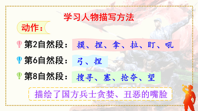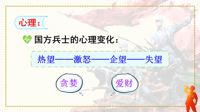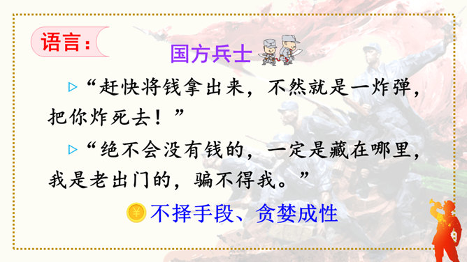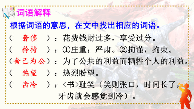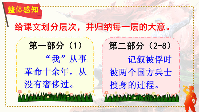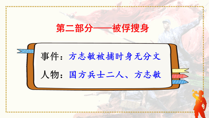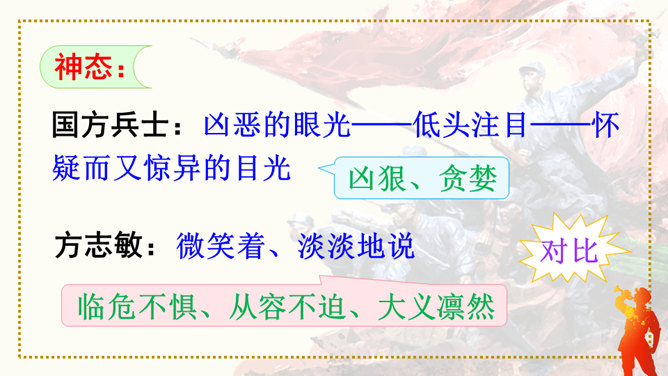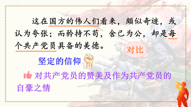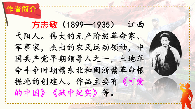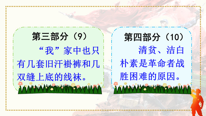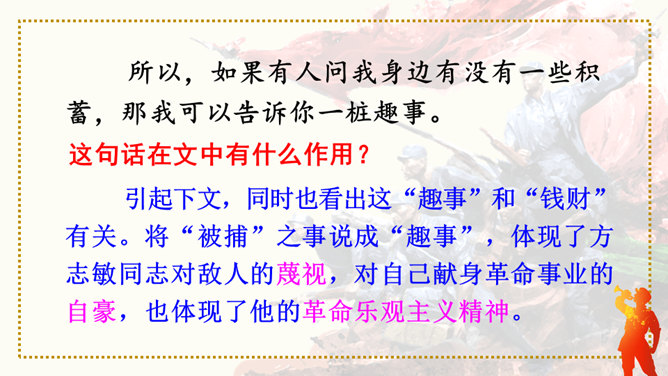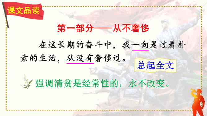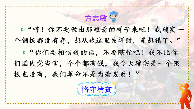 1.全班分成几个小组,交流对“清贫”的认识。2.找来方志敏的其他文章读一读,感受革命者的精神品质。补叙的“传世宝”一段是否可以删去?不可以。补叙使“清贫”更可信,使文章观点更充分,更有说服力、感染力,同时再次重申自己的“贫”,显示出自己毫无掩饰的坦荡胸怀。思考:方志敏是真的没有钱吗?他的钱用于什么地方?方志敏经手的款项总在数百万元,但他全部用于革命事业,可见他的矜持不苟、舍己为公、公正清廉。所属专题:清贫ppt。