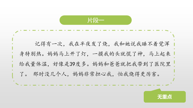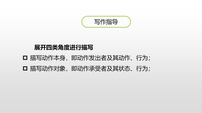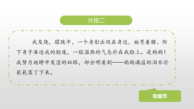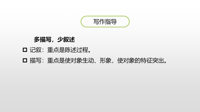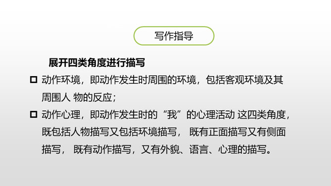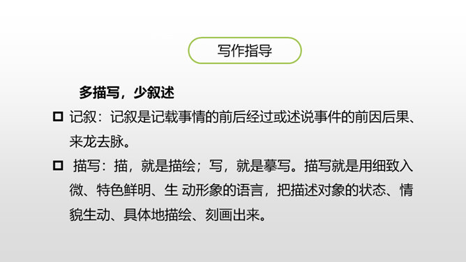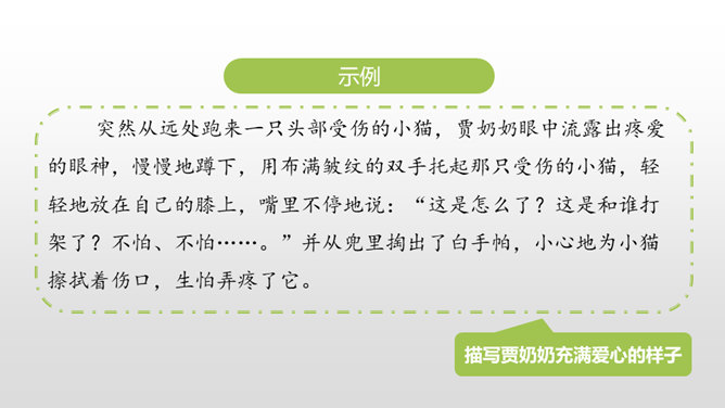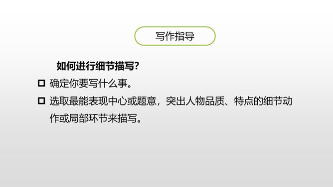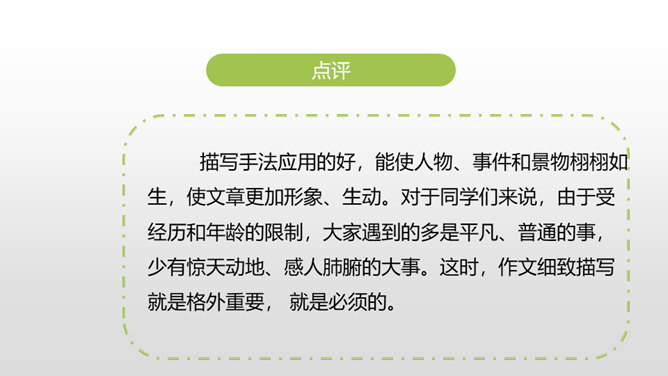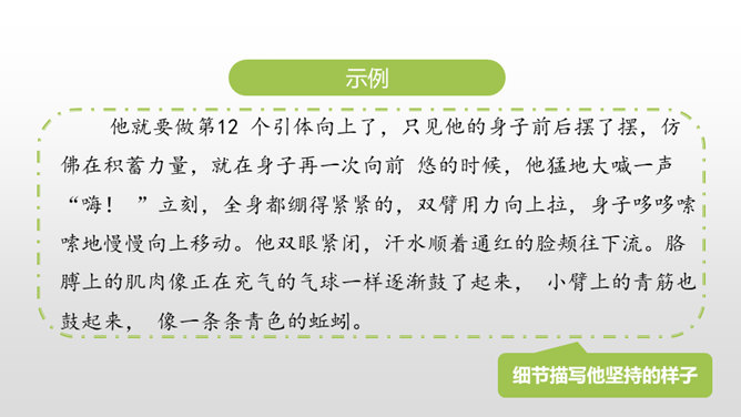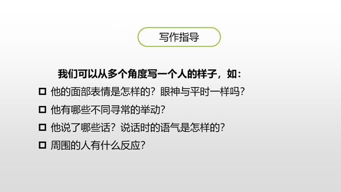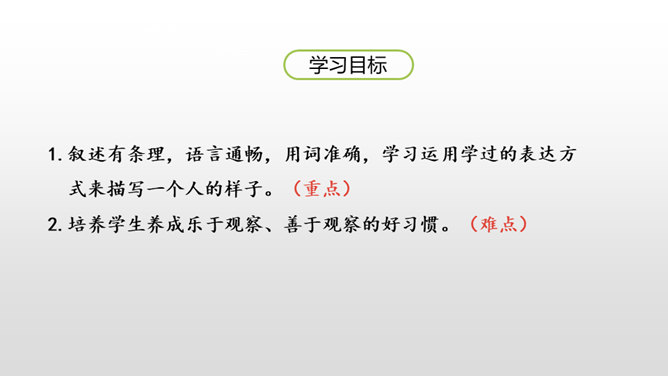1.叙述有条理,语言通畅,用词准确,学习运用学过的表达方式来描写一个人的样子。(重点)2.培养学生养成乐于观察、善于观察的好习惯。(难点)同学们,上节课通过讨论学习,我们知道了描写人物的各种样子。这节课,我们继续学习。描写手法应用的好,能使人物、事件和景物栩栩如生,使文章更加形象、生动。对于同学们来说,由于受经历和年龄的限制,大家遇到的多是平凡、普通的事,少有惊天动地、感人肺腑的大事。这时,作文细致描写就是格外重要, 就是必须的。所属专题:他陶醉了ppt。