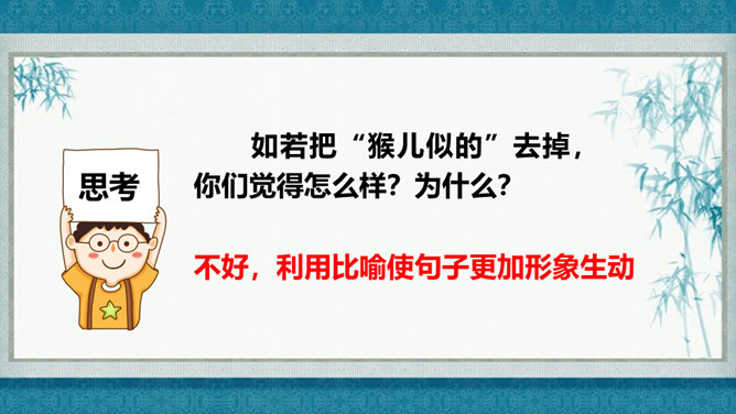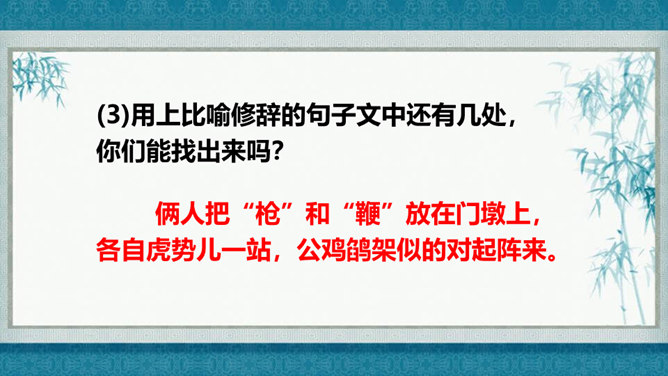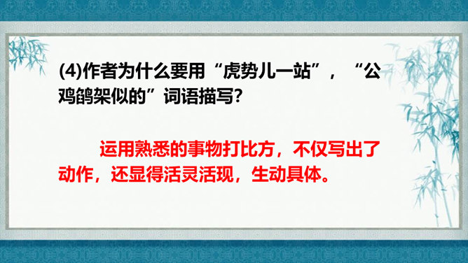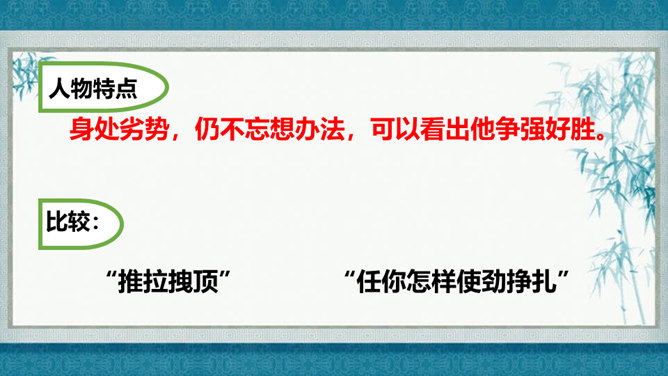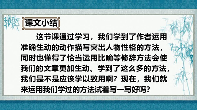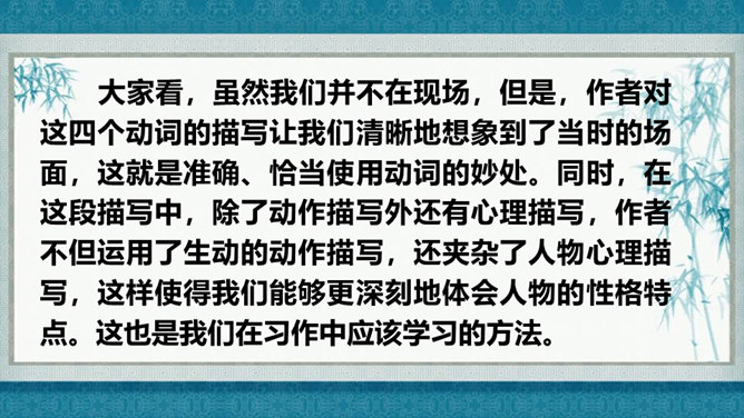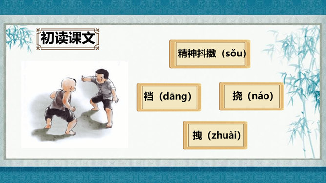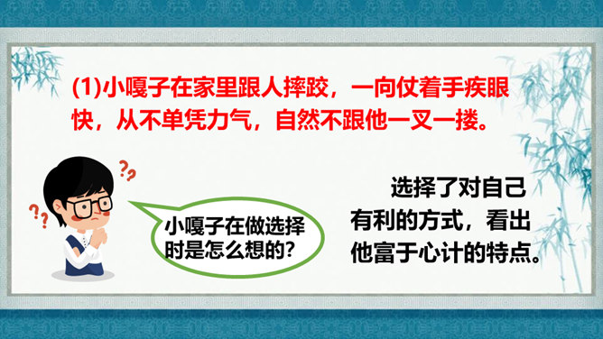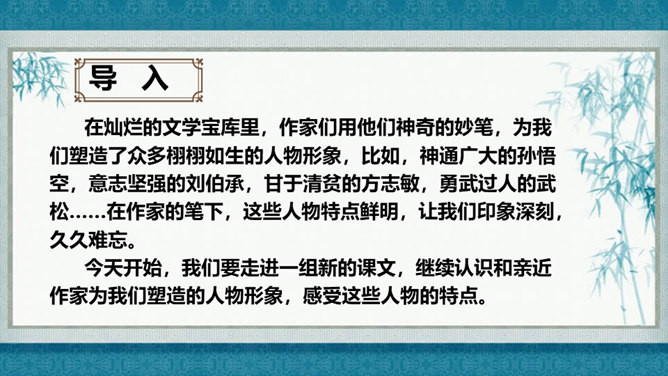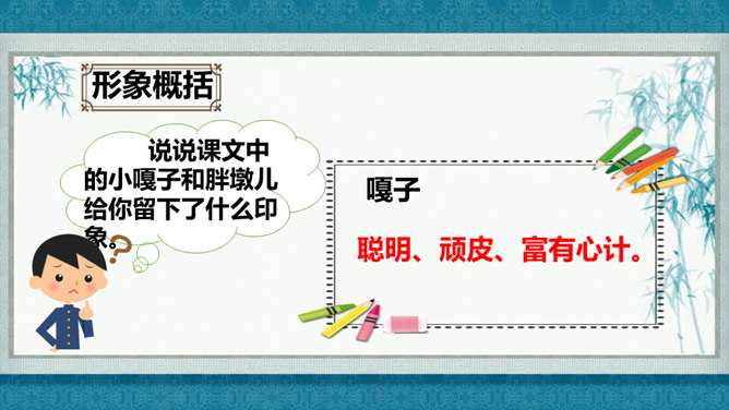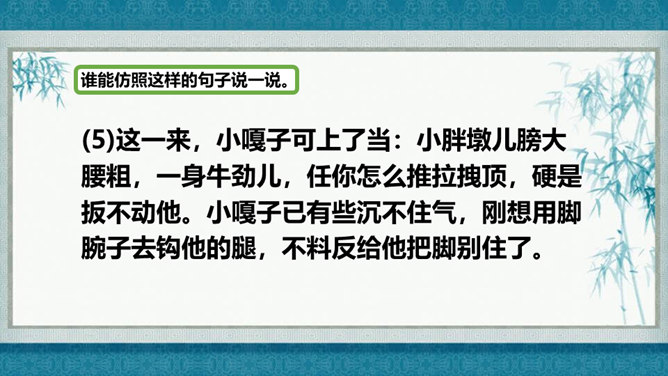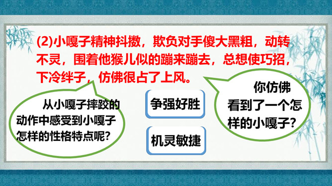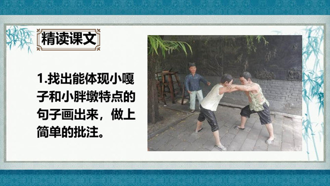 在灿烂的文学宝库里,作家们用他们神奇的妙笔,为我们塑造了众多栩栩如生的人物形象,比如,神通广大的孙悟空,意志坚强的刘伯承,甘于清贫的方志敏,勇武过人的武松……在作家的笔下,这些人物特点鲜明,让我们印象深刻,久久难忘。今天开始,我们要走进一组新的课文,继续认识和亲近作家为我们塑造的人物形象,感受这些人物的特点。找出能体现小嘎子和小胖墩特点的句子画出来,做上简单的批注。所属专题:人物描写一组ppt。
