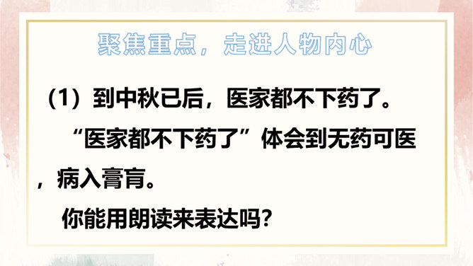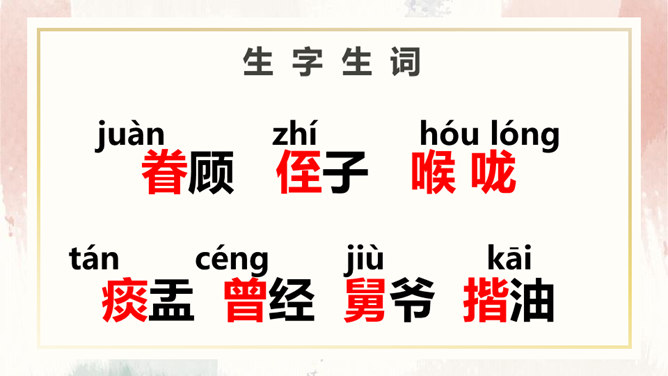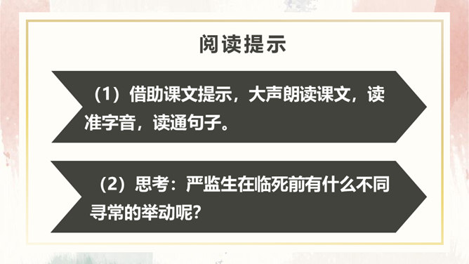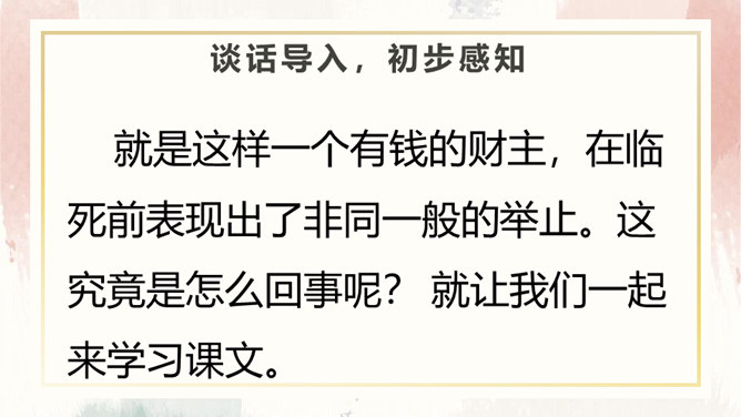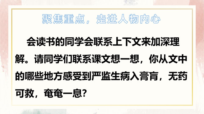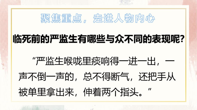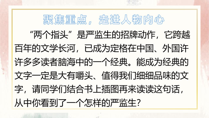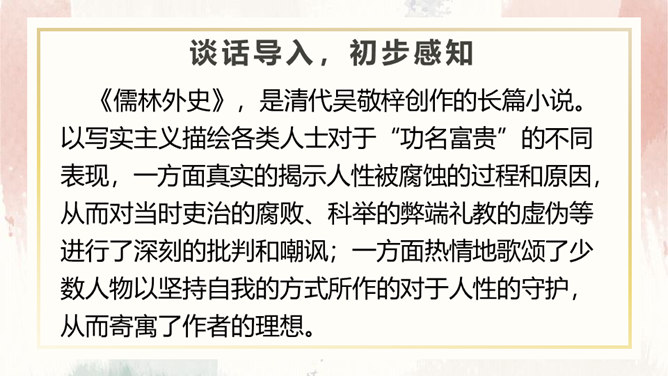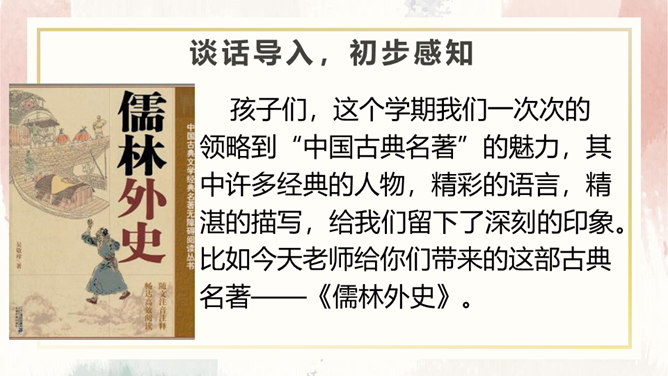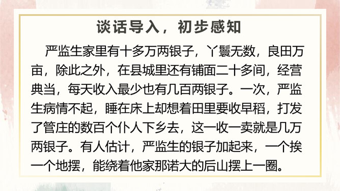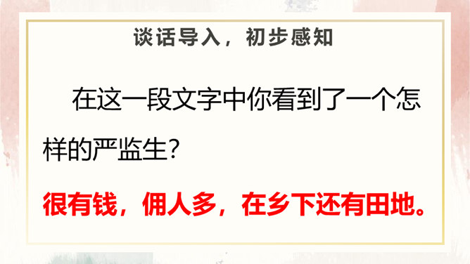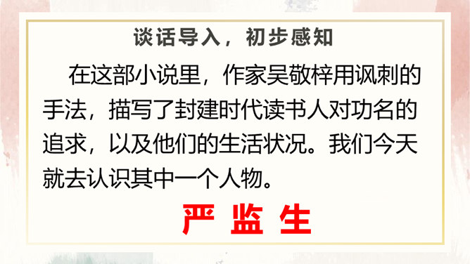 孩子们,这个学期我们一次次的领略到“中国古典名著”的魅力,其中许多经典的人物,精彩的语言,精湛的描写,给我们留下了深刻的印象。比如今天老师给你们带来的这部古典名著——《儒林外史》。在这部小说里,作家吴敬梓用讽刺的手法,描写了封建时代读书人对功名的追求,以及他们的生活状况。我们今天就去认识其中一个人物。了解人物背景严监生究竟是何许人也呢?他的家境又如何呢?我们先来看这样一份资料。所属专题:人物描写一组ppt。