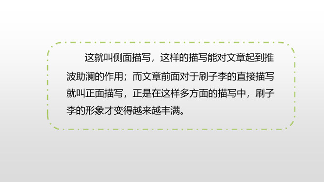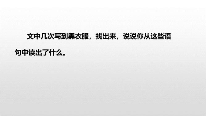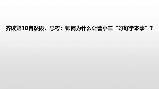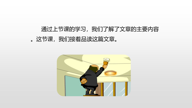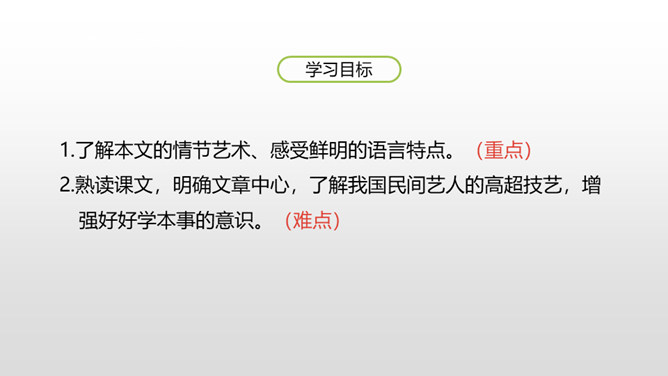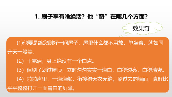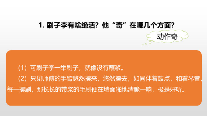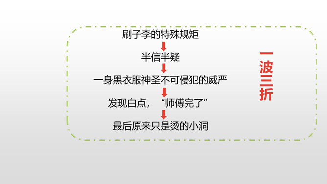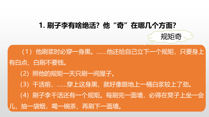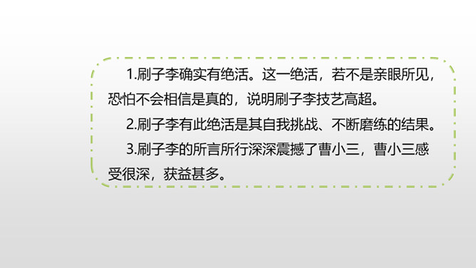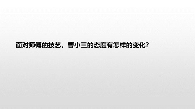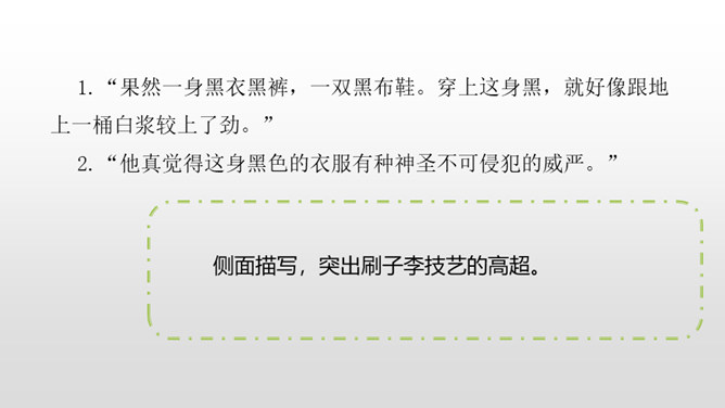1.了解本文的情节艺术、感受鲜明的语言特点。(重点)2.熟读课文,明确文章中心,了解我国民间艺人的高超技艺,增强好好学本事的意识。(难点)通过上节课的学习,我们了解了文章的主要内容。这节课,我们接着品读这篇文章。文中几次写到黑衣服,找出来,说说你从这些语句中读出了什么。面对师傅的技艺,曹小三的态度有怎样的变化?这篇文章主要是写刷子李粉刷技艺的高超,那文章为什么要写曹小三呢?是不是多此一举了?所属专题:刷子李ppt。