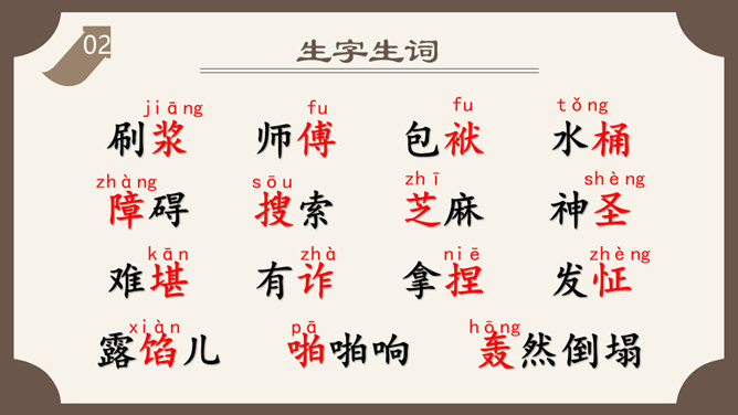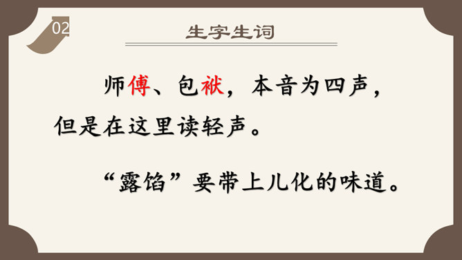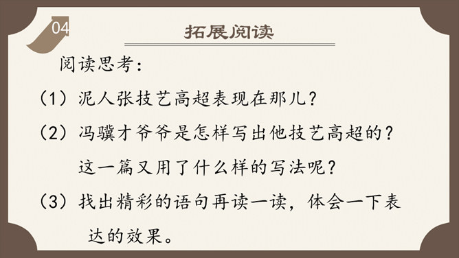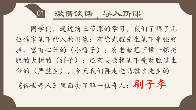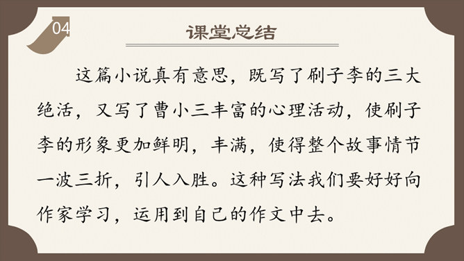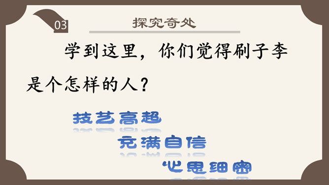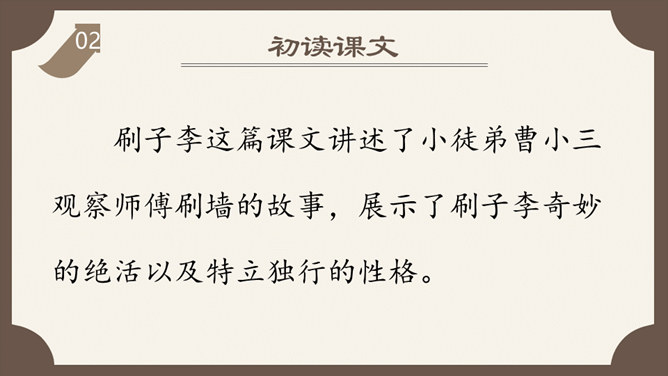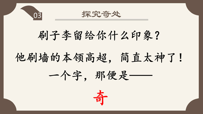 预习过课文吗?谁能说说课文大概讲了什么内容?刷子李这篇课文讲述了小徒弟曹小三观察师傅刷墙的故事,展示了刷子李奇妙的绝活以及特立独行的性格。 阅读思考:(1)泥人张技艺高超表现在那儿?(2)冯骥才爷爷是怎样写出他技艺高超的?这一篇又用了什么样的写法呢?(3)找出精彩的语句再读一读,体会一下表达的效果。 这篇小说真有意思,既写了刷子李的三大绝活,又写了曹小三丰富的心理活动,使刷子李的形象更加鲜明,丰满,使得整个故事情节一波三折,引人入胜。这种写法我们要好好向作家学习,运用到自己的作文中去。所属专题:刷子李ppt。
