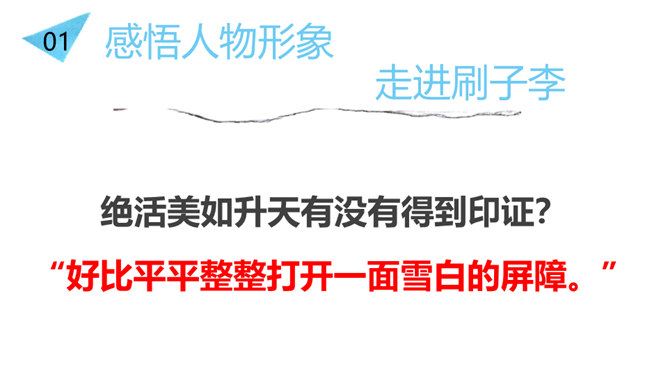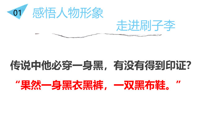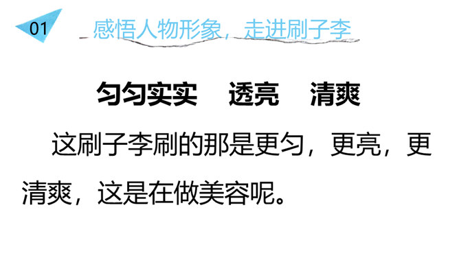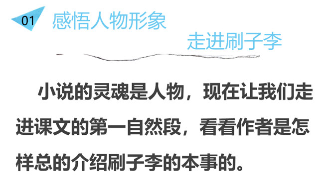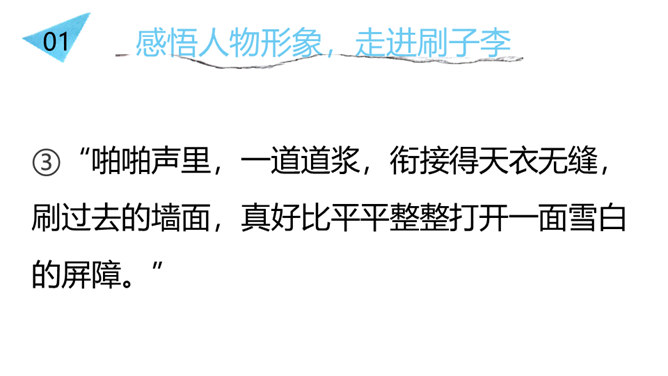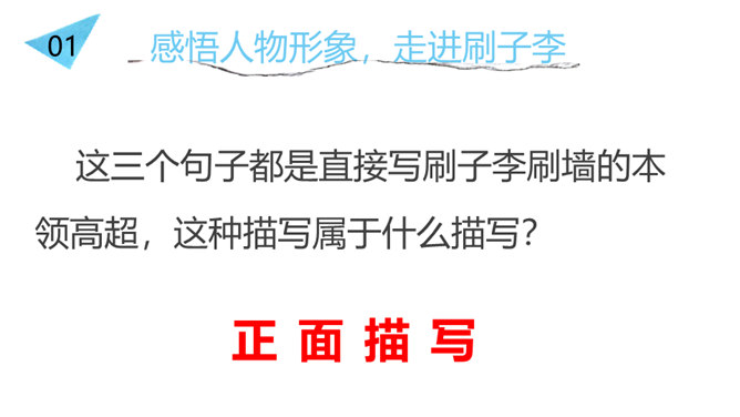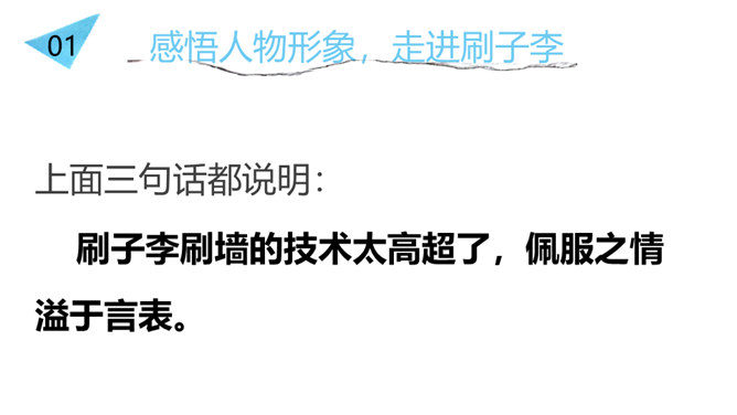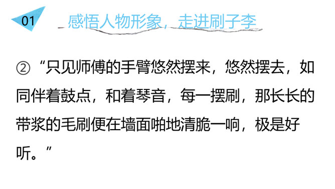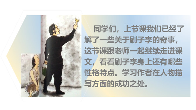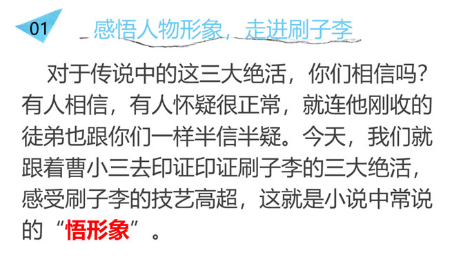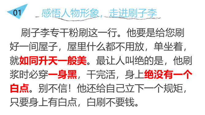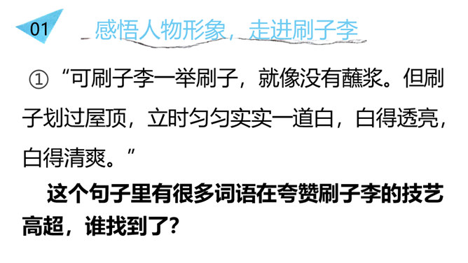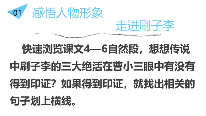 同学们,上节课我们已经了解了一些关于刷子李的奇事,这节课跟老师一起继续走进课文,看看刷子李身上还有哪些性格特点。学习作者在人物描写方面的成功之处。小说的灵魂是人物,现在让我们走进课文的第一自然段,看看作者是怎样总的介绍刷子李的本事的。快速浏览课文4—6自然段,想想传说中刷子李的三大绝活在曹小三眼中有没有得到印证?如果得到印证,就找出相关的句子划上横线。所属专题:刷子李ppt。