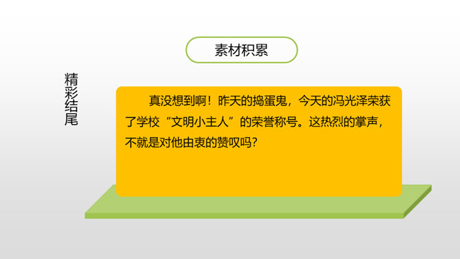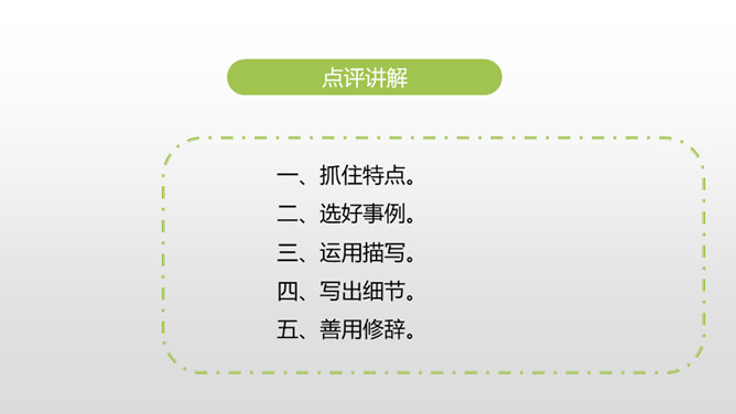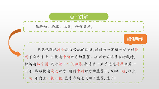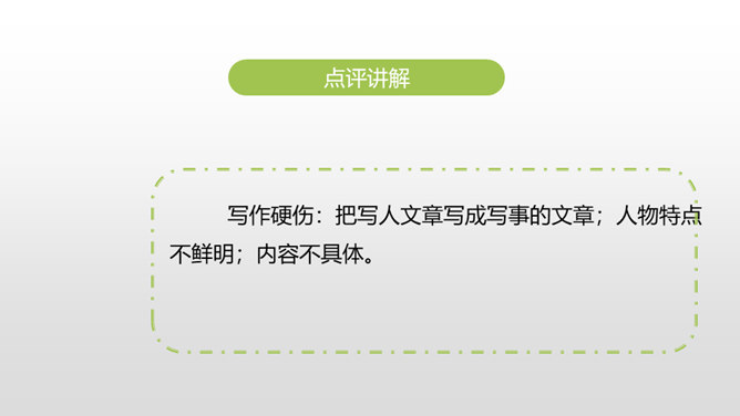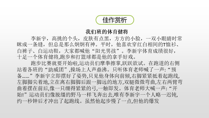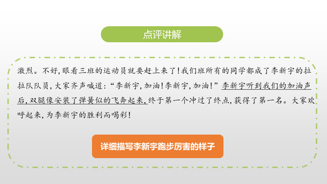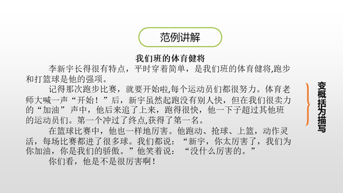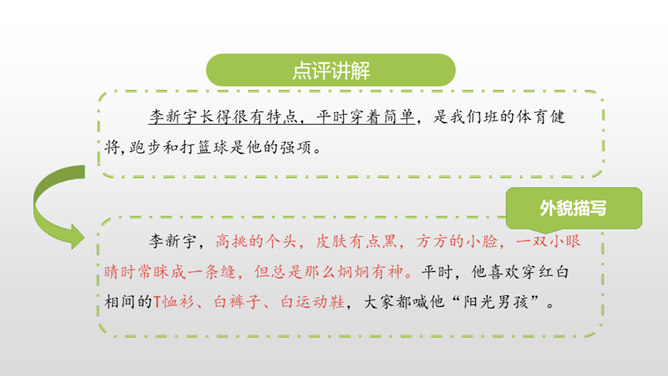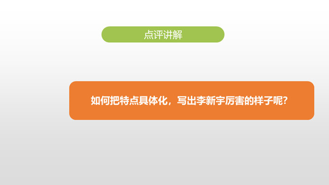 1.叙述有条理,语言通畅,用词准确,学习运用学过的表达方式来书写真情实感。(重点)2.培养学生养成乐于观察、善于观察的好习惯。(难点)同学们,上节课通过讨论学习,我们知道人物可以通过肖像描写、动作描写、心理描写、语言描写来刻画。这节课,我们继续学习。写作硬伤:把写人文章写成写事的文章;人物特点不鲜明;内容不具体。如何把特点具体化,写出李新宇厉害的样子呢?所属专题:把一个人的特点写具体ppt。