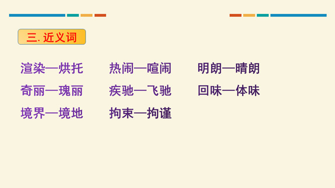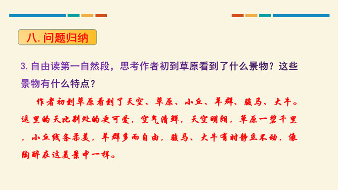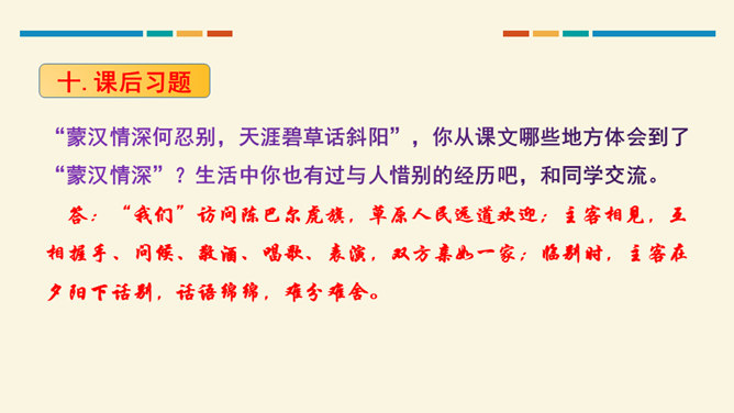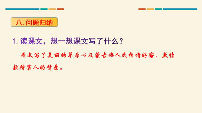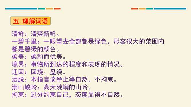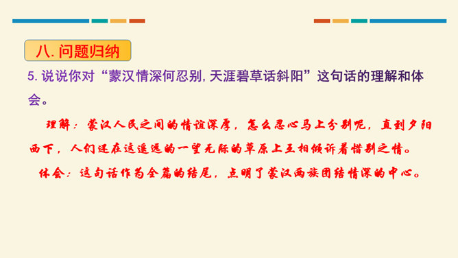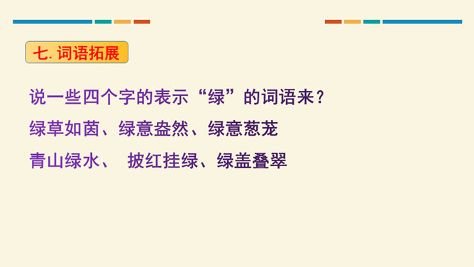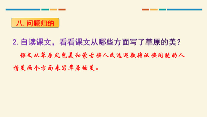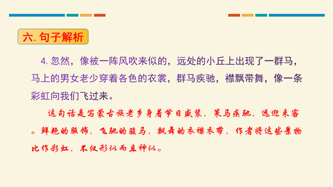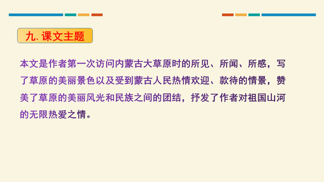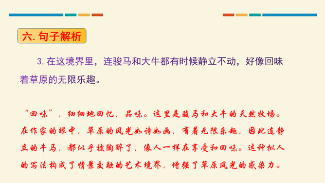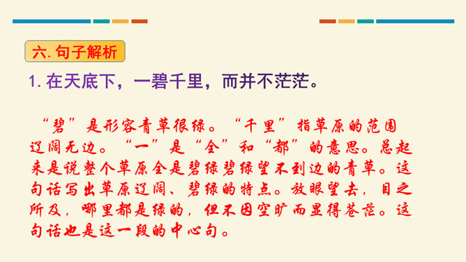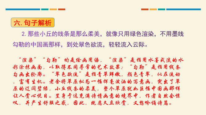 碧”是形容青草很绿。“千里”指草原的范围辽阔无边。“一”是“全”和“都”的意思。总起来是说整个草原全是碧绿碧绿望不到边的青草。这句话写出草原辽阔、碧绿的特点。放眼望去,目之所及,哪里都是绿的,但不因空旷而显得苍茫。这句话也是这一段的中心句。渲染”“勾勒”均是绘画用语,“渲染”是指用水墨或淡的水彩涂抹画面,以取得不同寻常的艺术效果;“勾勒”是指用线条勾画出轮廓。“翠色欲流”是指青草鲜嫩,颜色青翠,似在流动,富有生机。老舍将草原拟为一幅挥毫泼洒的写意画,突出了草原的辽阔碧绿,小丘线条的柔美。所属专题:草原ppt。