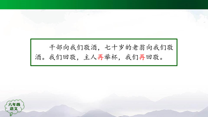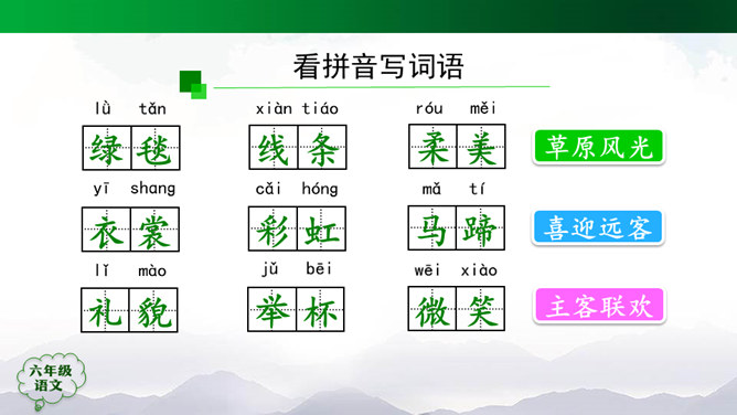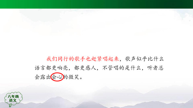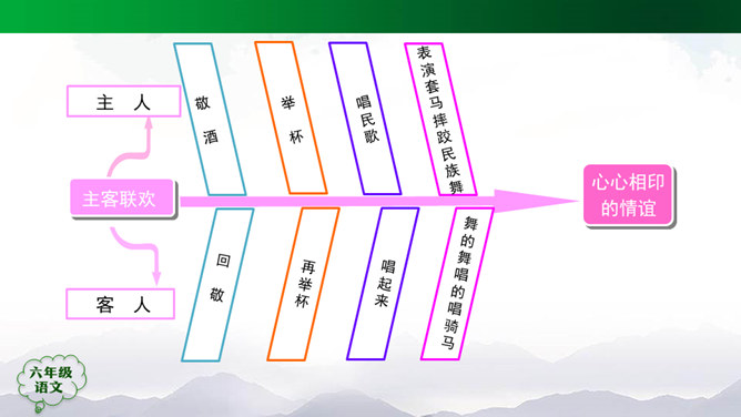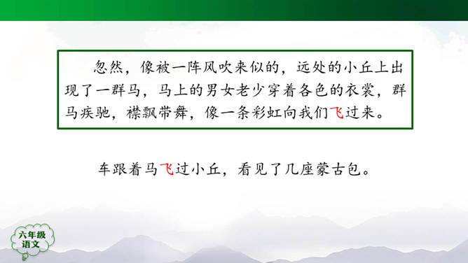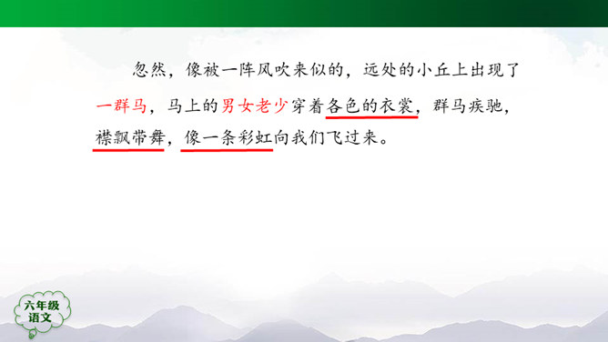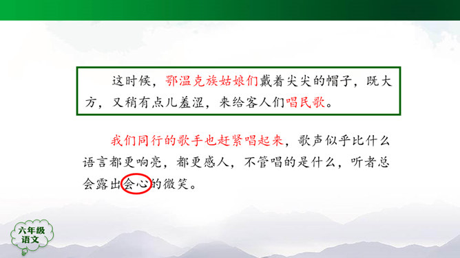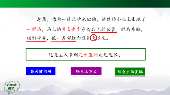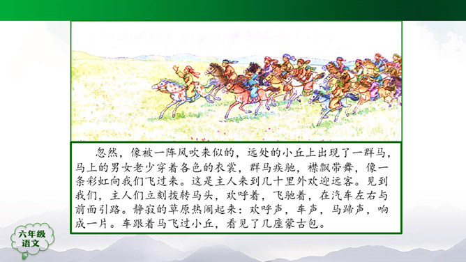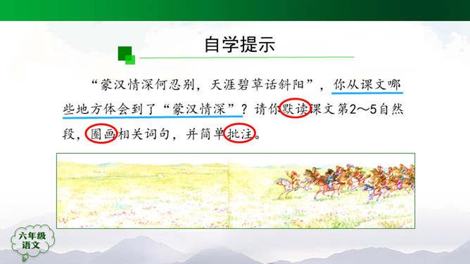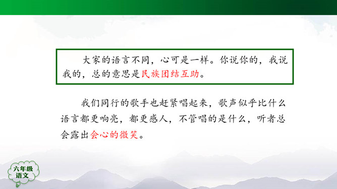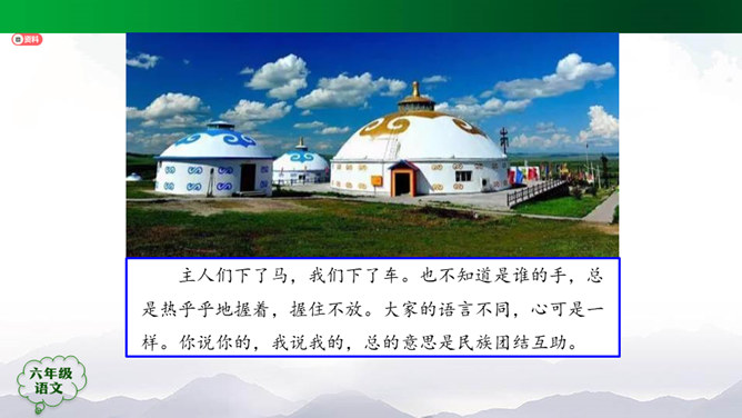 “蒙汉情深何忍别,天涯碧草话斜阳”,你从课文哪些地方体会到了“蒙汉情深”?请你默读课文第2~5自然段,圈画相关词句,并简单批注。 大家的语言不同,心可是一样。你说你的,我说我的,总的意思是民族团结互助。此时此刻,如果你置身其中,感受如何?生活中你也有过与人惜别的经历吧,和同学交流。1.有感情地朗读课文,边读边想象画面。2.小练笔:写一写生活中你与人惜别的经历。所属专题:草原ppt。
